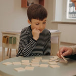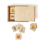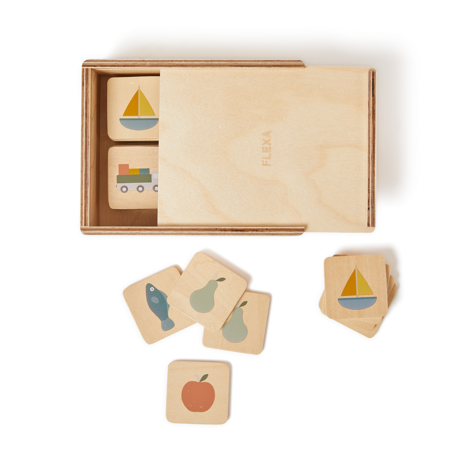 With this Wooden Memory Game you help your child develop great memory and matching skills while expanding your child’s vocabulary. The game consists of 36 wooden pieces with illustrations from everyday life. Try telling each other stories based on the images or group the pieces into categories – all the animals together, all the fruits together, and so on. When it’s time to tidy up, gather the pieces in the wooden storage box. On the side of the box, we’ve put illustrations of the content, so it’s easy for both children and grown-ups to see what’s inside the box.