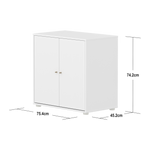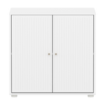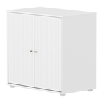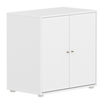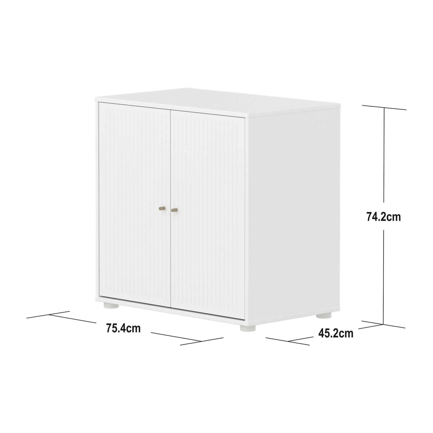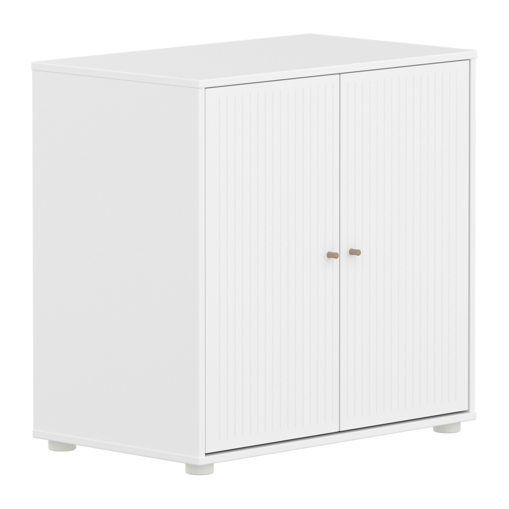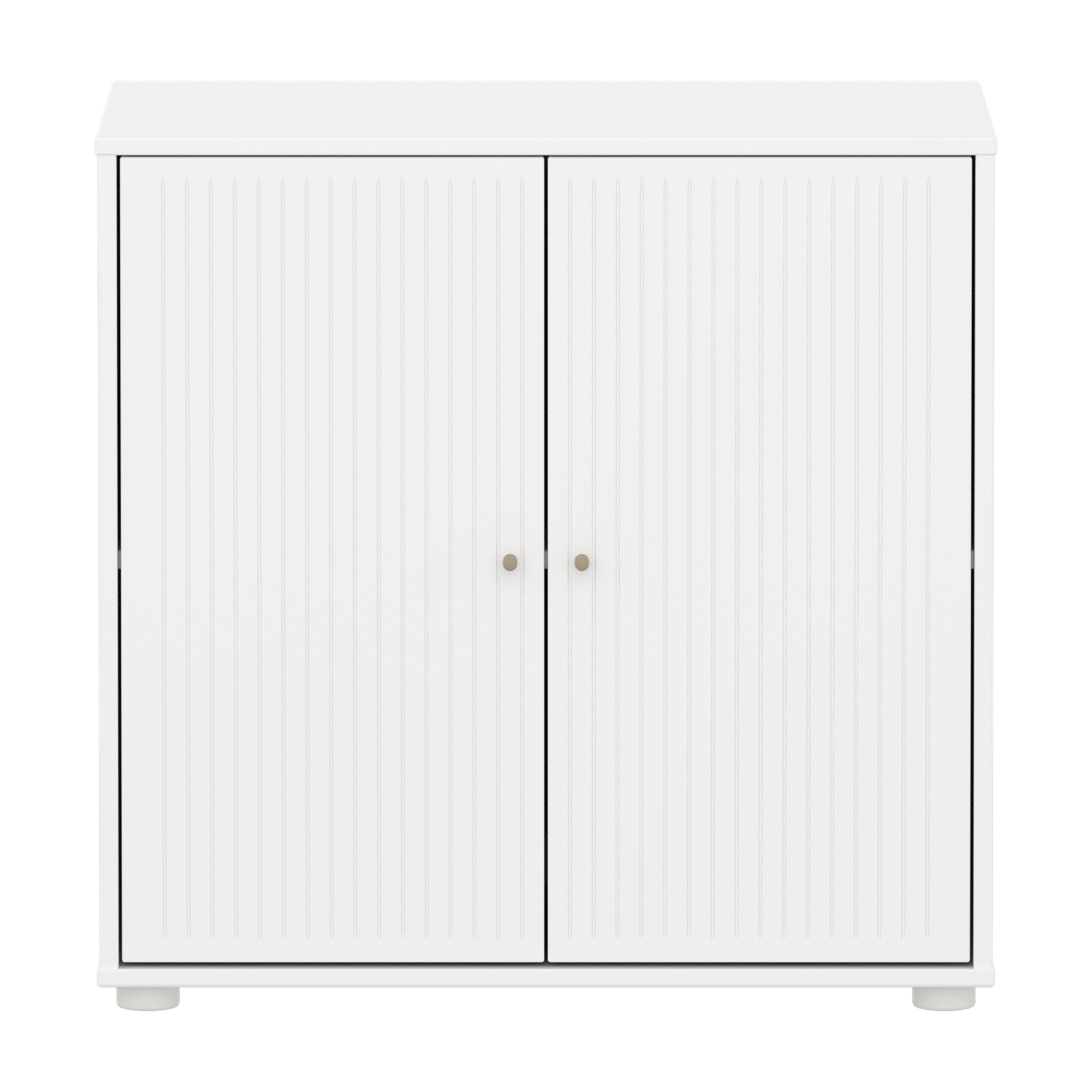 The FLEXA SAGA Cupboard in full white with grooved fronts features 1 adjustable shelf and 2 doors with soft-close to protect little fingers. The round oat metal knobs add a clean, simple look. The cupboard with plastic feet can be placed under our mid-high beds.