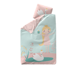 Little Princess sengelinned med print af en svane og prinsesse på forsiden og mønster på bagsiden.