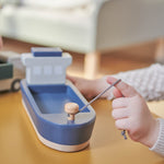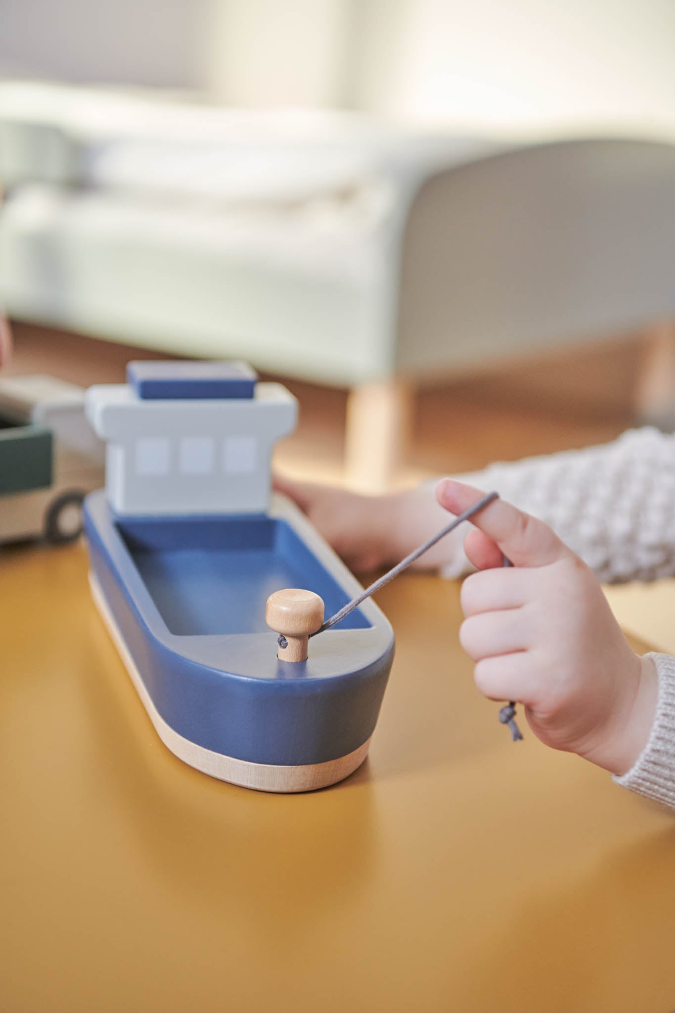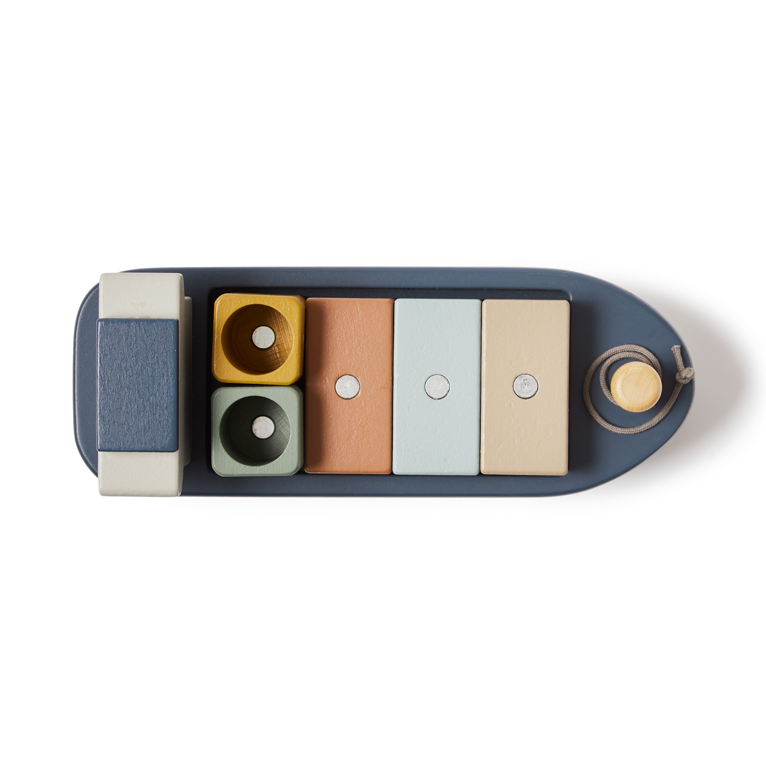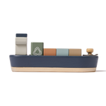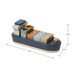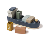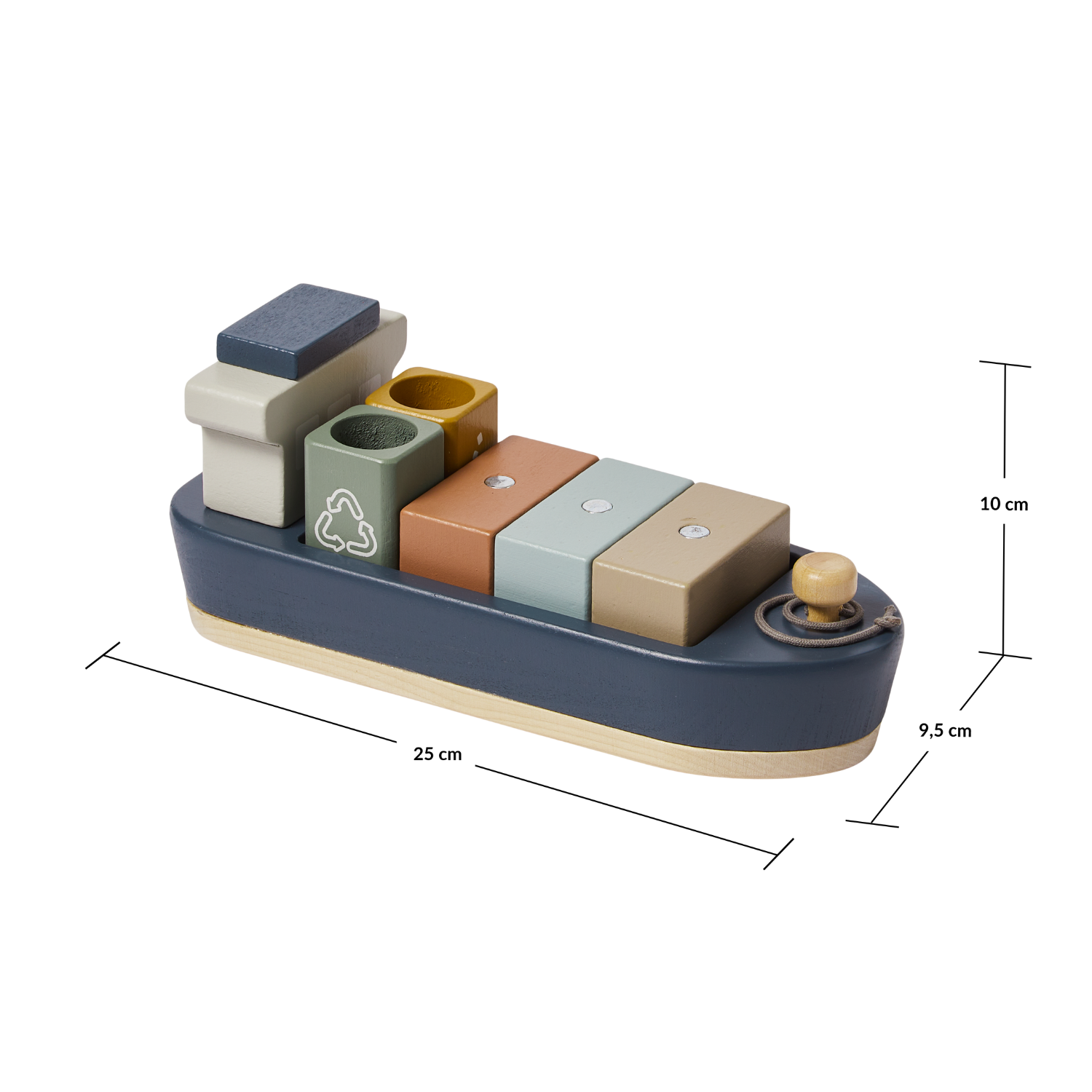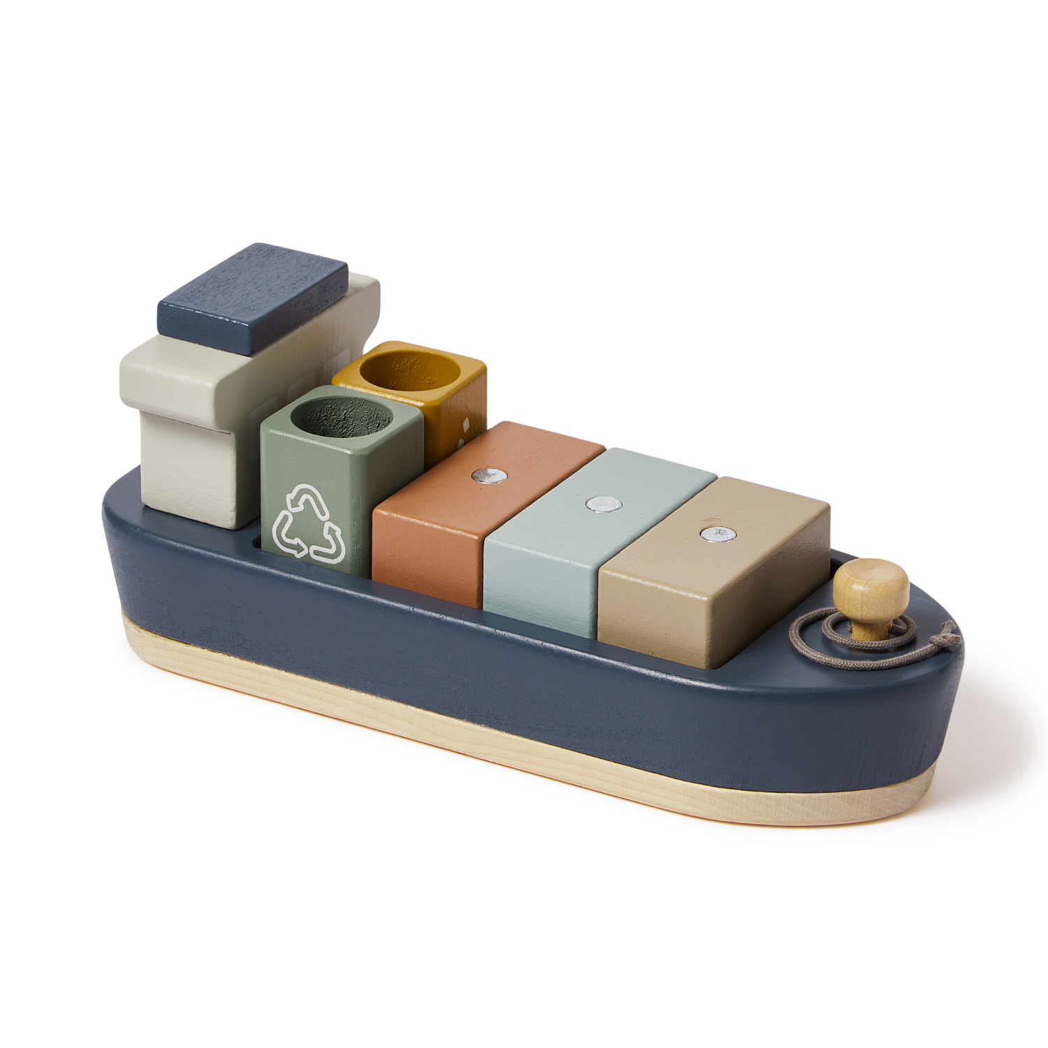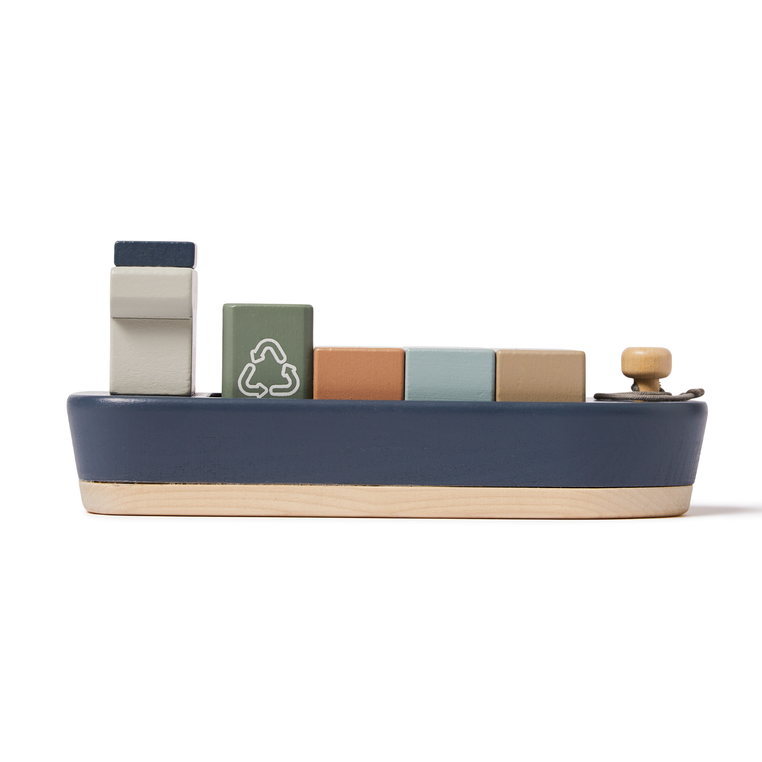 Dette solide containerskib af træ er designet til at stimulere dit barns fantasifulde leg og samtidig forbedre dets finmotorik og rumlige bevidsthed. Dit barn kan læsse og organisere fem containere på det store skib og lade som om, det sejler til fjerne lande med sin dyrebare last.