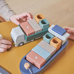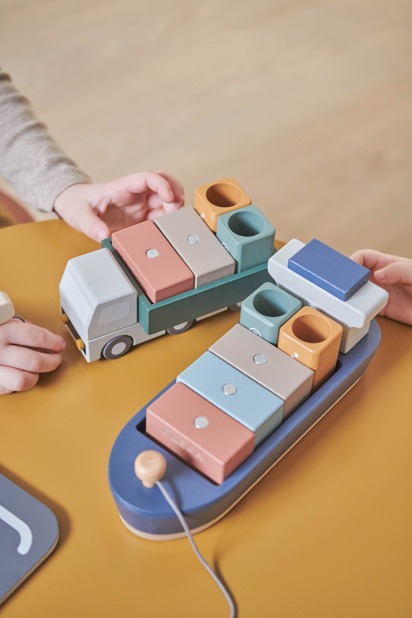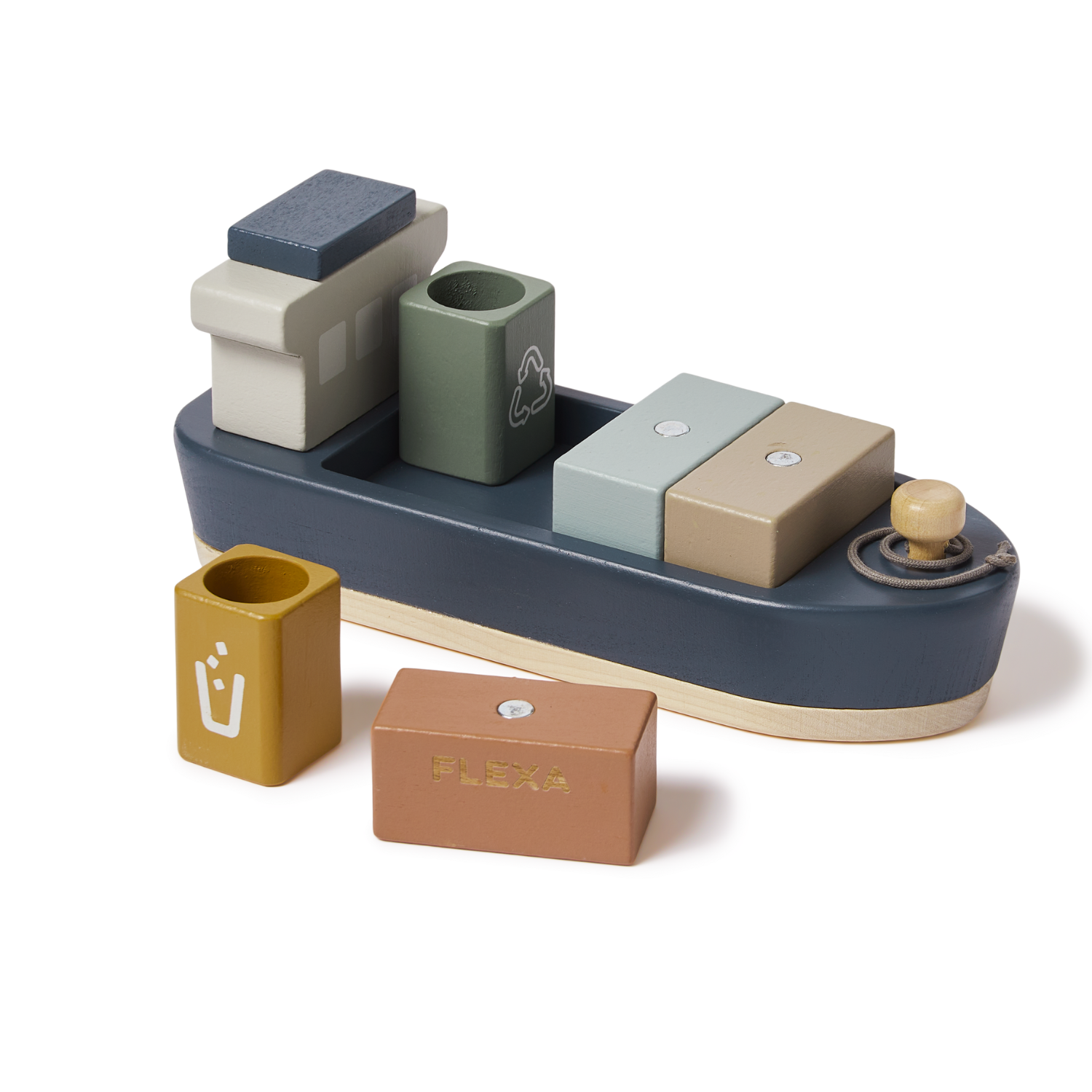 Skibets containere og affaldsspande kan på- og aflæsses med en magnet. Kombinér containerskibet med FLEXAs lastbil- og kransæt for at hjælpe dit barn med at forstå konceptet infrastruktur og kende forskel på at rejse til lands og til vands.