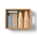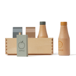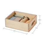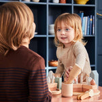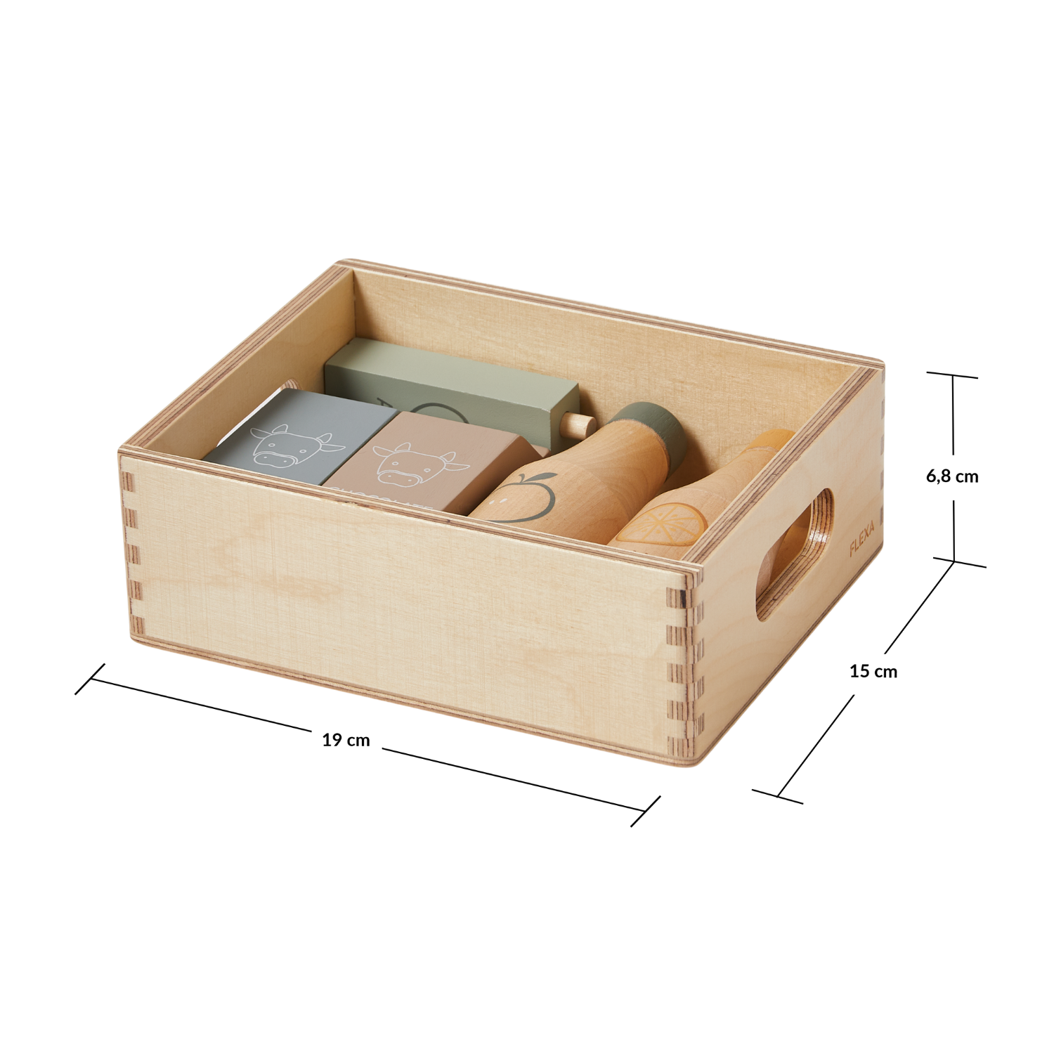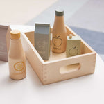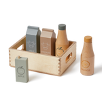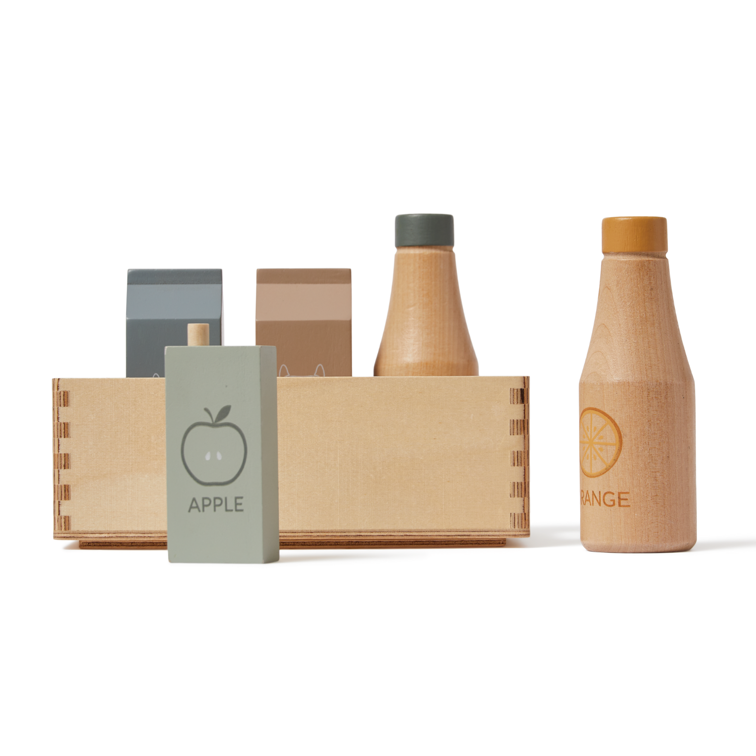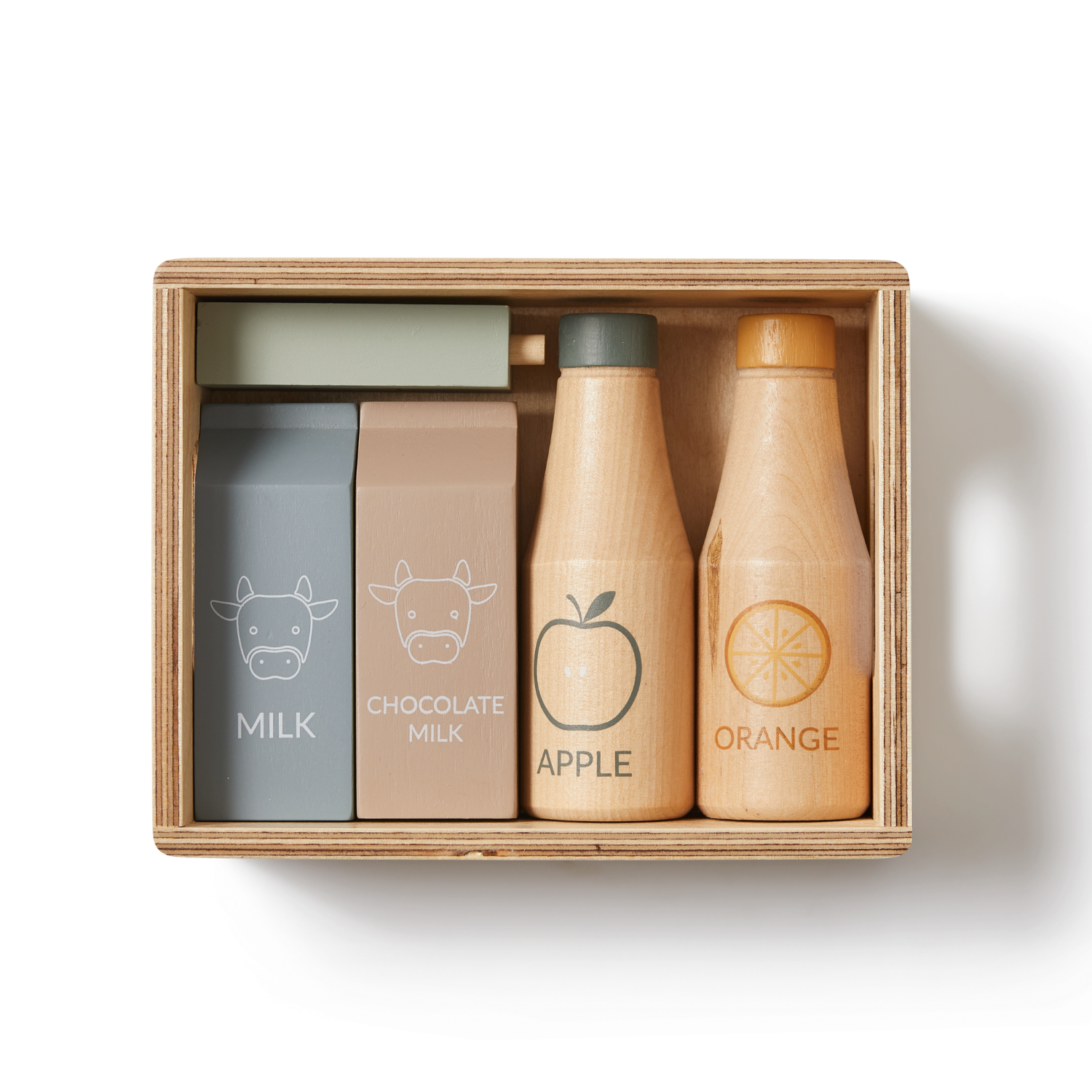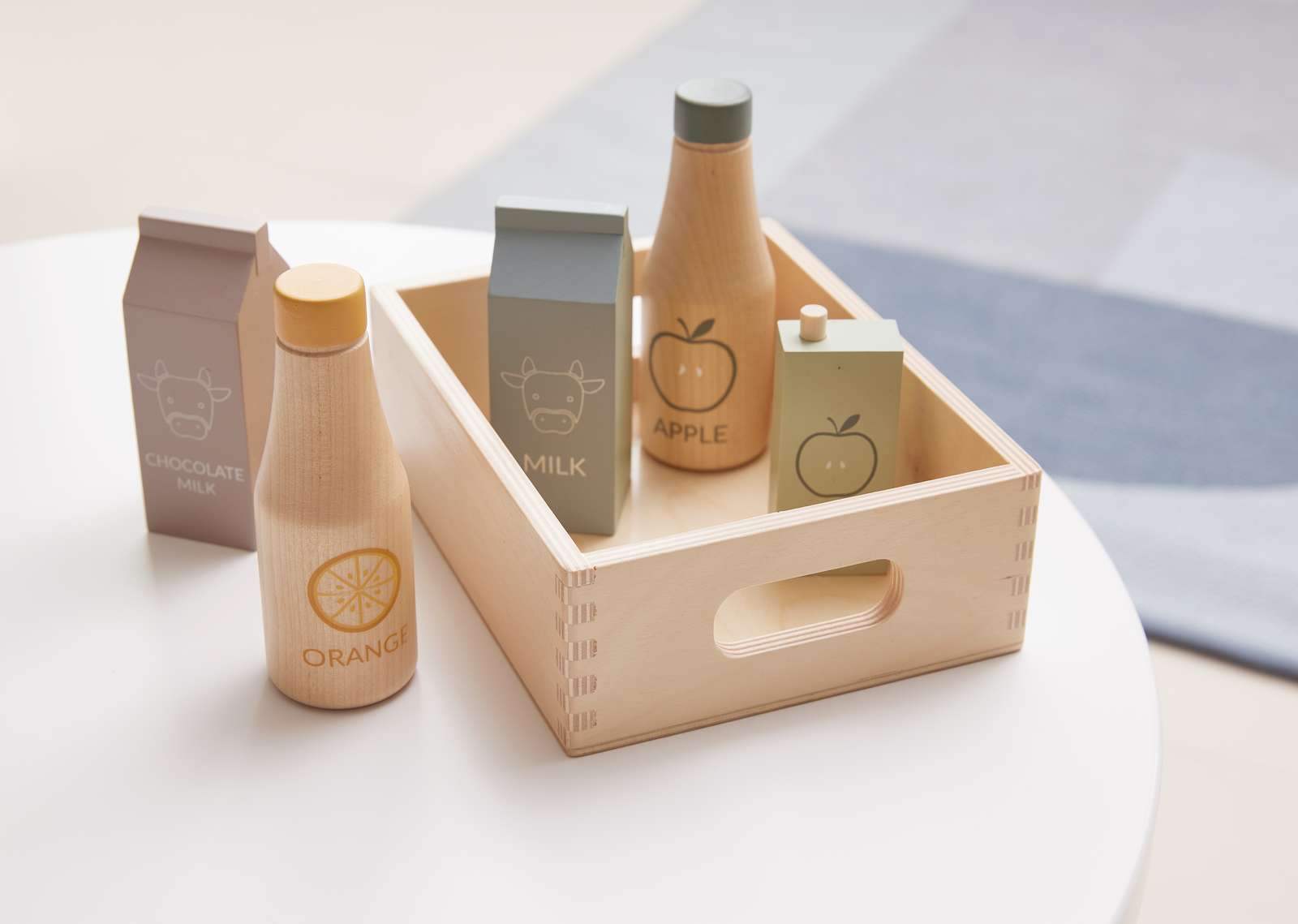 Trækassen med legemad indeholder fem varer: Mælk, kakaomælk, appelsinjuice, en flaske æblejuice og en lille brik æblejuice. Kun det bedste er godt nok til dit barn, og derfor fremstiller vi legetøj af massivt, naturligt træ og tester vores produkter regelmæssigt.