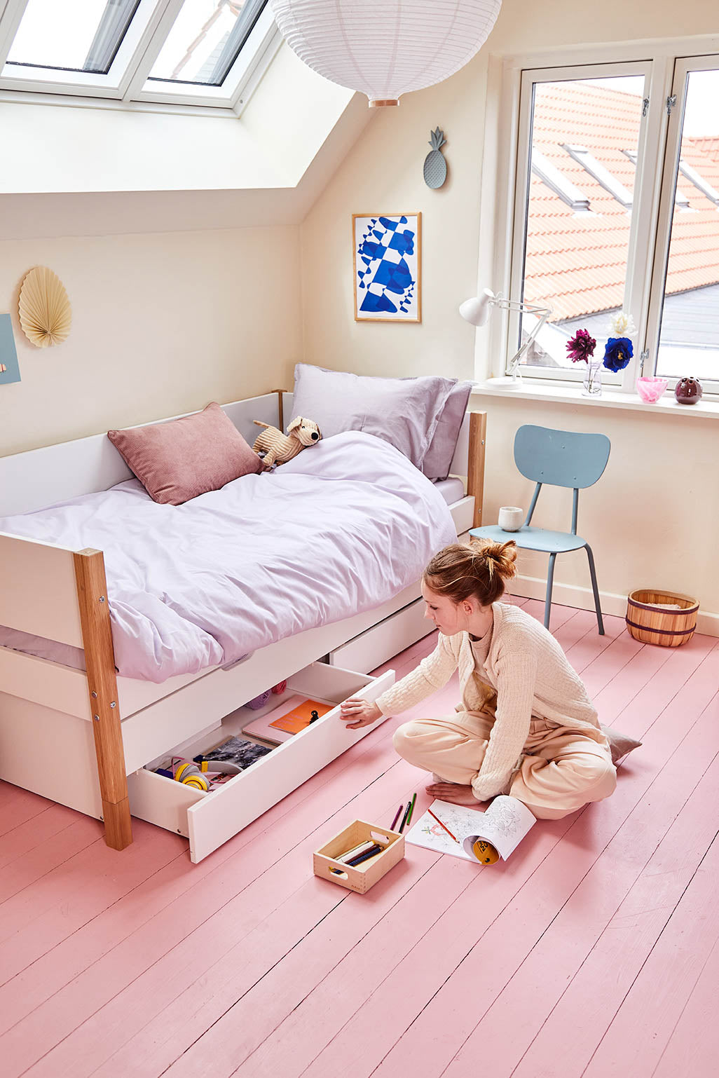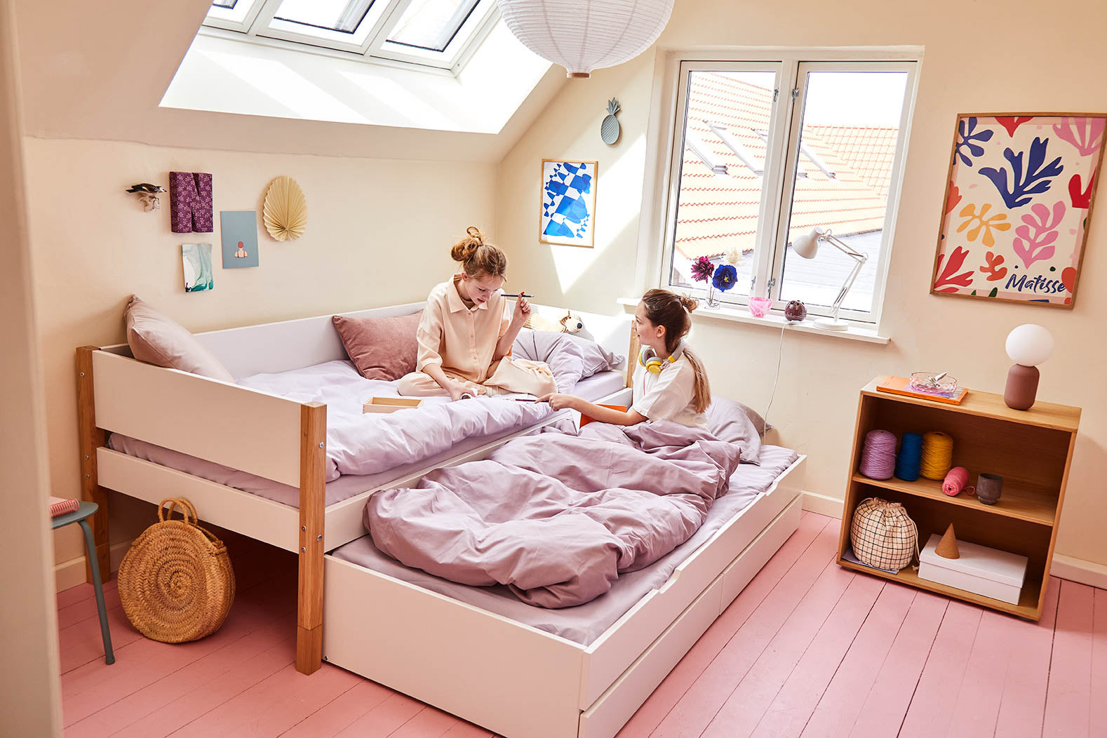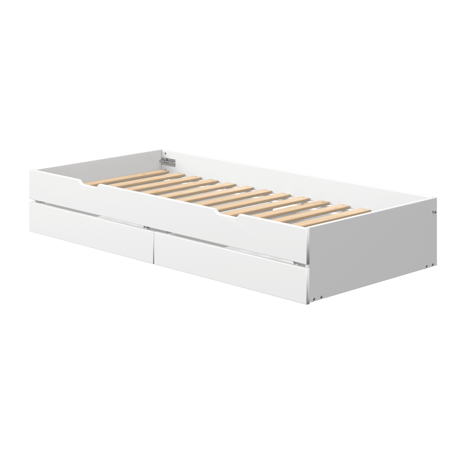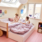 Das Unterschiebebett ist ideal, wenn das Kind über Nacht Besuch von einem Freund hat und ist auch ein schönes Gästebett. In den Unterbett-Schubladen ist Platz für Kinderspielzeug oder Bettwäsche.