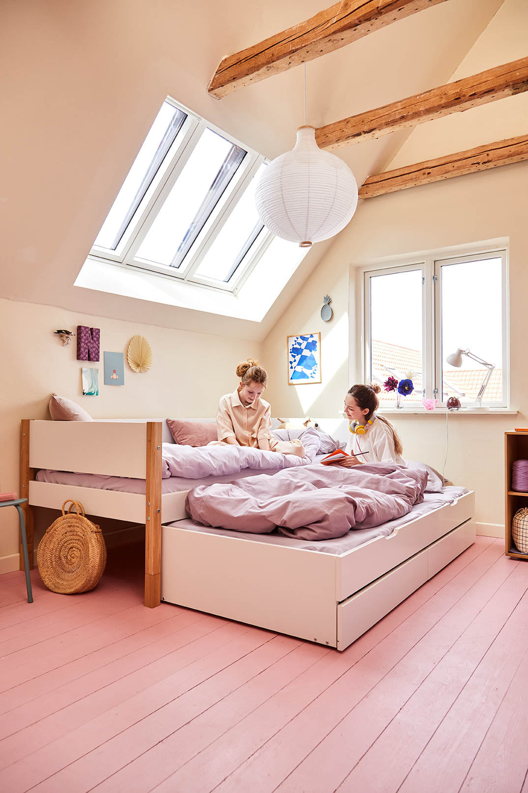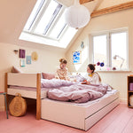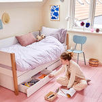 FLEXA Betten begleiten Kinder vom Kleinkind- bis ins Teenageralter – sie lassen sich zu Etagenbetten, Spielbereichen oder Lernplätzen umbauen. Entwickelt für Flexibilität, Langlebigkeit und Nachhaltigkeit.