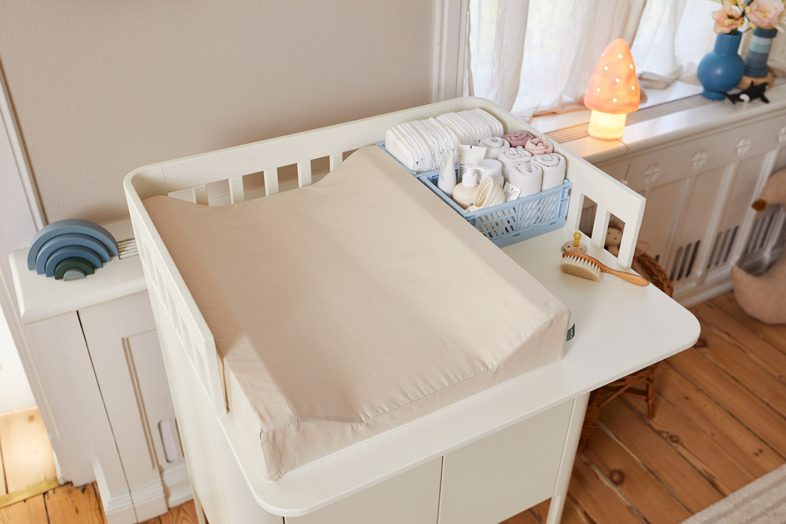Der Bezug aus 100 % Baumwolle hat eine wasserabweisende Beschichtung. Daher ist die Wickelauflage nicht nur sanft zur Haut Ihres Babys, sondern lässt sich auch mühelos reinigen. Sie können den Bezug abnehmen und bei 40 Grad in der Waschmaschine waschen.