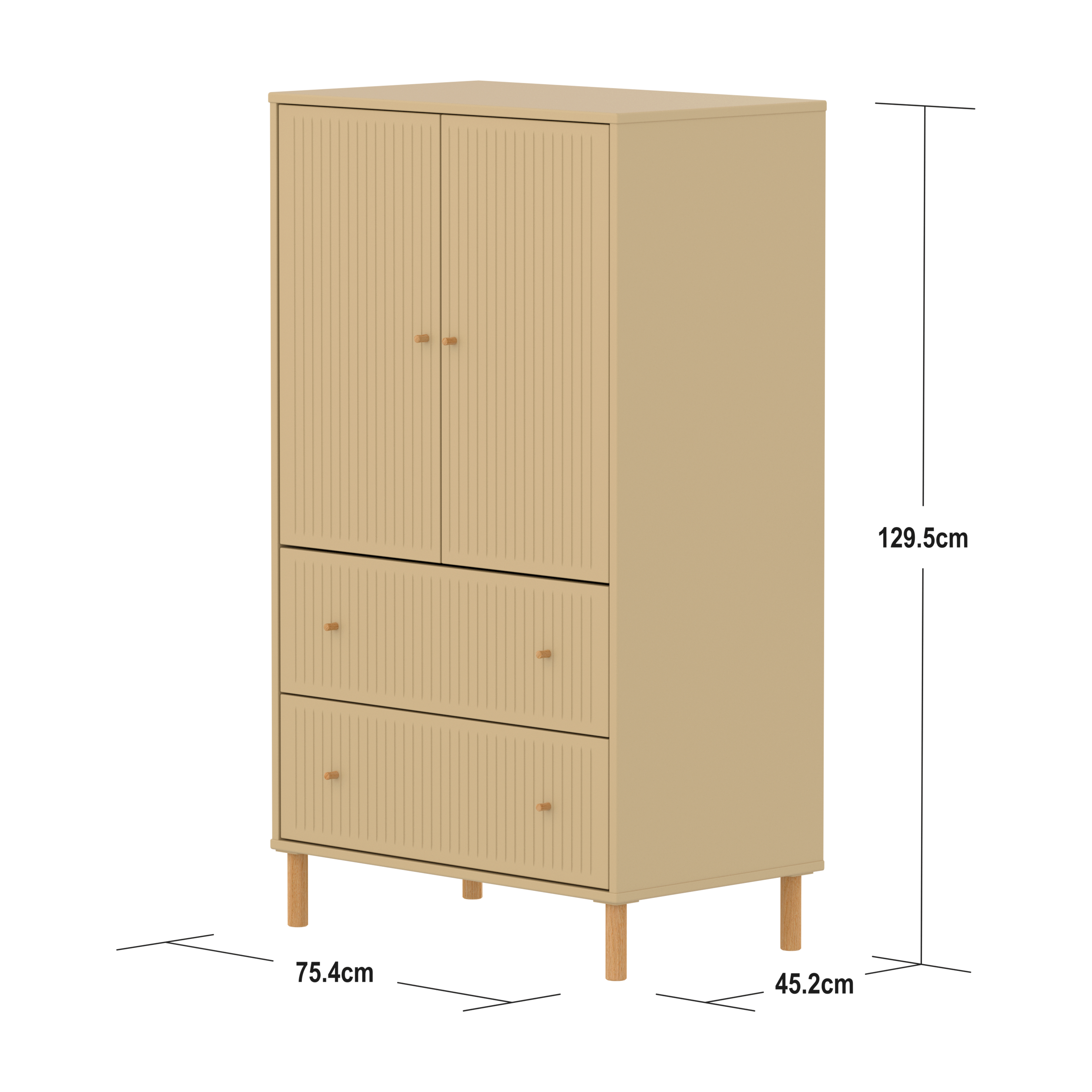 Der Schrank besteht aus widerstandsfähigem, FSC®-zertifiziertem MDF und ist schadstofffrei lackiert, was für Stabilität und Langlebigkeit sorgt. Wählen Sie zwischen Füßen in Eiche oder Kunststofffüßen – beides ist im Lieferumfang enthalten.