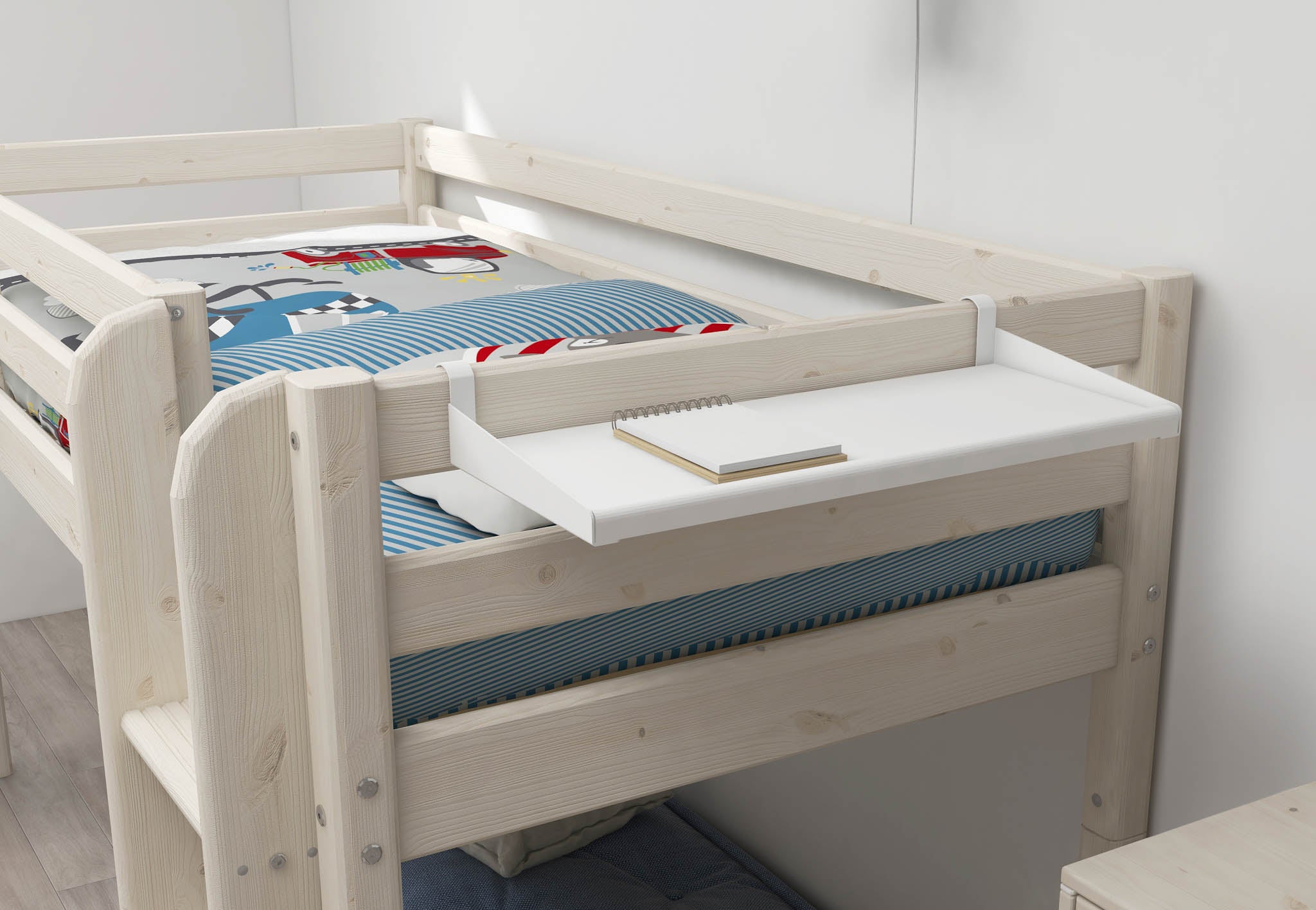 Many FLEXA CLASSIC beds can be adjusted in height, allowing a mid-sleeper to convert into a single bed or a high sleeper. A mid-sleeper with a slide adds play value, while a high sleeper bed creates extra room underneath for storage, a study space, or a play area—helping to optimize bedroom layouts.