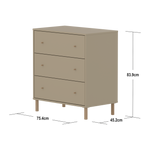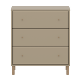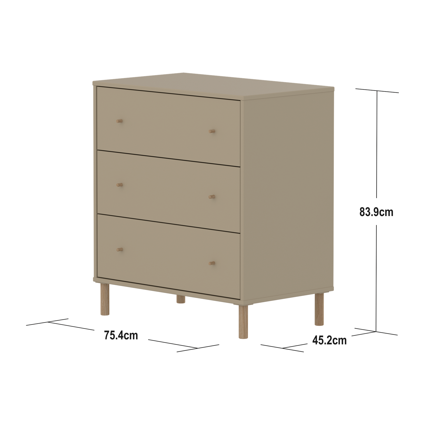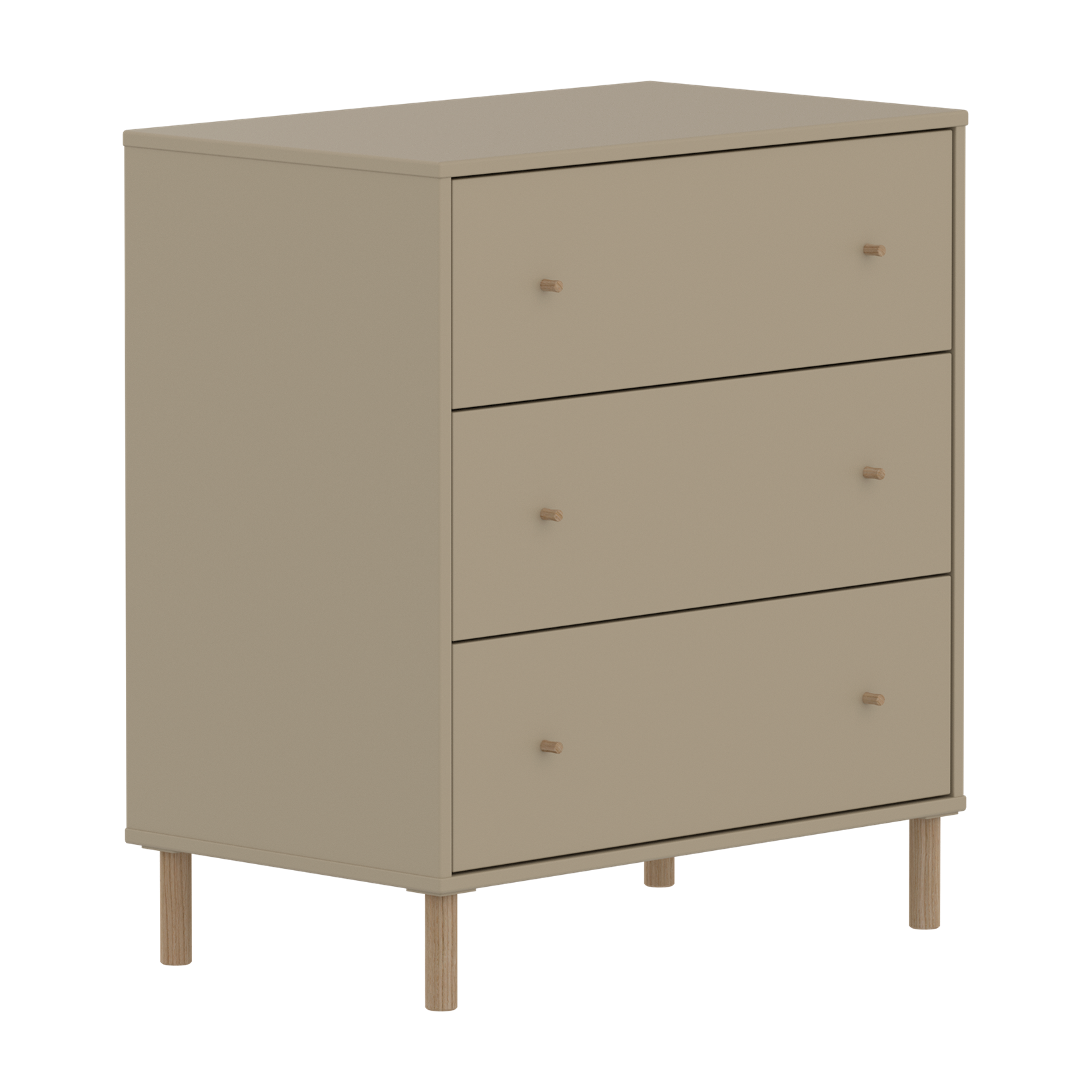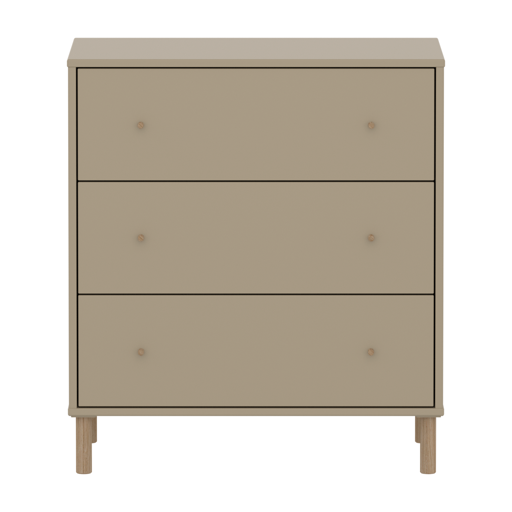 The chest with 3 drawers is made from durable FSC® certified MDF, and the lacquer is free from harmful substances, ensuring both robustness and resistance to wear and tear. Choose between oak legs or plastic feet, both are included in the package.