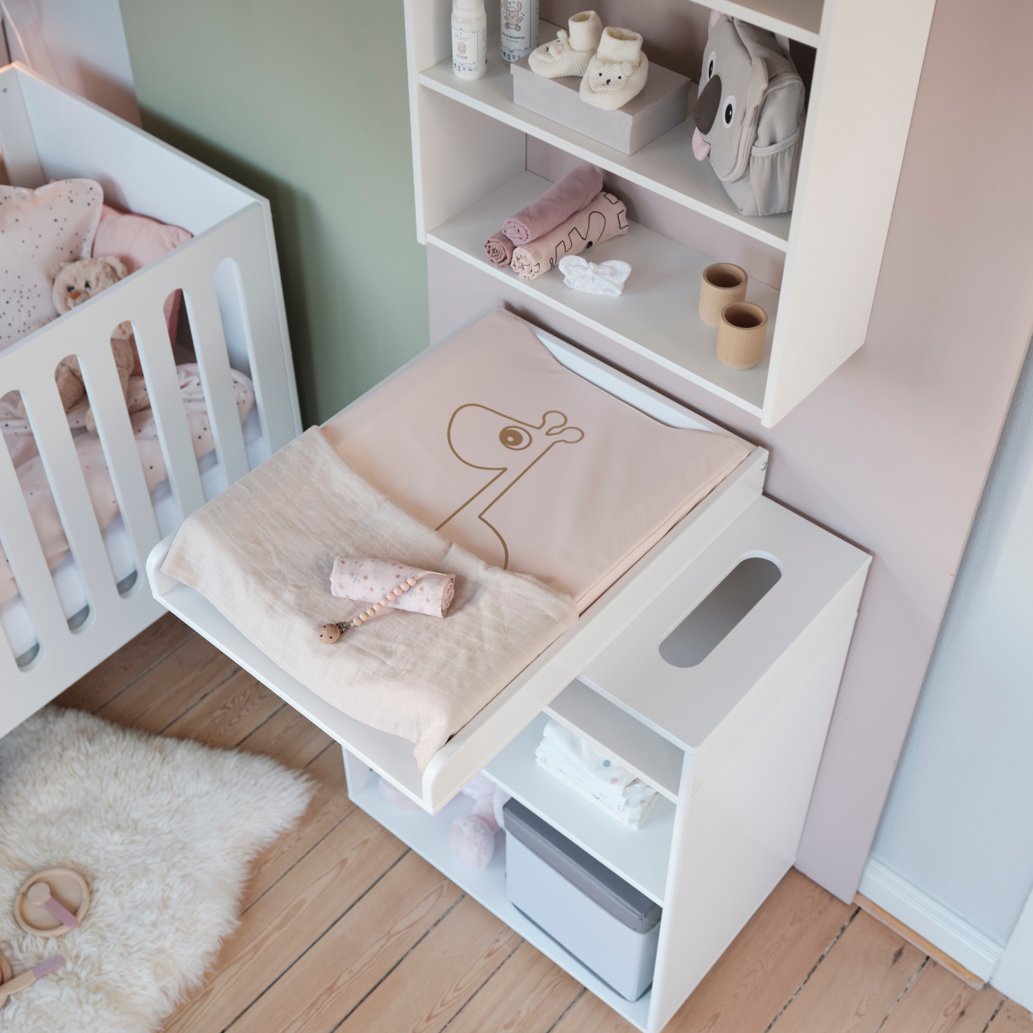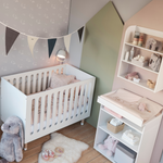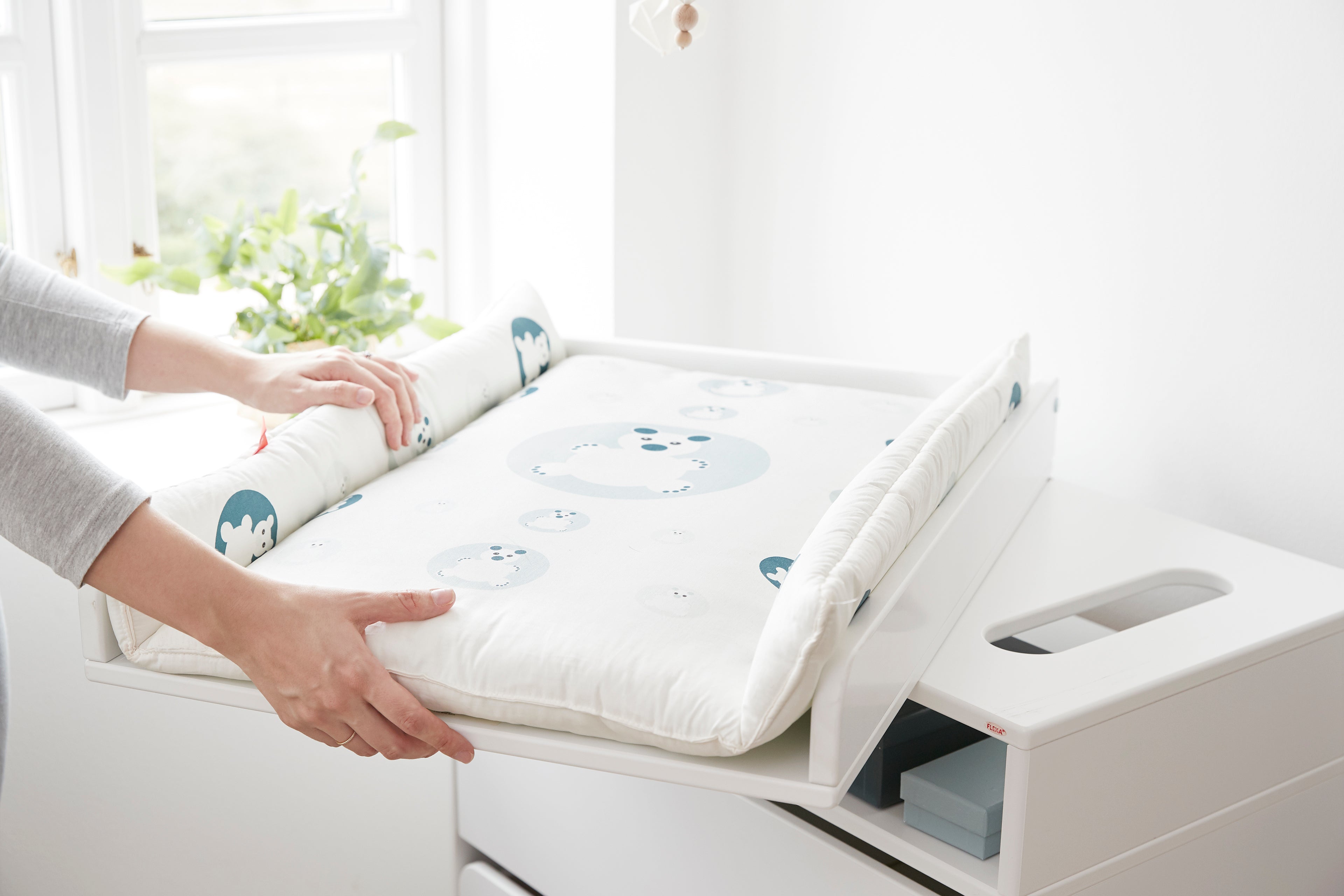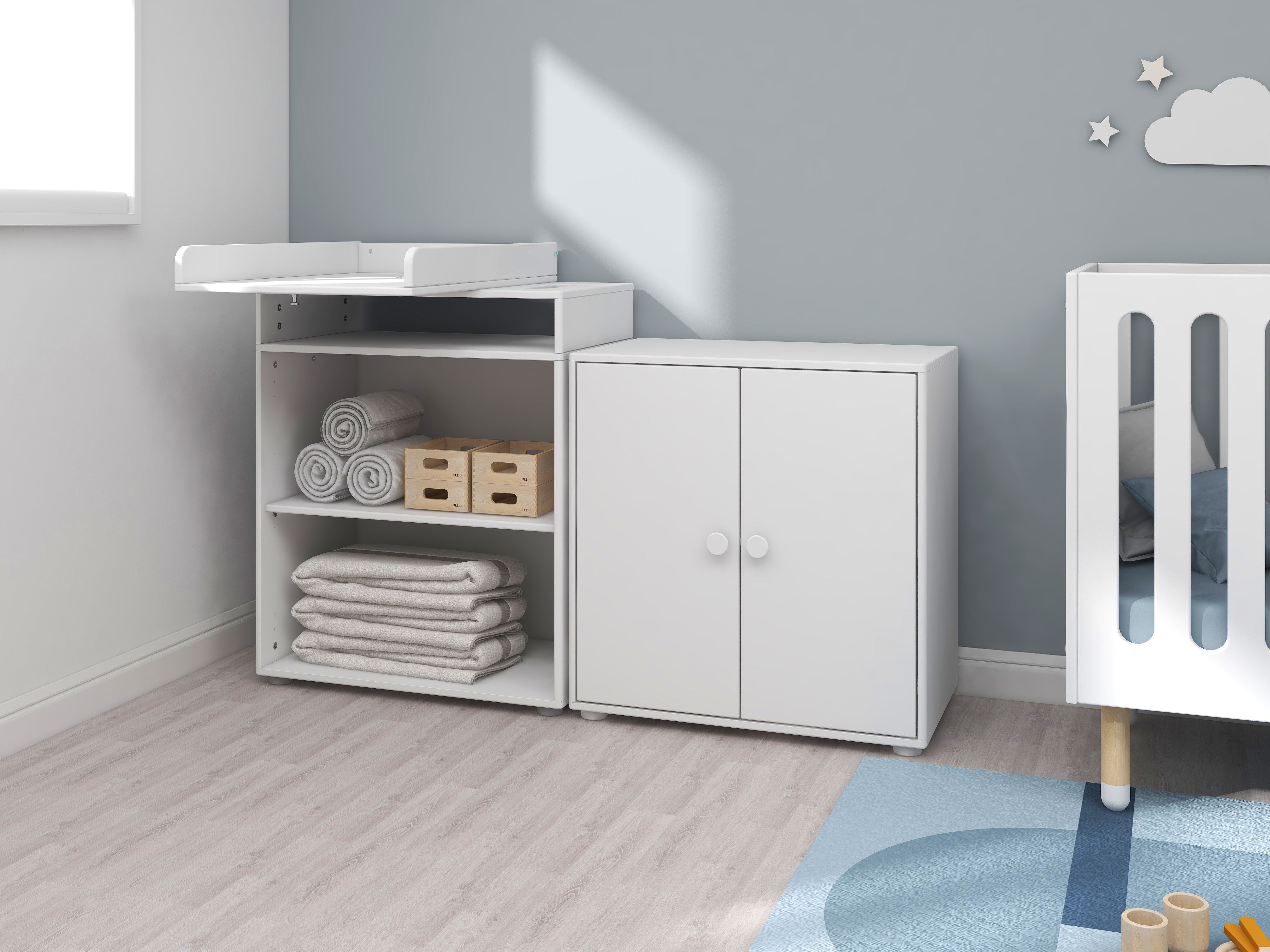 Roomie changing table with one adjustable shelf and many storage solutions. The top of the changing table can be rotated to save space in the room when it's not in use. Underneath the table top you can store accessories out of reach for the baby, but easy to access for mum and dad, to help ensure stress-free diaper changes and cosy bonding time with your little one. Customise the changing table after your needs, and choose between drawers, shelves, or doors. The changing table is easy to clean, and you can even reuse it as storage, just remove the changing top and you have a beautiful piece of storage furniture for the child’s room. The changing table is made of certified MDF and HDF. Check out the full Roomie collection to see all the storage possibilities. - Changing table with one adjustable shelf - The table top can be rotated 90 degrees - Full-coloured with smooth edges - Easy to match with other FLEXA collections - Made from FSC™ certified MDF and HDF - Designed in Denmark