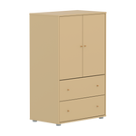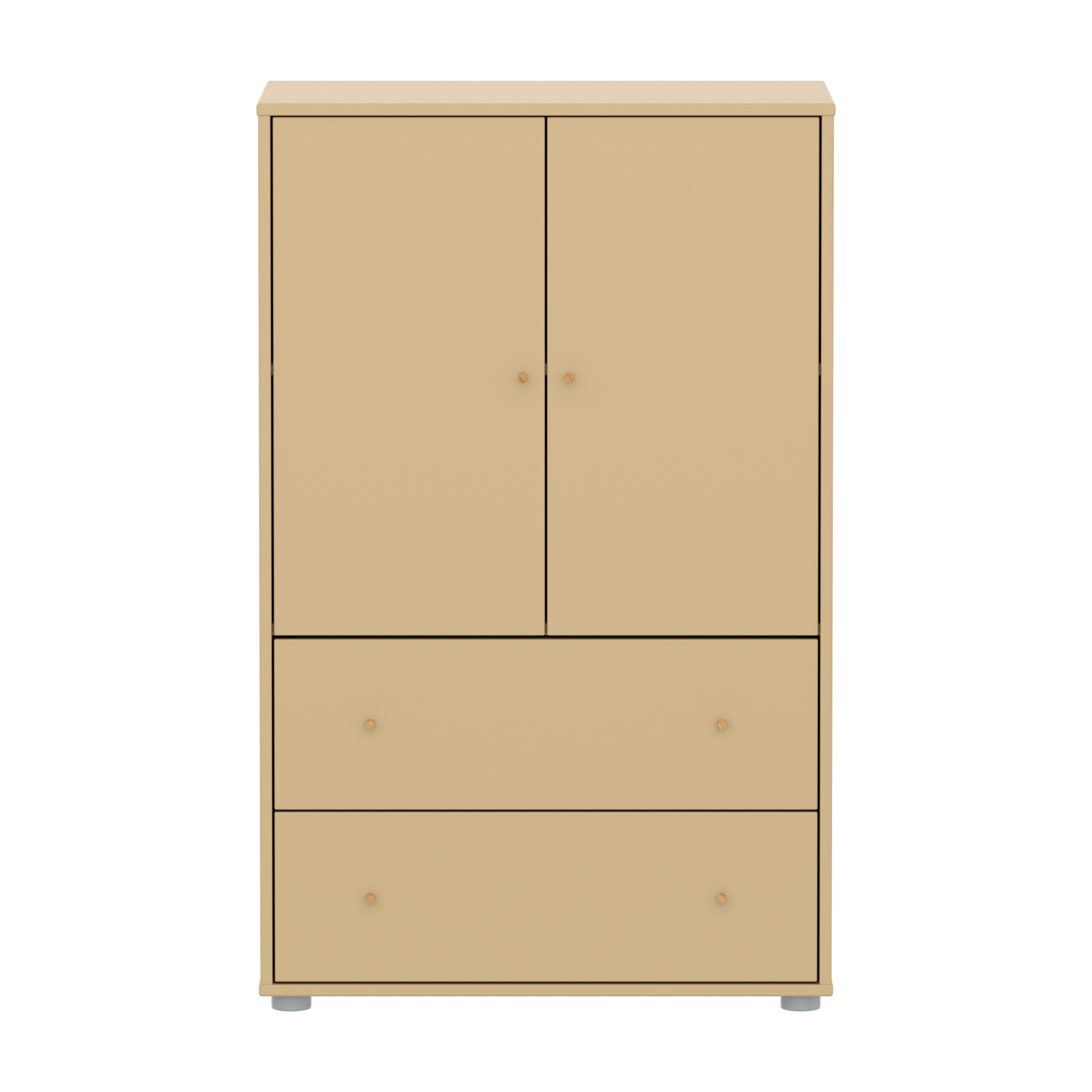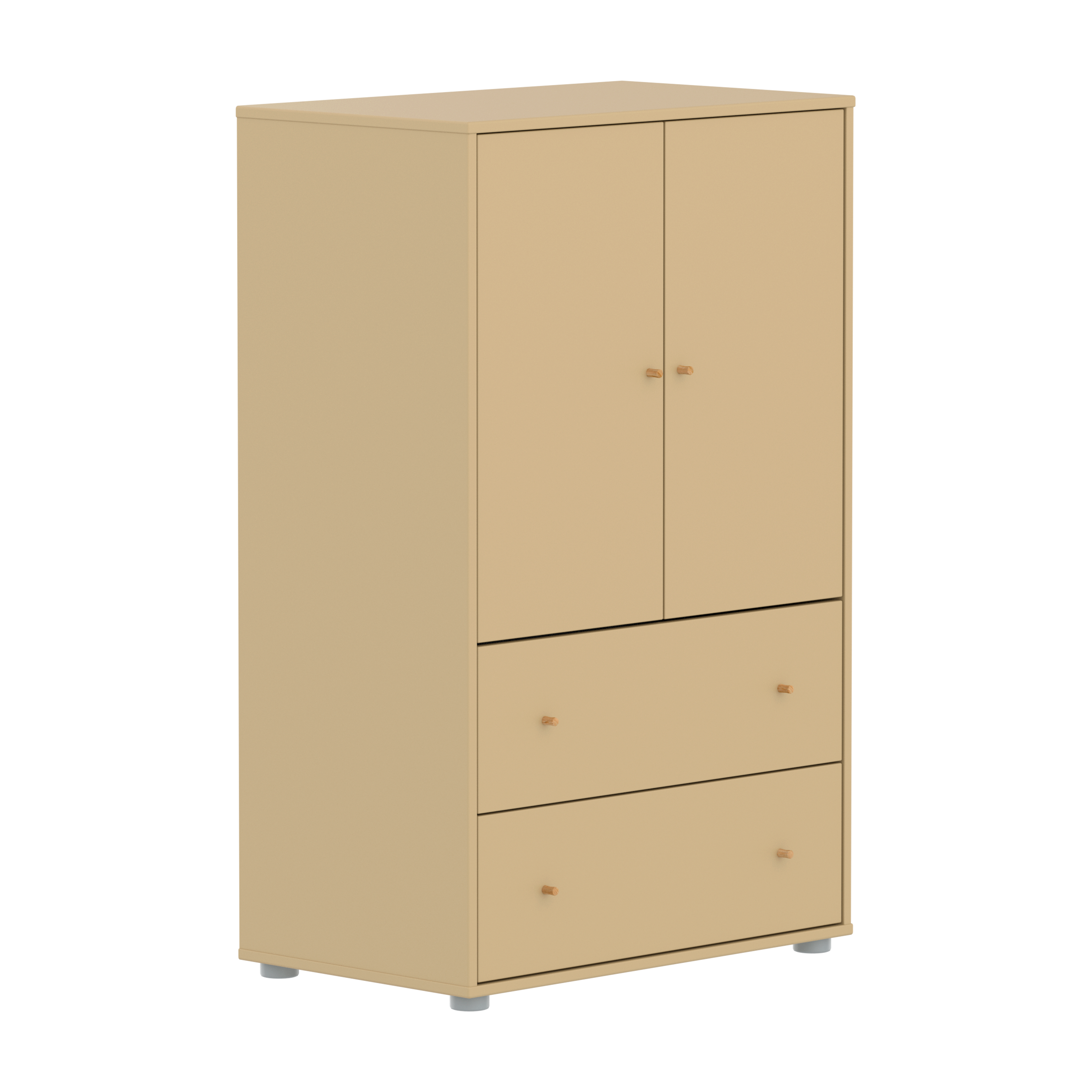 The FLEXA SAGA Cupboard in Sand-colour features 2 doors, 2 drawers, and 1 adjustable shelf. The soft-close doors and drawers ensure safety by protecting little fingers, while the round knobs in oak wood add a simple, refined touch.