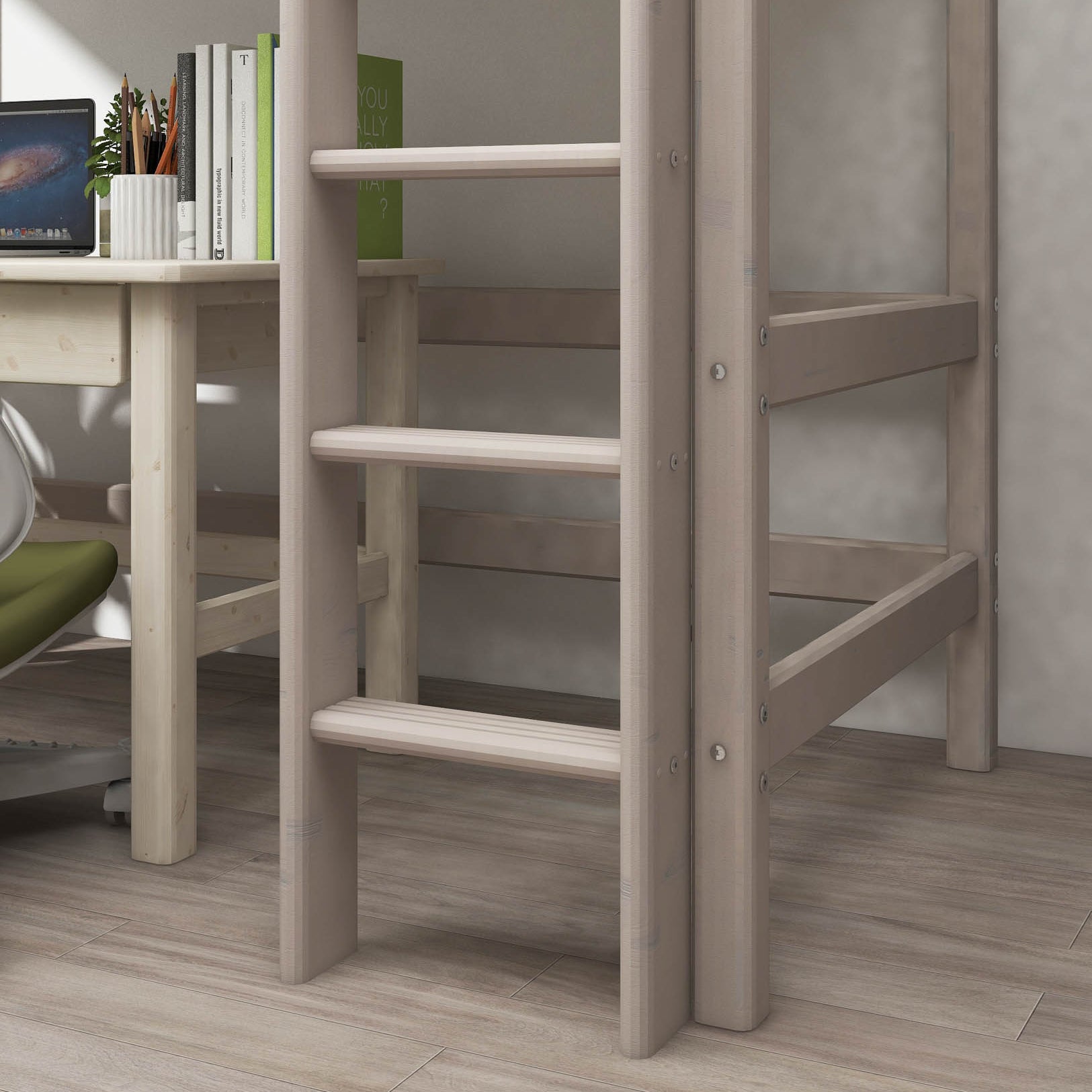 High Bed 184 cm with Safety Rail and Ladder, 90x200 cm, Grey