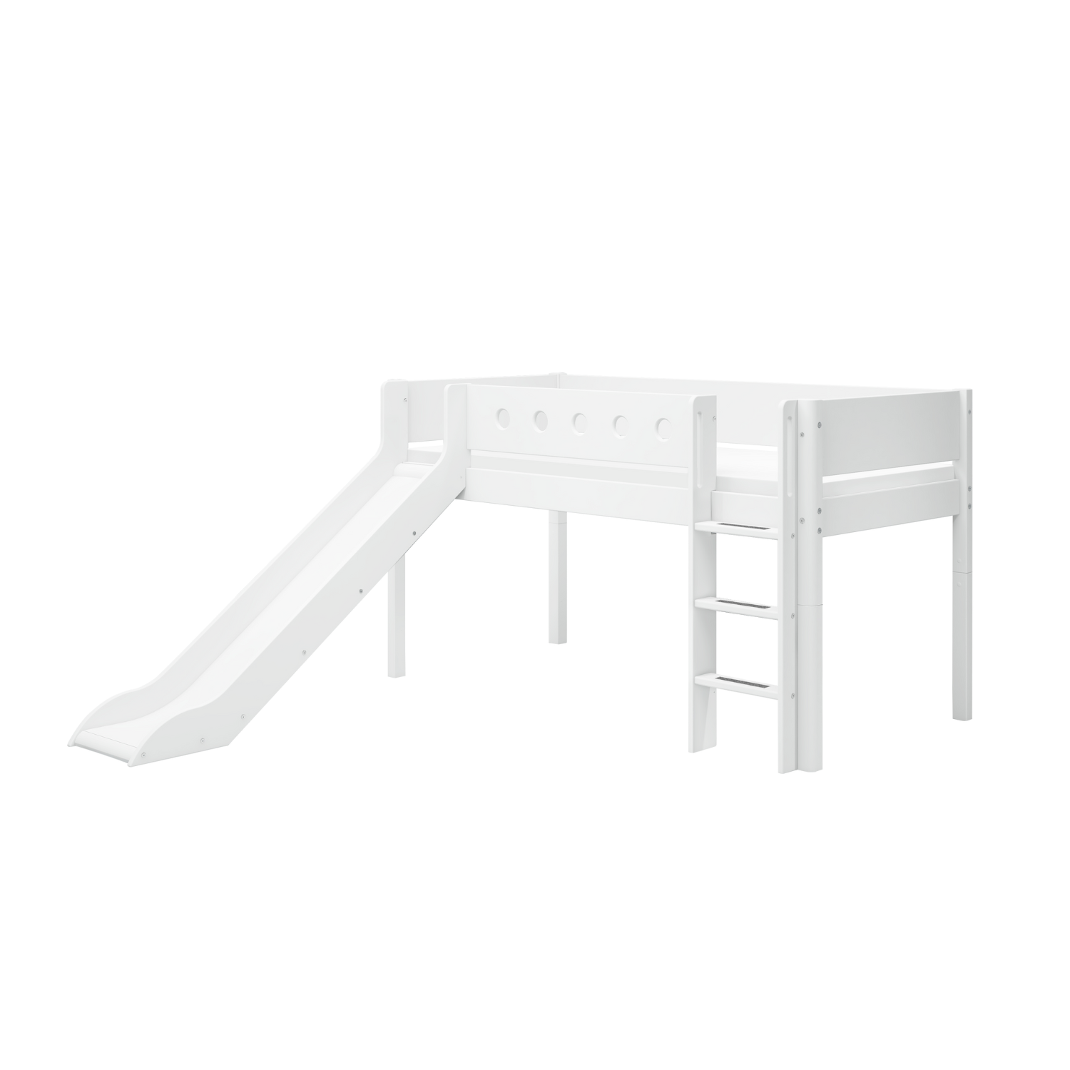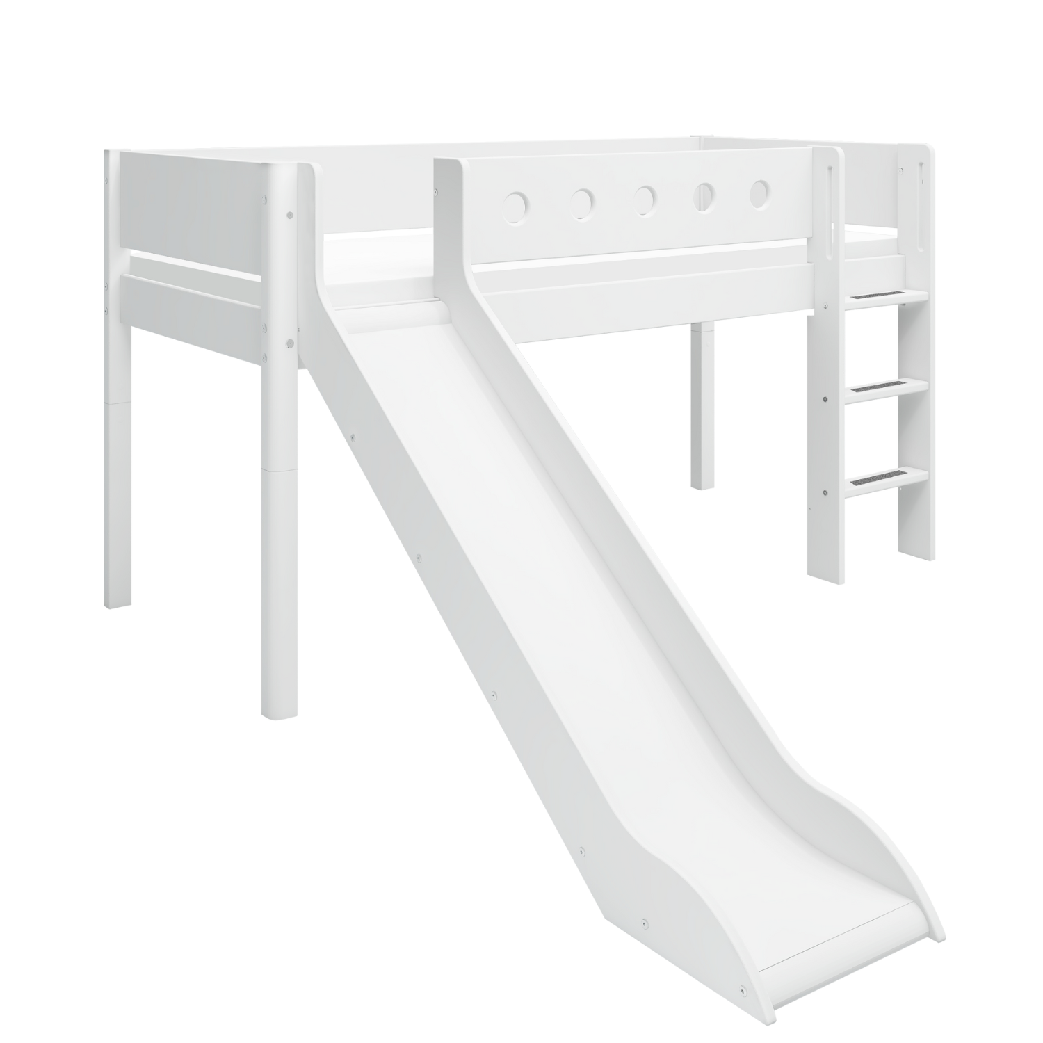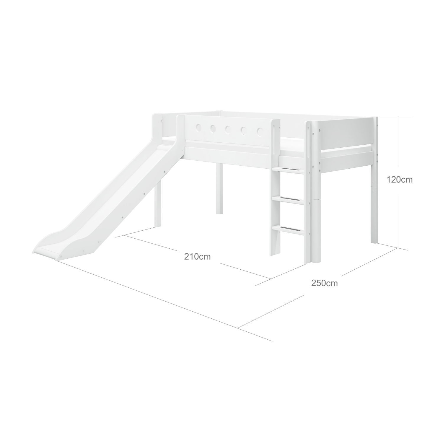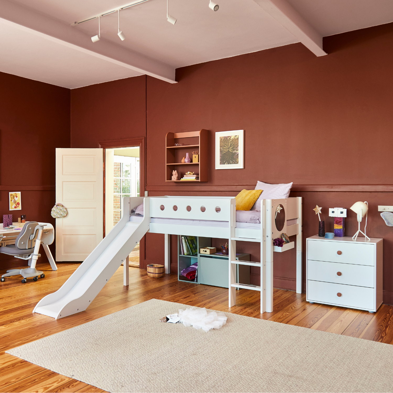 White mid-high bed with straight ladder and slide. The bed, that will turn the child's room into a playground! The ladder has anti-slip steps and integrated handles and can be placed in both ends of the bed - just as the slide. The space underneath midsleeper is perfect for storage. FLEXA textiles enables you to create a private sphere underneath the bed by adding the play curtains. On the bed the cave can be be used. The White grows with the children. By moving the slide and ladder and adding short legs to the midsleeper, you can rebuild the bed into a single bed. And by adding high legs to the bed, you can rebuild the bed to a high bed. The bed is made of high quality MDF and has legs in solid pine. Recommended age: From the age of 6 years.