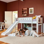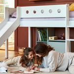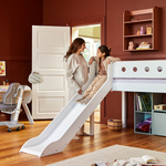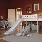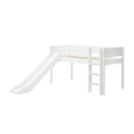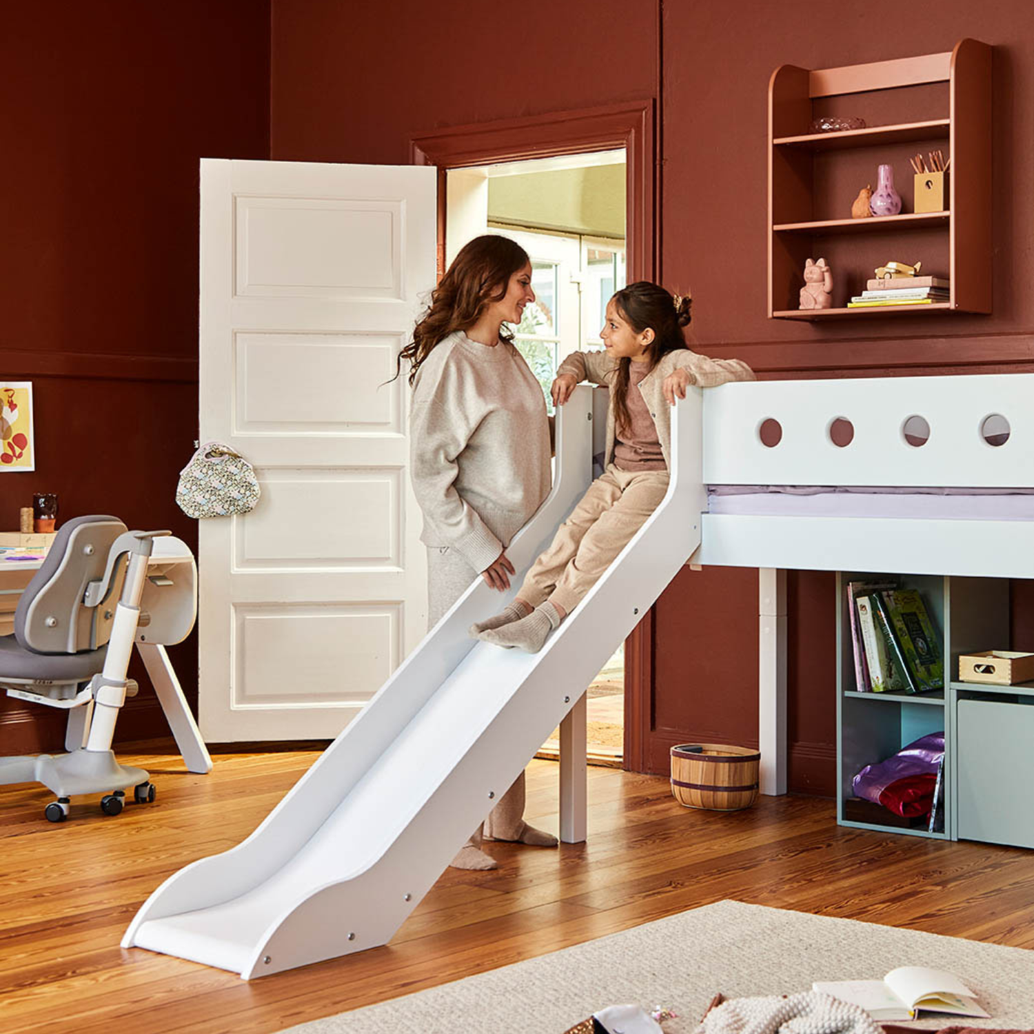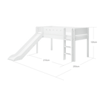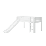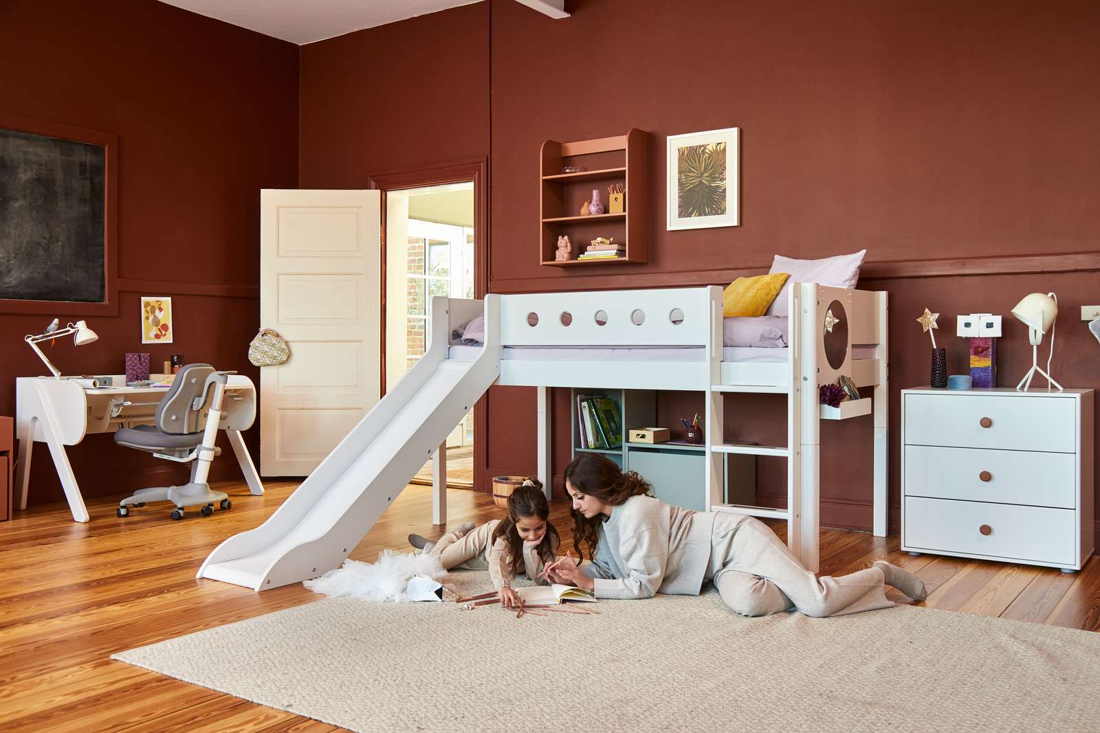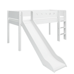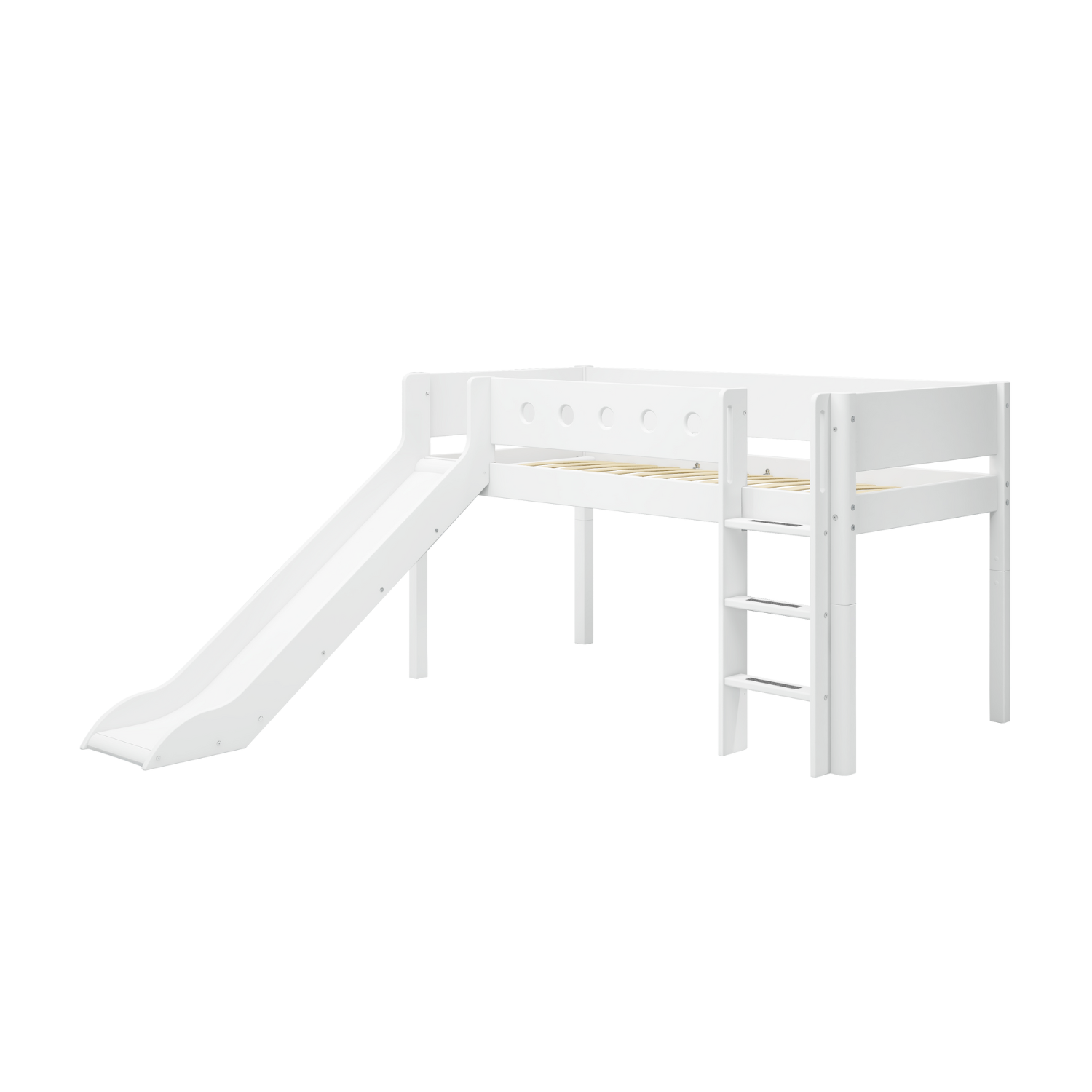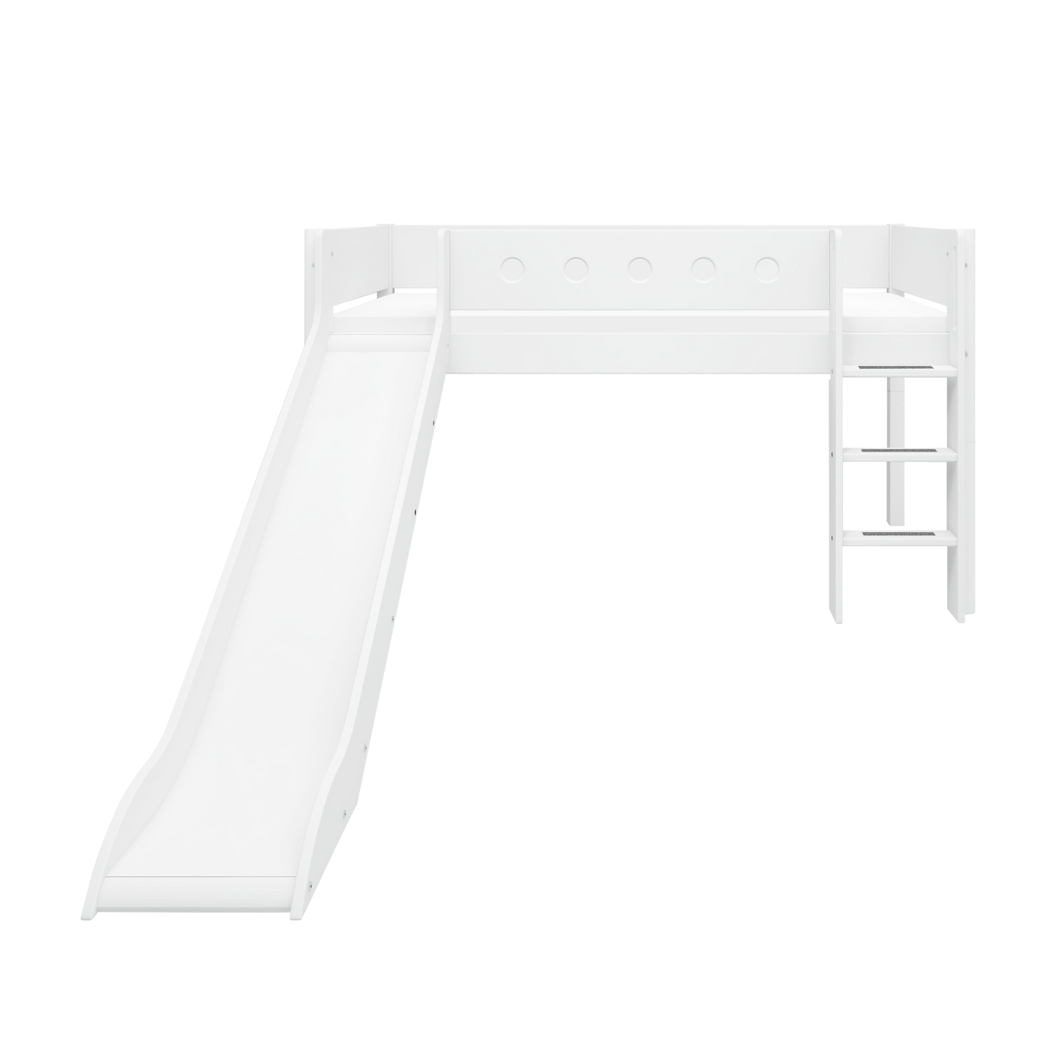 White mid-high bed with straight ladder and slide. The bed, that will turn the child's room into a playground! The ladder has anti-slip steps and integrated handles and can be placed in both ends of the bed - just as the slide. The space underneath midsleeper is perfect for storage. FLEXA textiles enables you to create a private sphere underneath the bed by adding the play curtains. On the bed the cave can be be used. The White grows with the children. By moving the slide and ladder and adding short legs to the midsleeper, you can rebuild the bed into a single bed. And by adding high legs to the bed, you can rebuild the bed to a high bed. The bed is made of high quality MDF and has legs in solid pine. Recommended age: From the age of 6 years.