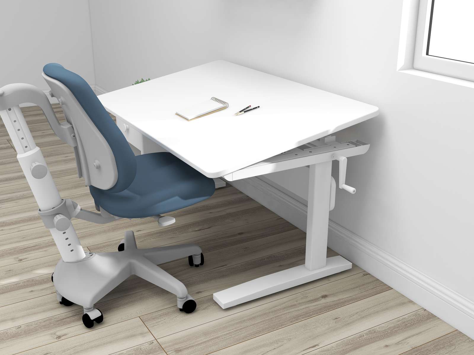 Study desk with adjustable height 54 to 76 cm and tiltable desk top 45° according to child's preference to achieve a correct sitting posture and help them stay healthy in the workplace. With its rounded corners, modern colours combined with the warmth of the MDF or pinewood the design is modern, scandinavian and playful.