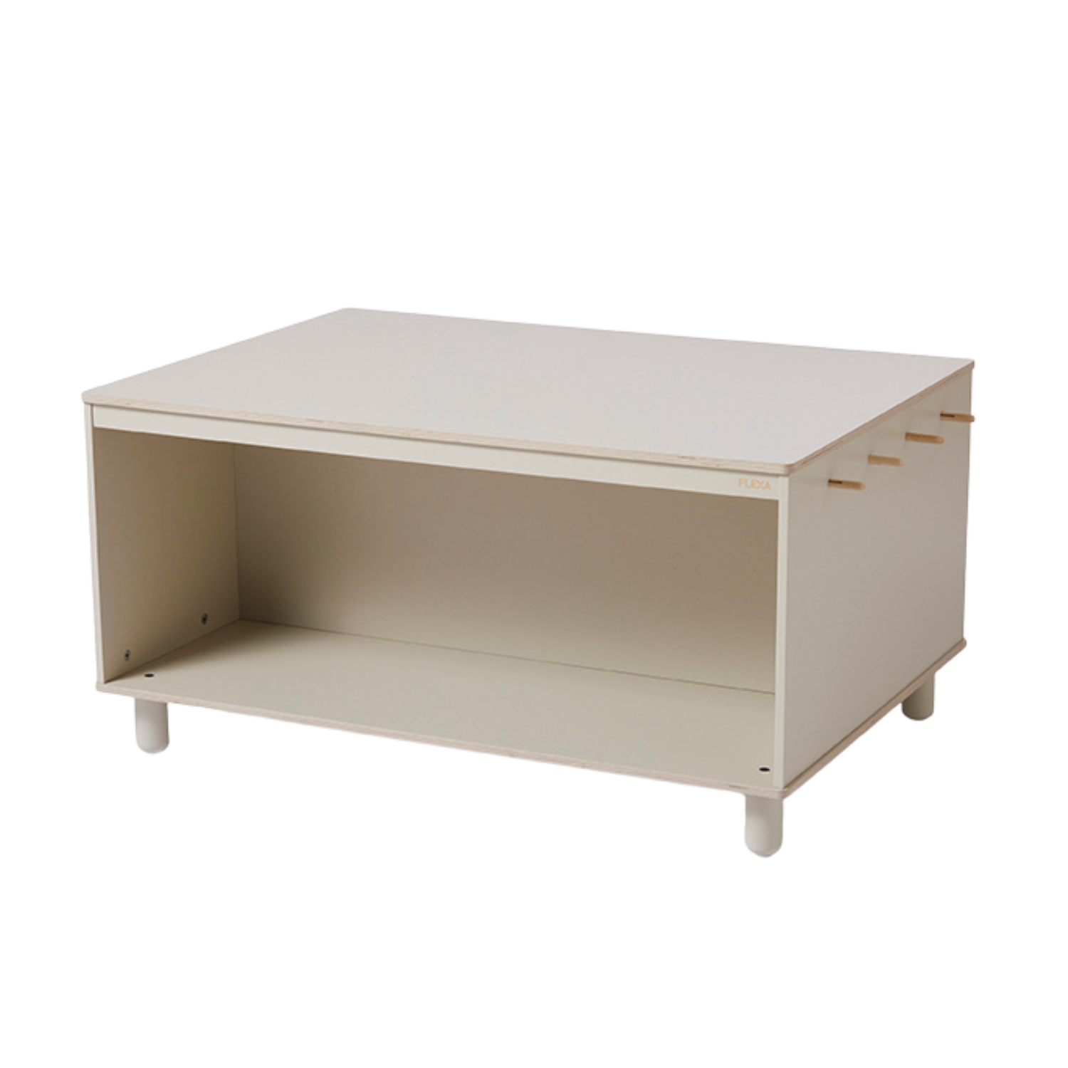 At Play Table, your child can experience the joy of creating something great together with others. “How about we set up a car track, complete with road-signs, and a loading crane?” Or: “let’s do a drawing of a man, where you paint his head and I paint his shoes!” At Play Table, everyone is part of the game – it’s all about creativity and teamwork. Even the family’s little, curious baby can use the table to practice standing and taking the first, sideways steps. Store your child’s colouring crayons, and bags of toys underneath the table or in a FLEXA Craft Caddy Set attached to the table’s pegboard side.