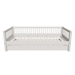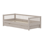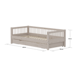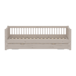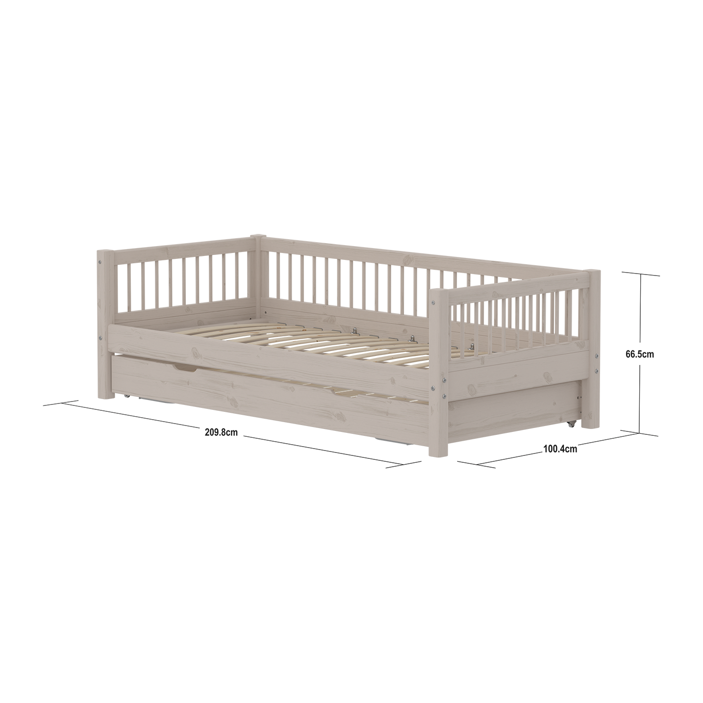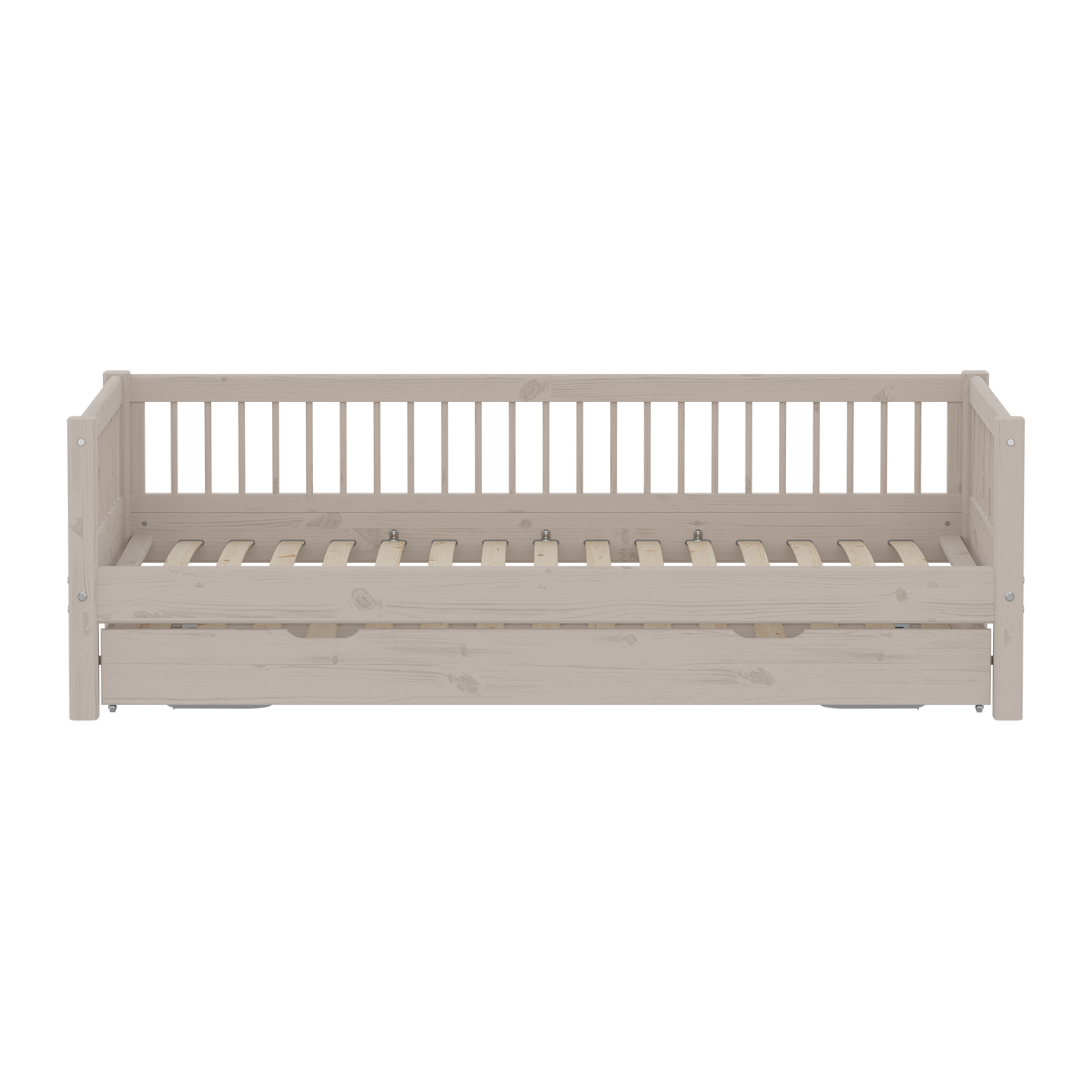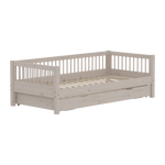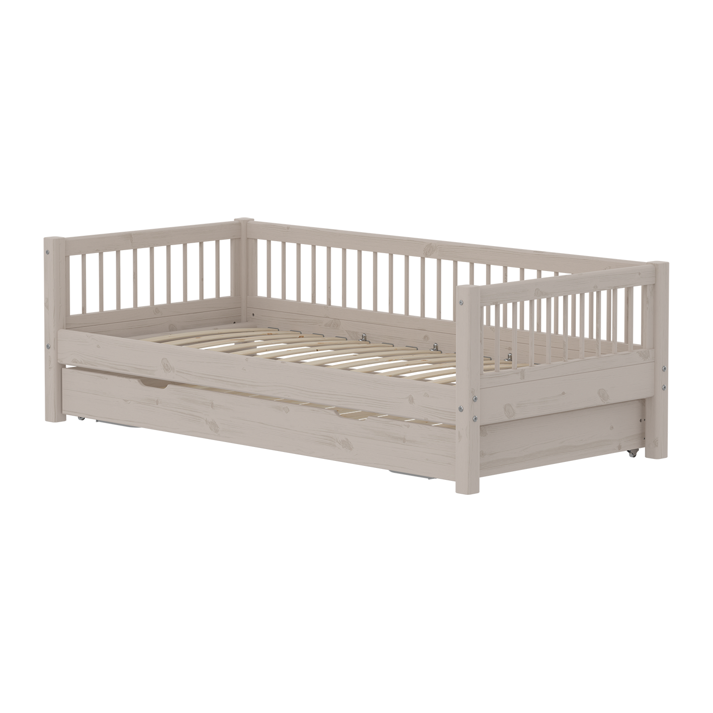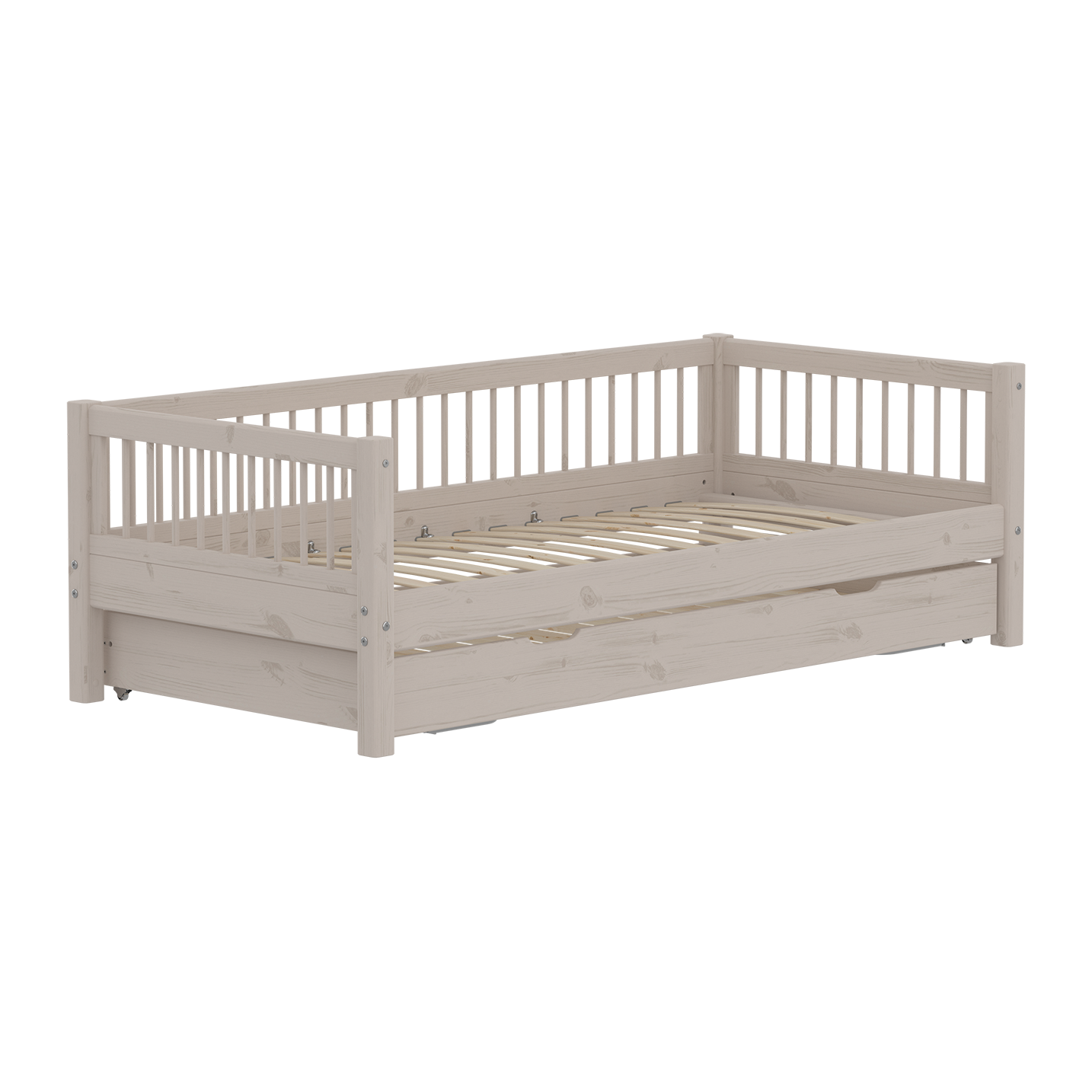 CLASSIC daybed with backrest, head- and foot board with crossbars and pull-out bed underneath the bed. The bed is perfect for the teens and for sleepovers with friends or family. The bed comes in grey washed pinewood.