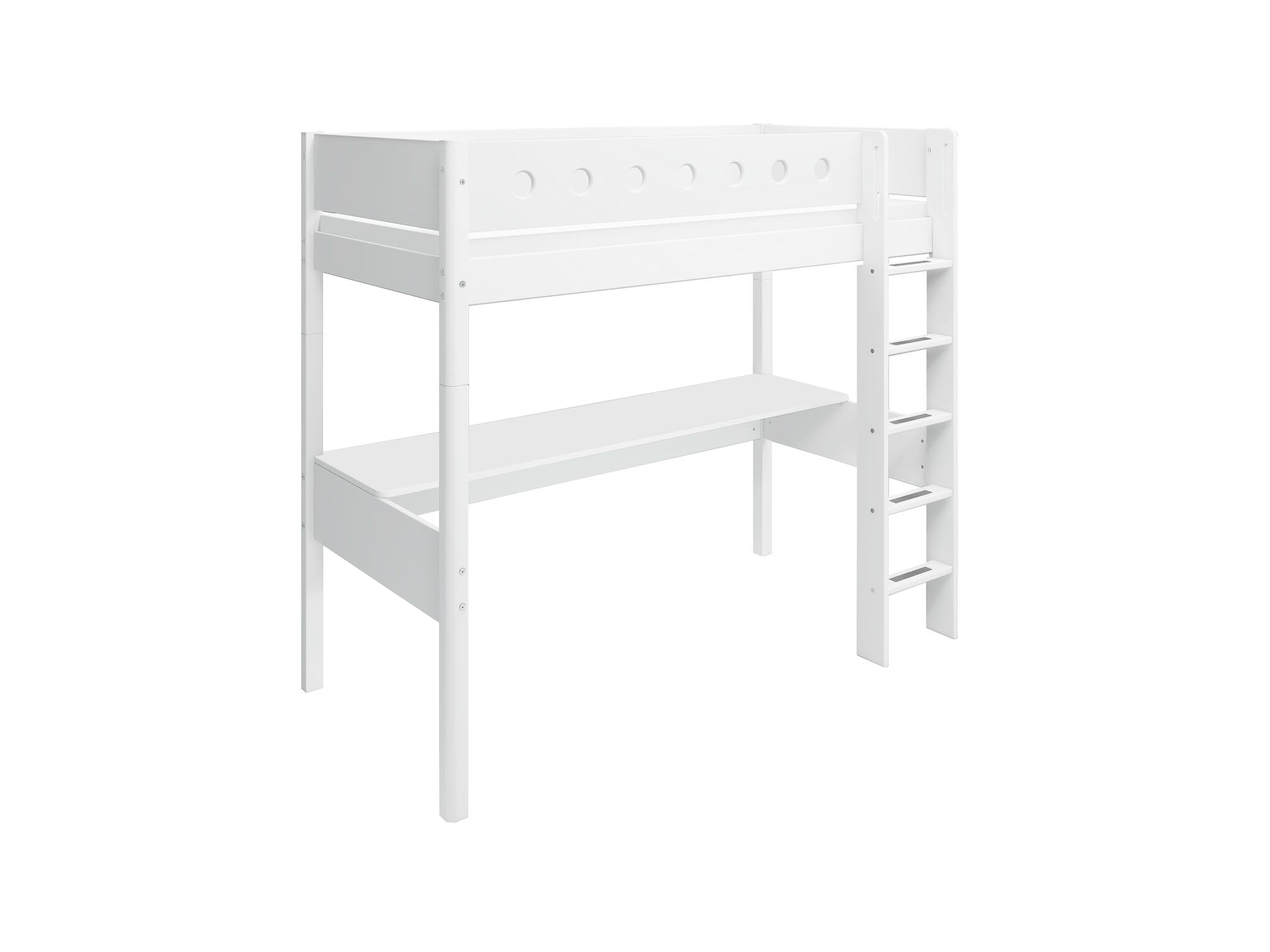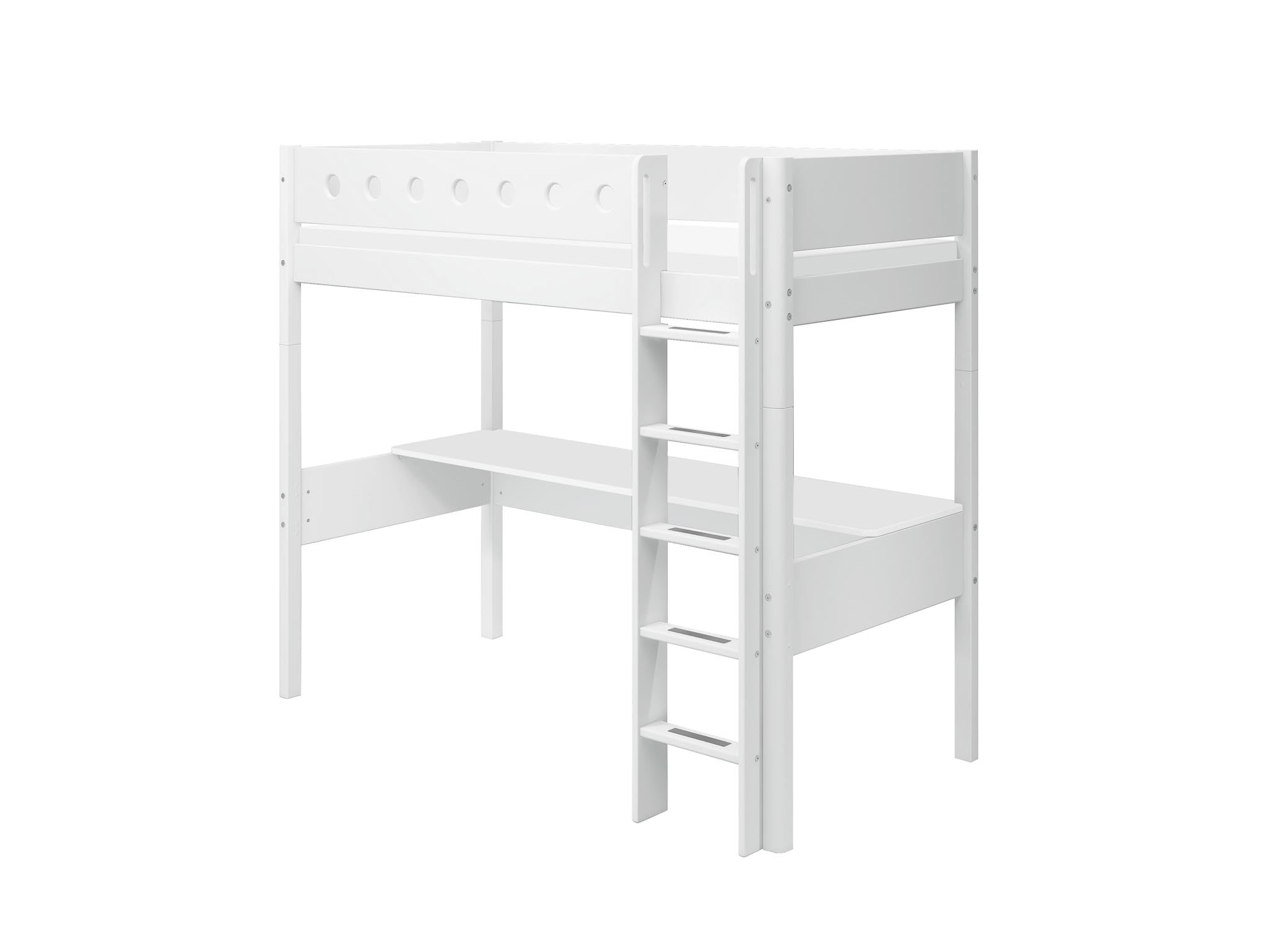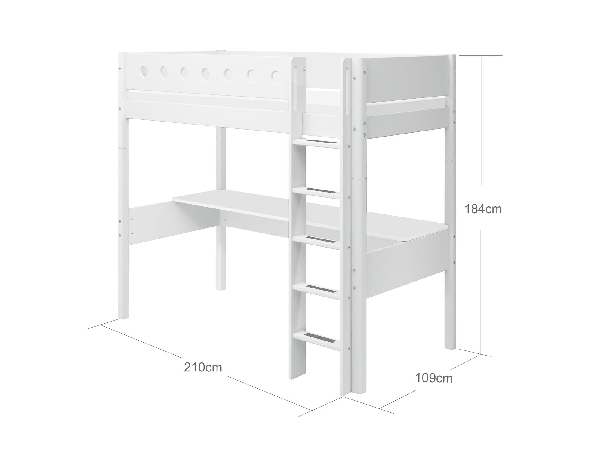 White high bed is the perfect solution for children, who need space or storage underneath the bed. The bed also encourages to cozy times under the bed. The high bed is modular and can be changed into a single bed or a mid-high bed by changing the legs and the ladder. The bed has a straight ladder with anti-slip steps and integrated handles. The ladder can be placed in both ends of the bed. The bed is made of high quality MDF and has legs in solid pine. Reccomended age: From the age of 8 years.