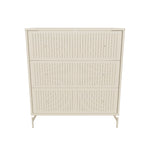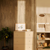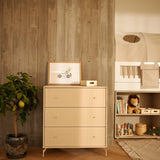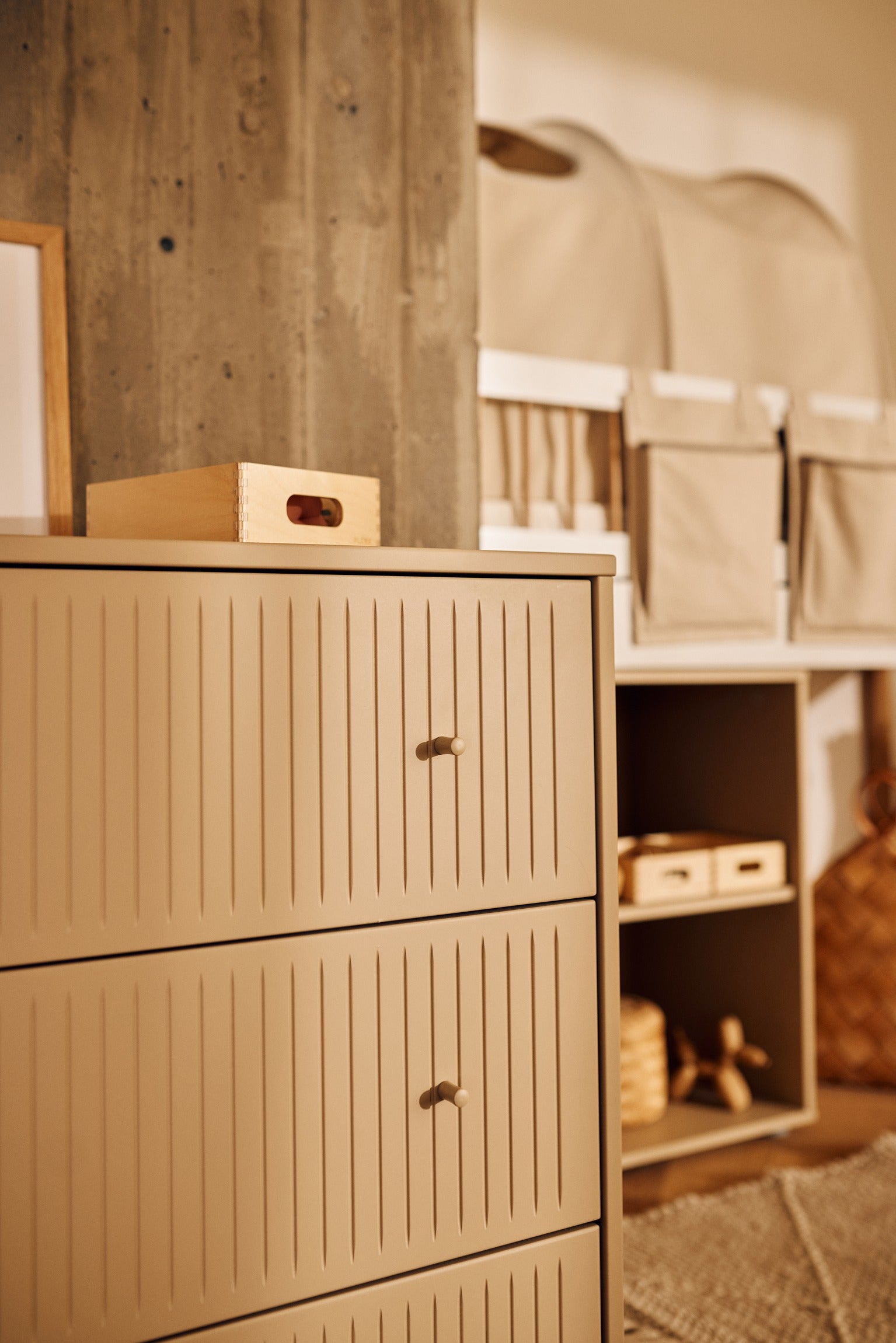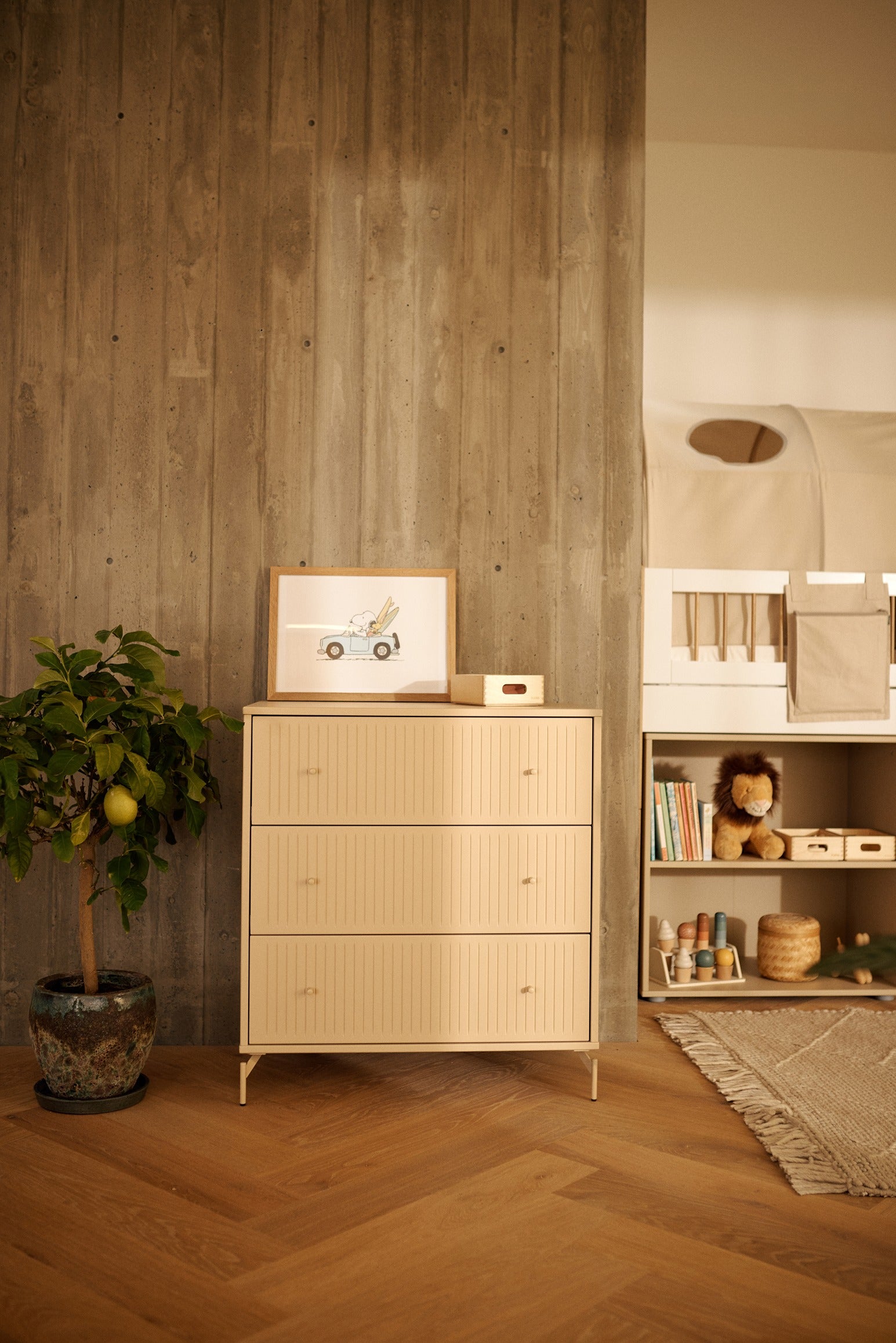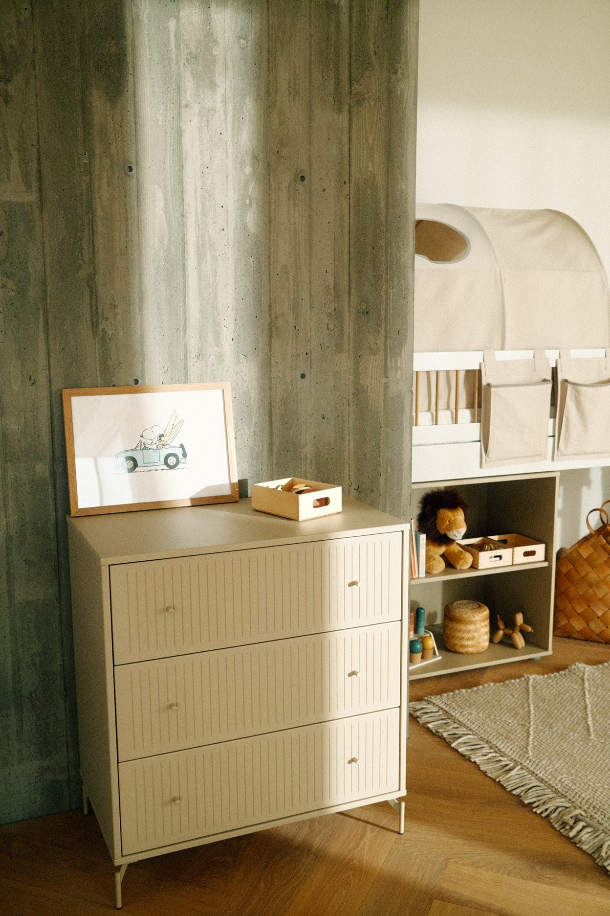 The FLEXA SAGA Chest in oat features 3 drawers with soft-close mechanisms to protect little fingers. When using the plastic feet, the chest with 3 drawers can be placed under our mid-high beds for efficient use of space in the kids room. The round oat metal knobs add a simple, clean design element.