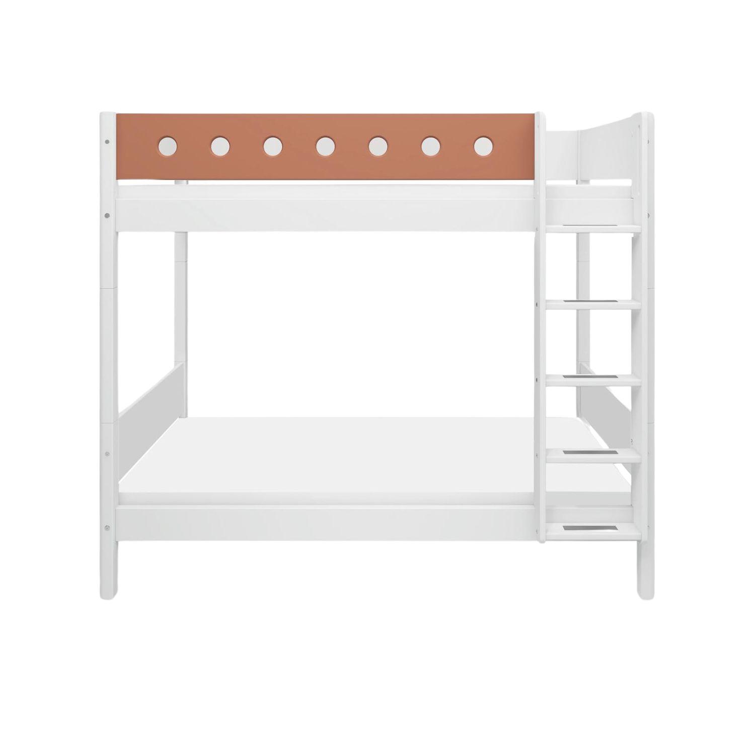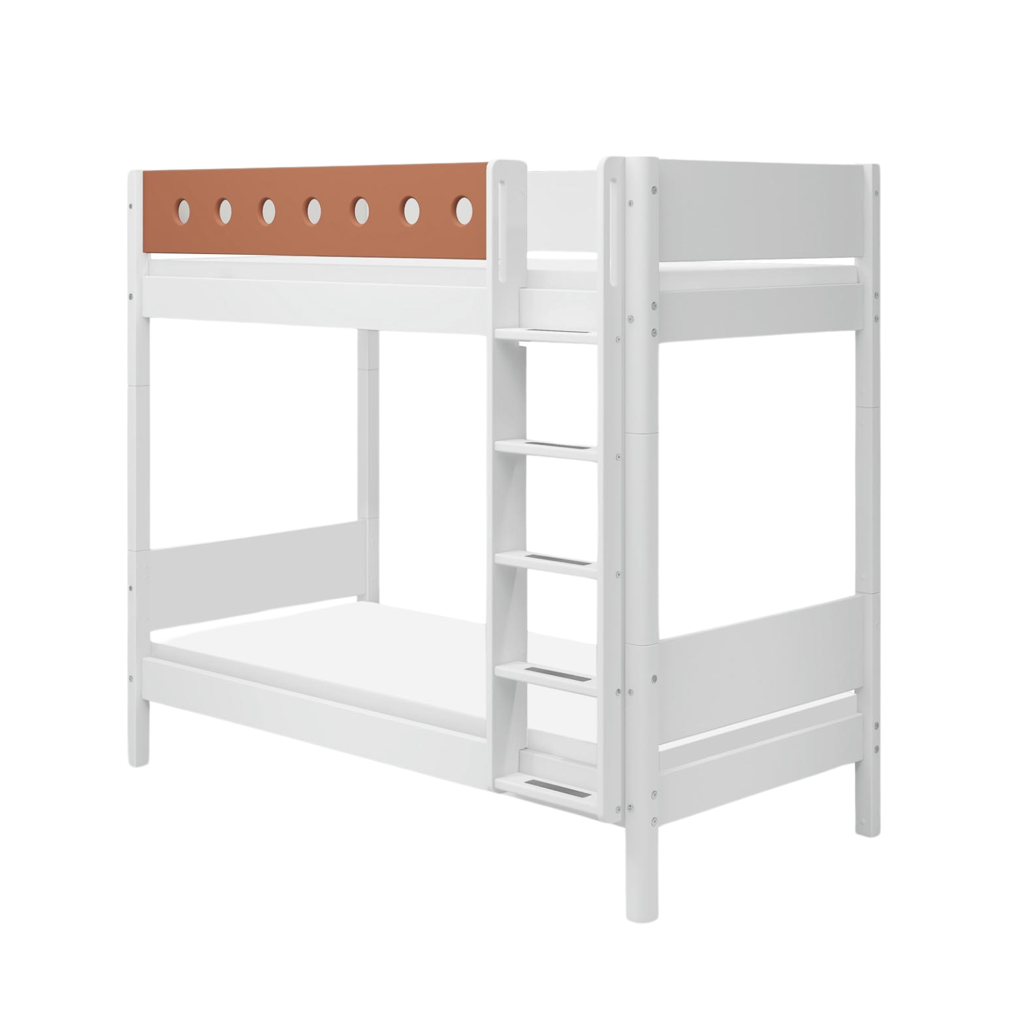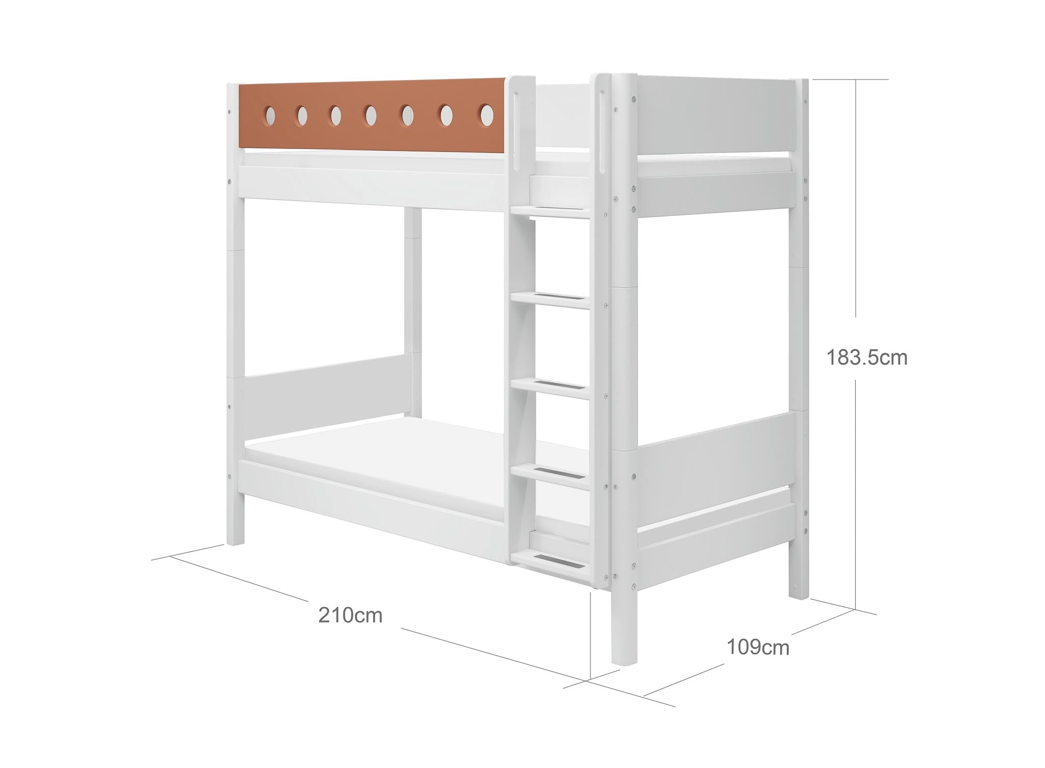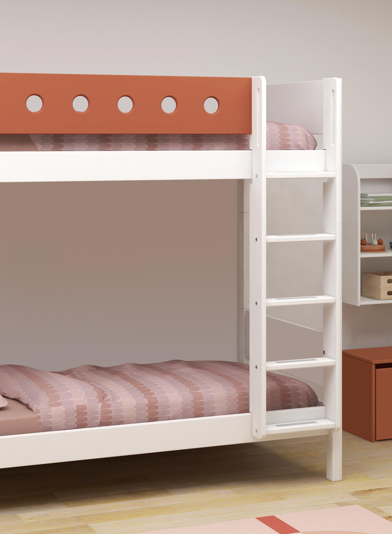 White bunk bed with extra height straight ladder is the perfect space-saving solution for smaller homes. The ladder has anti-slip steps and integrated handles and can be placed in both ends of the bed. The bed is made of high quality MDF and has legs in solid pine. Recommended age: From the age of 6 years. A child can from the age of 3 years sleep in the lower bed with safety rail.