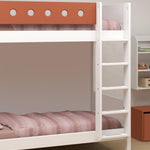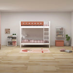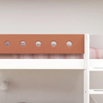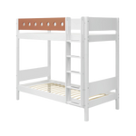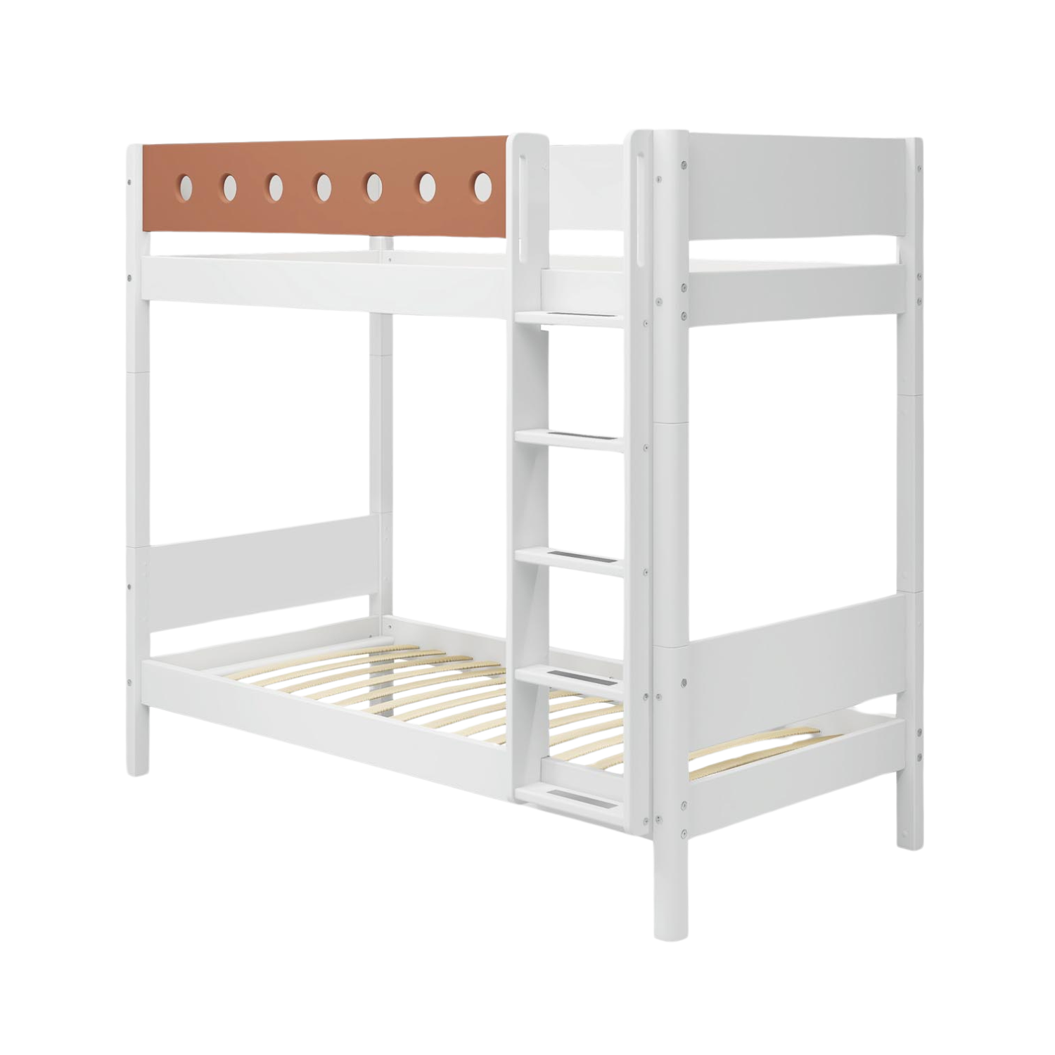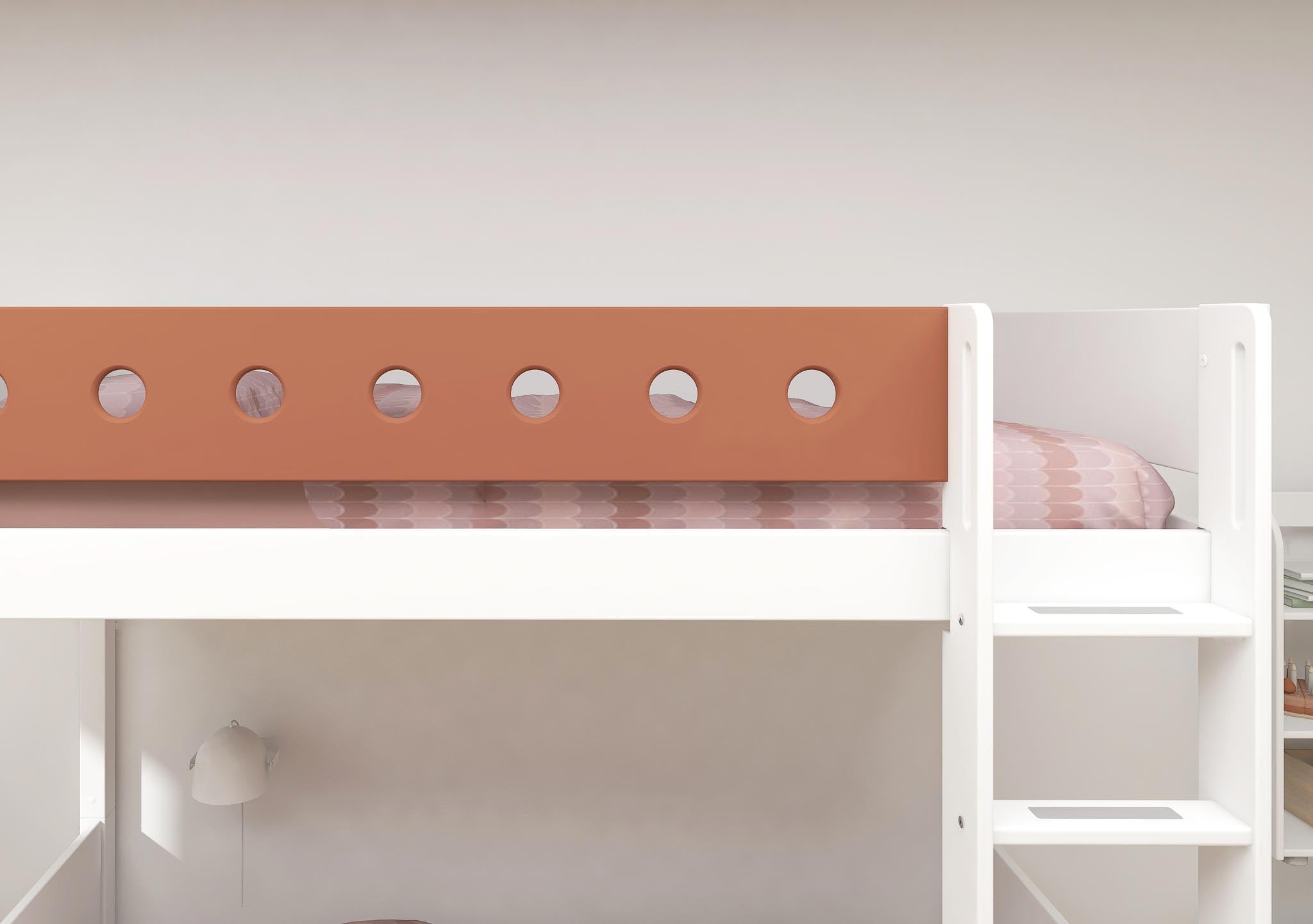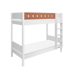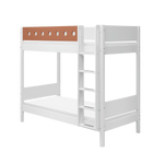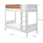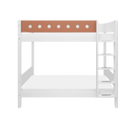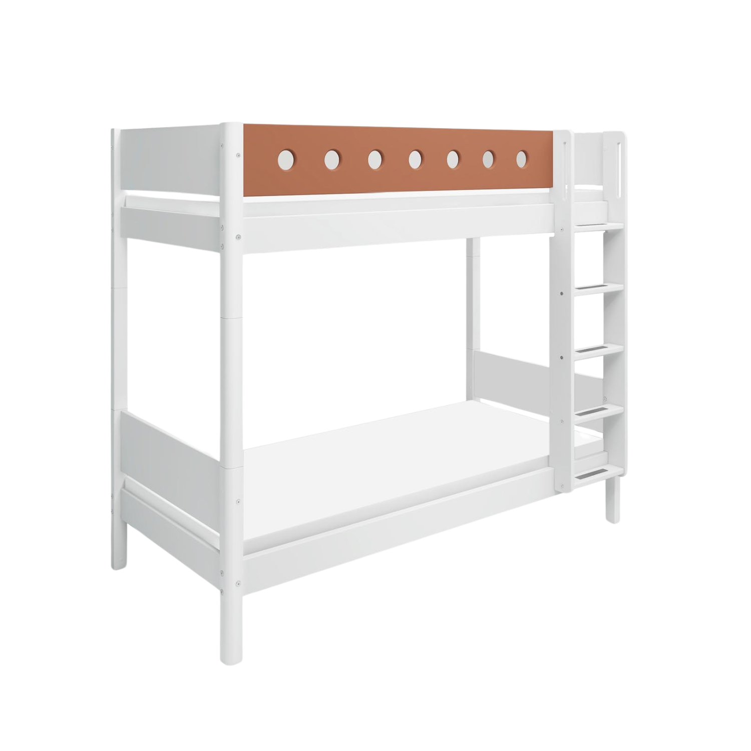 White bunk bed with extra height straight ladder is the perfect space-saving solution for smaller homes. The ladder has anti-slip steps and integrated handles and can be placed in both ends of the bed. The bed is made of high quality MDF and has legs in solid pine. Recommended age: From the age of 6 years. A child can from the age of 3 years sleep in the lower bed with safety rail.