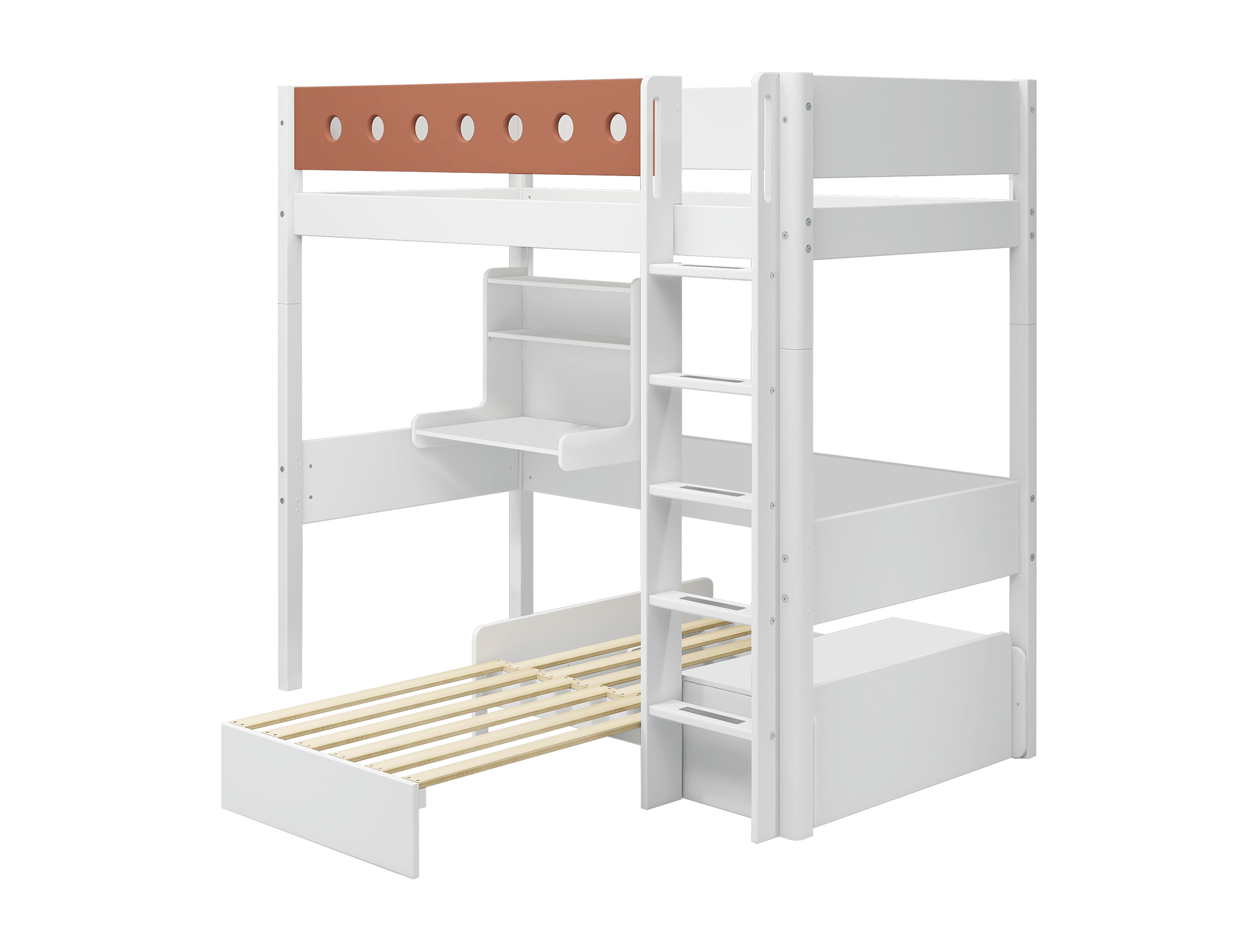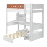 White casa high bed with integrated sleeping module and click-on desk. The perfect bed for the teens, who needs extra space underneath the bed for a desk and room for sleepovers. The bed has straight ladder with anti-slip steps and interated handles. The bed is made of high quality MDF and has legs in solid pine. Reccomended age: From the age of 8 years.