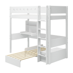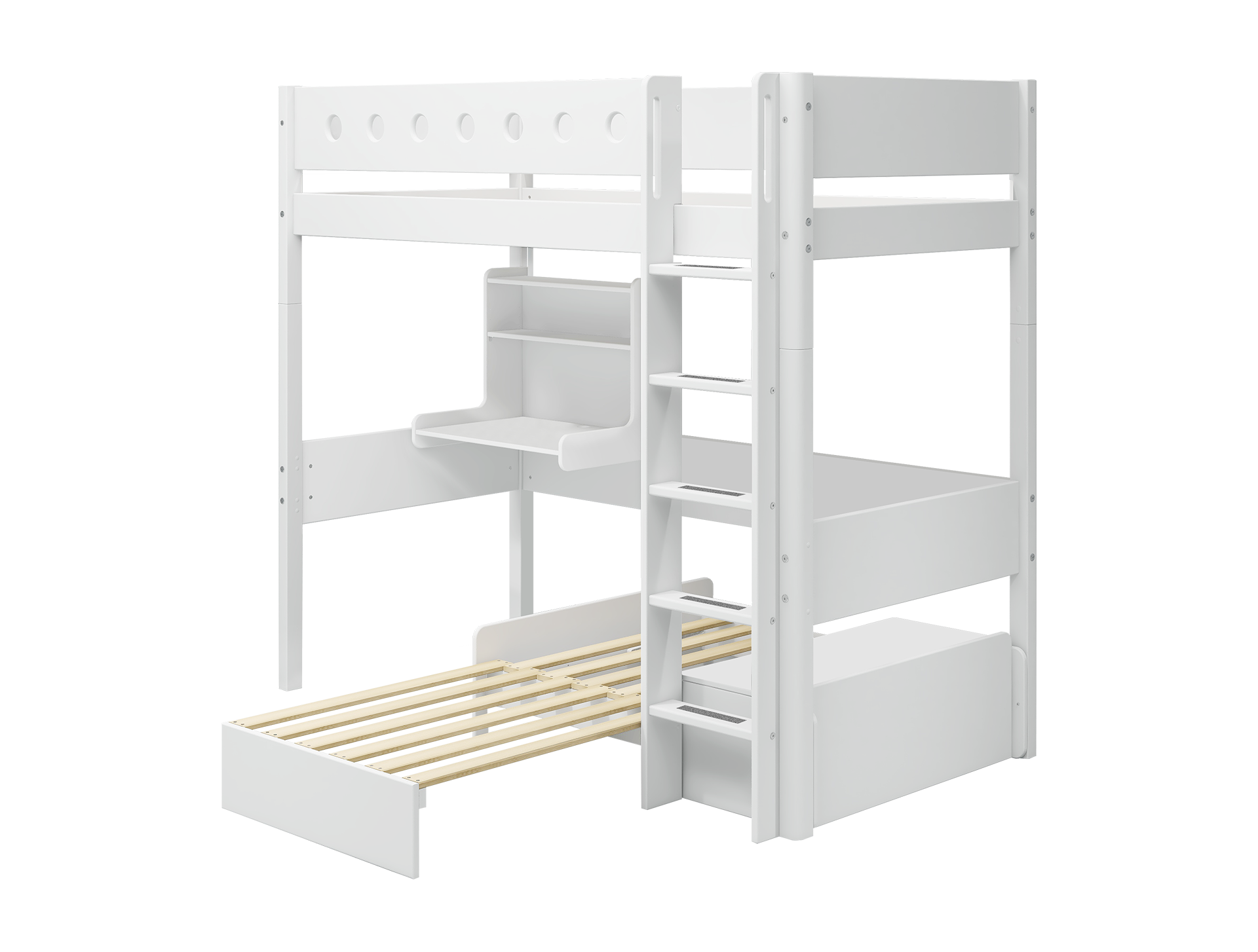 White casa high bed with integrated sleeping module and click-on desk. The perfect bed for the teens, who needs extra space underneath the bed for a desk and room for sleepovers. The bed has straight ladder with anti-slip steps and interated handles. The bed is made of high quality MDF and has legs in solid pine.