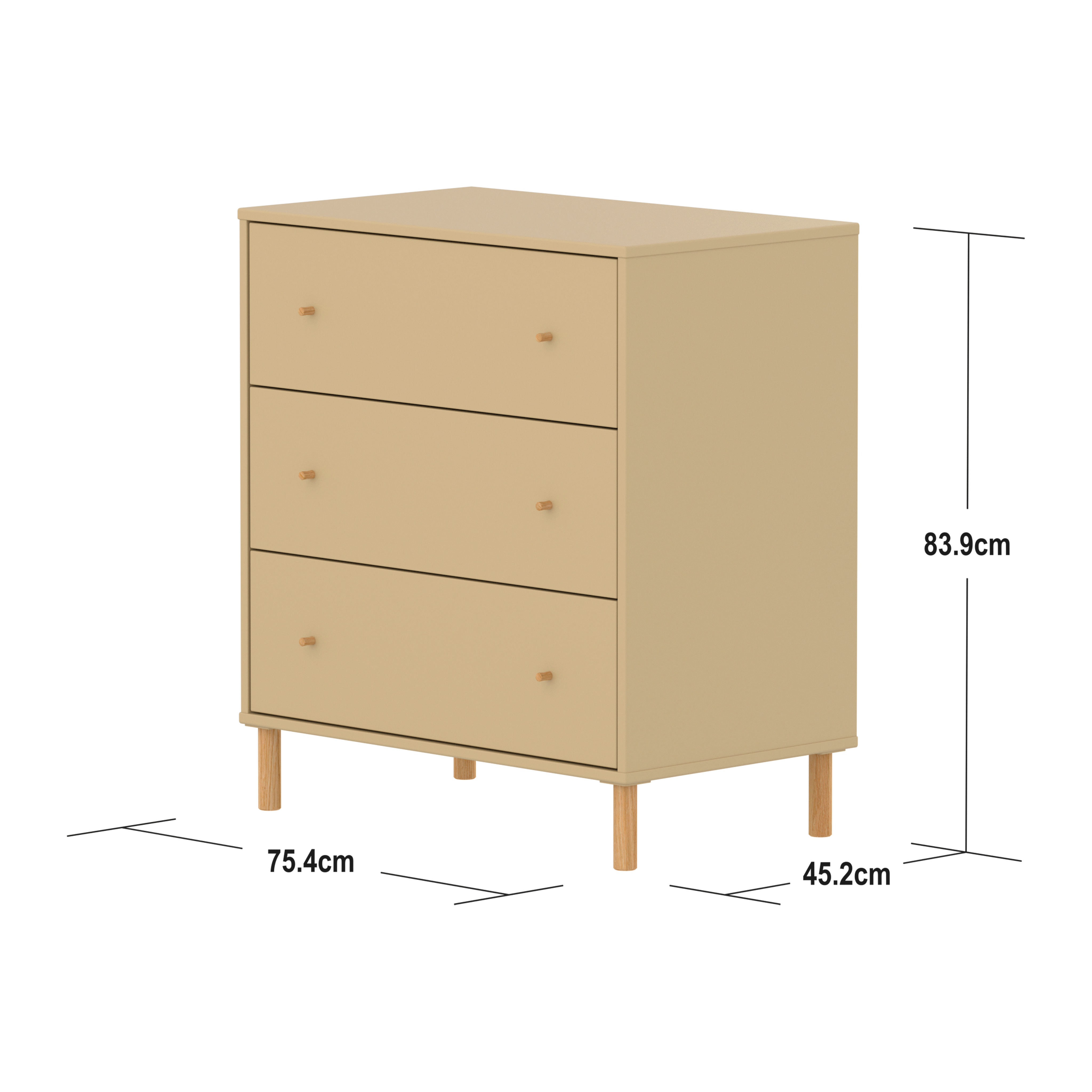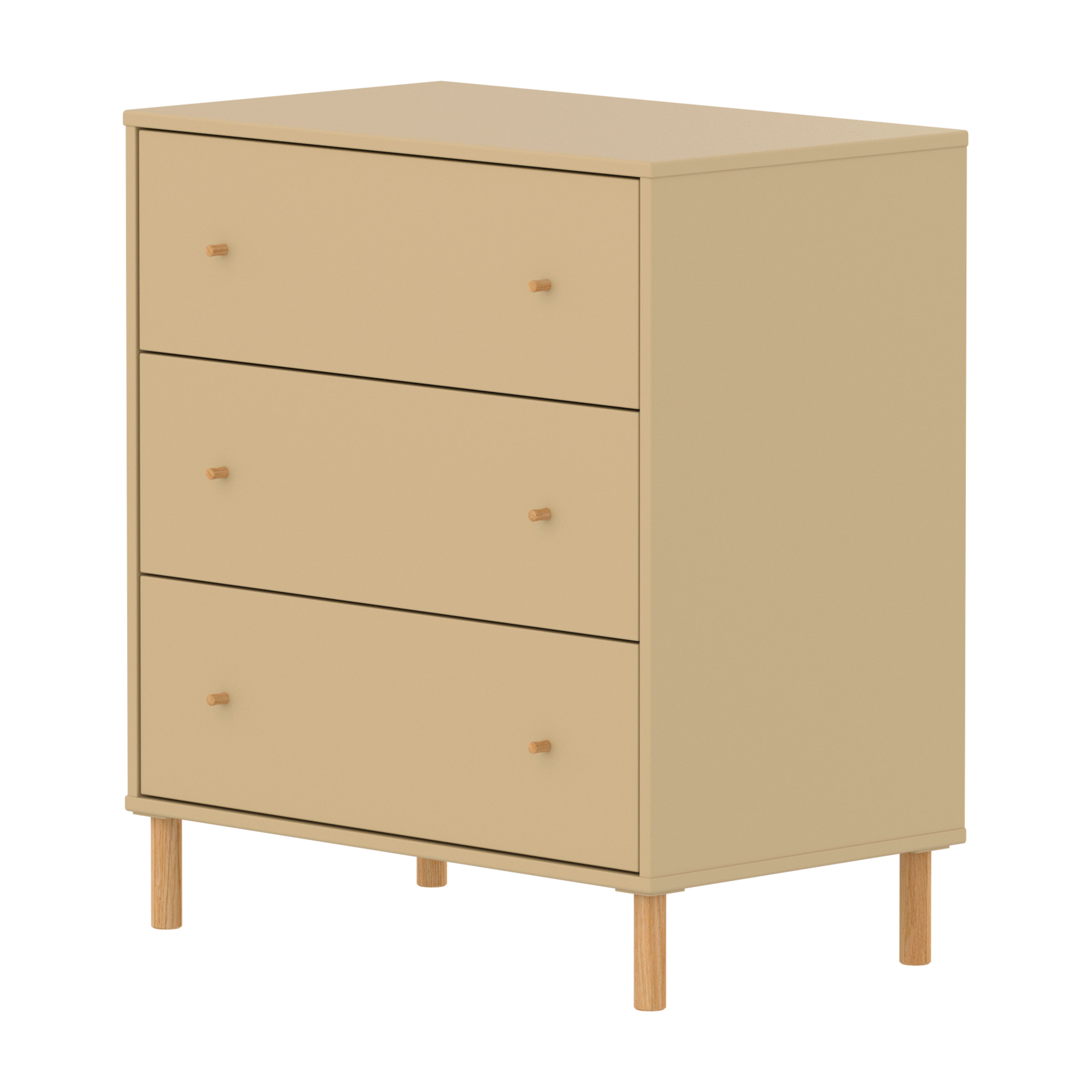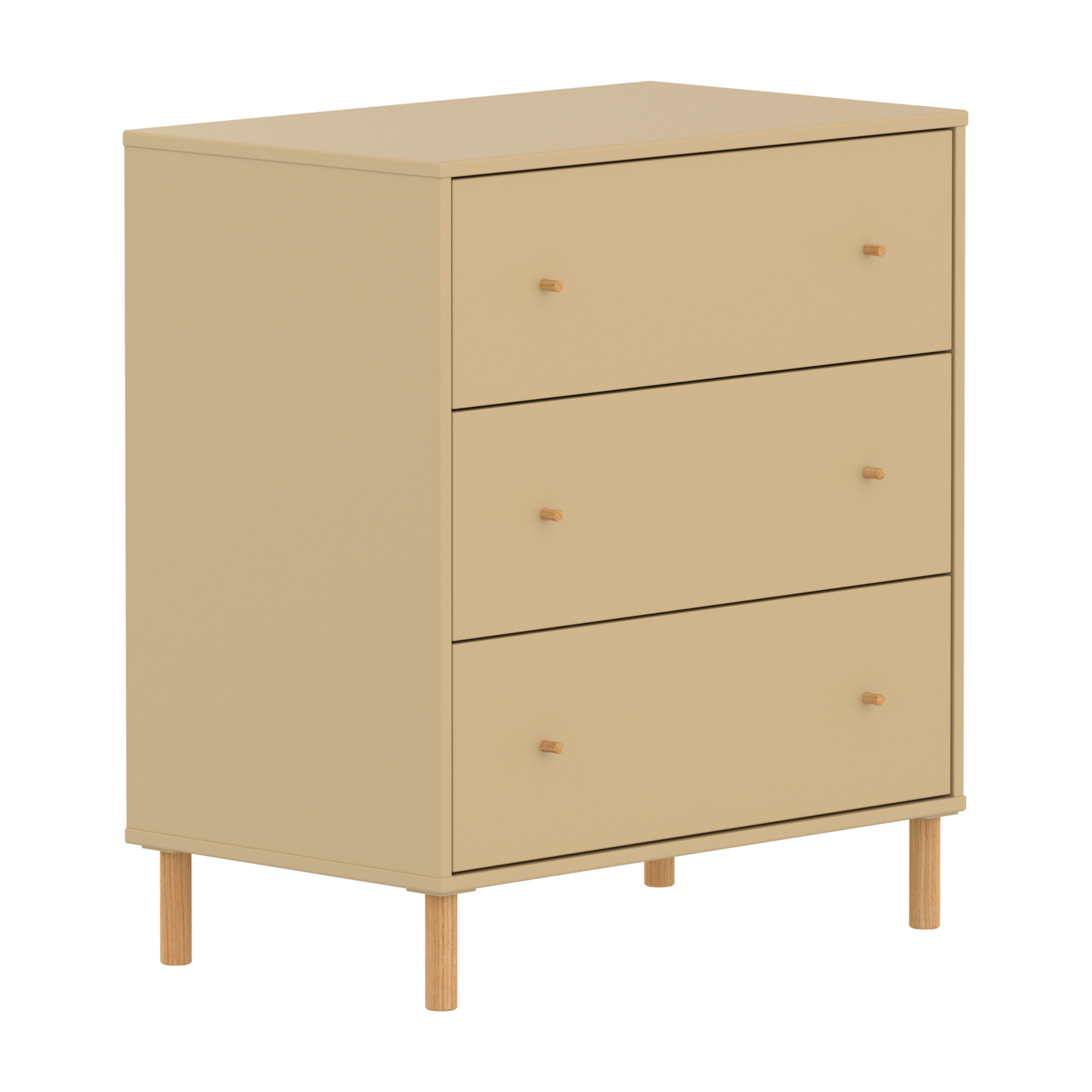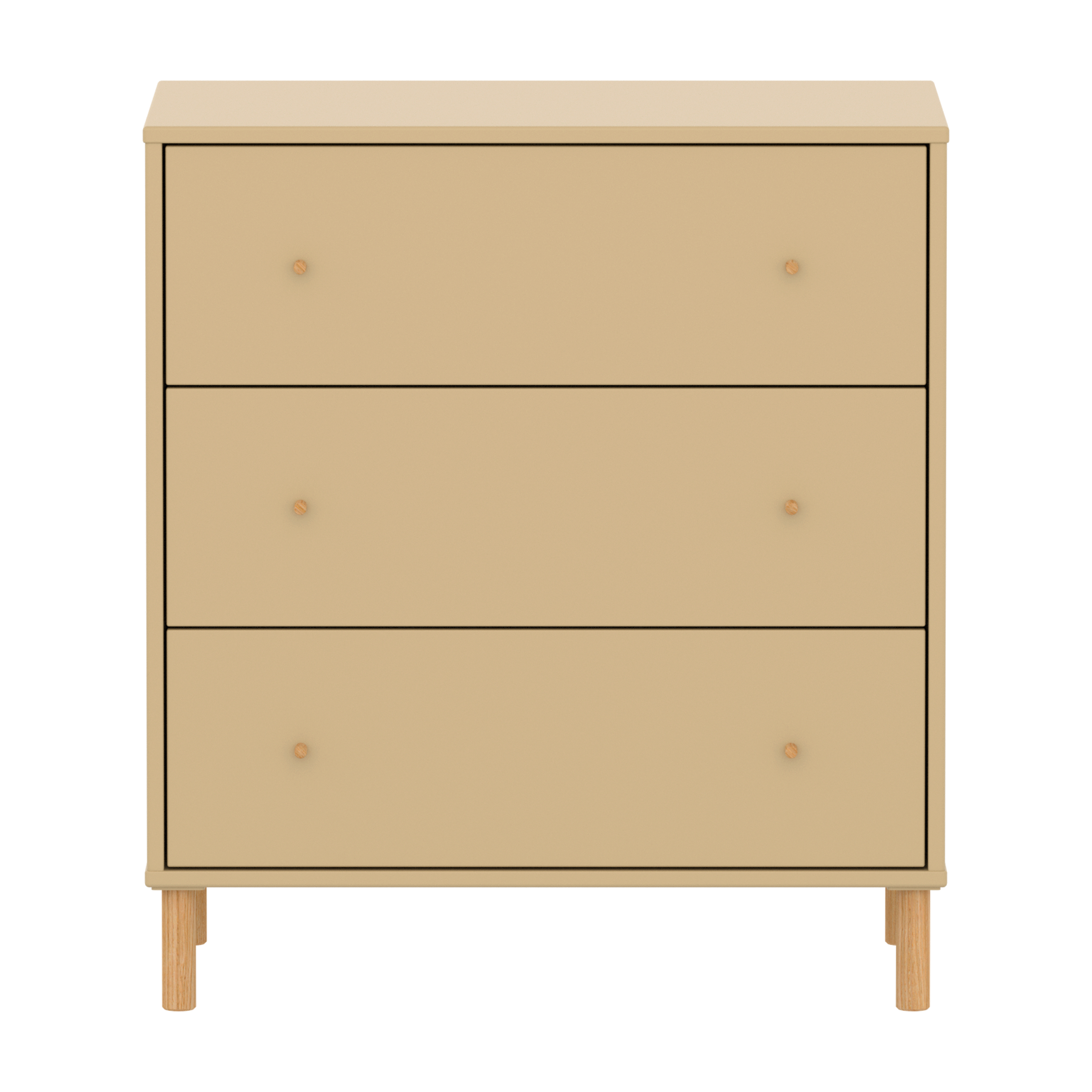 The FLEXA SAGA Chest in Sand features 3 drawers with soft-close mechanisms to protect little fingers. When using the plastic feet, the chest with 3 drawers can be placed under our mid-high beds for efficient use of space in the kids room. The round oak knobs add a simple, clean design element.