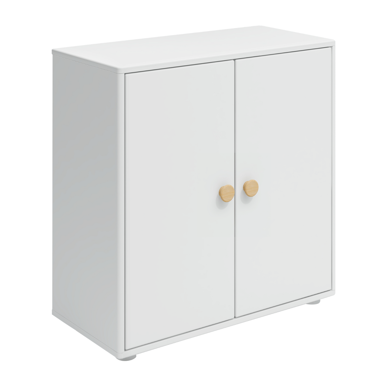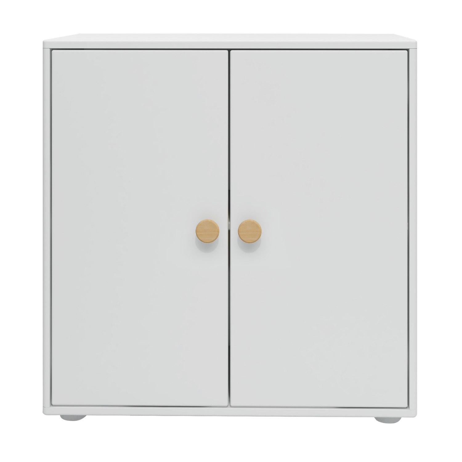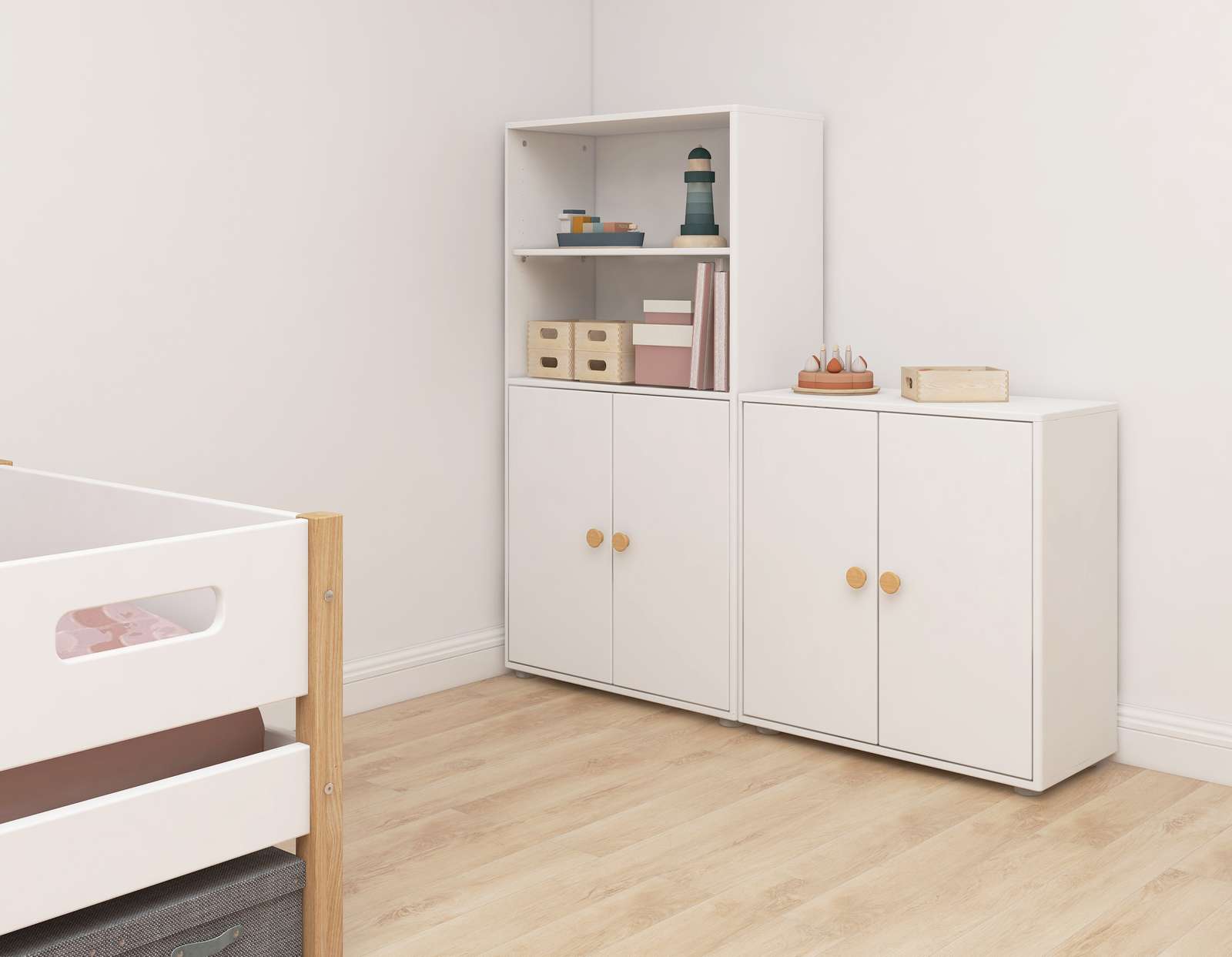 The freestanding Roomie mini bookcase has one adjustable shelf and two doors, and it's made of certified MDF and HDF. The bookcase is timeless, Scandinavian design with smooth edges for extra comfort and safety. It comes with rounded wooden knobs in several different colour options, and it's perfect for storing books, toys and games in your child's room. It fits under FLEXA mid-high beds, and it can easily be combined with other storage units. Check out the full Roomie collection to see all the storage possibilities. - Freestanding bookcase with one adjustable shelf and two doors - Full-coloured, smooth edges, and soft-close - Easy to match with other FLEXA collections - Made from FSC™ certified MDF and HDF - Designed in Denmark