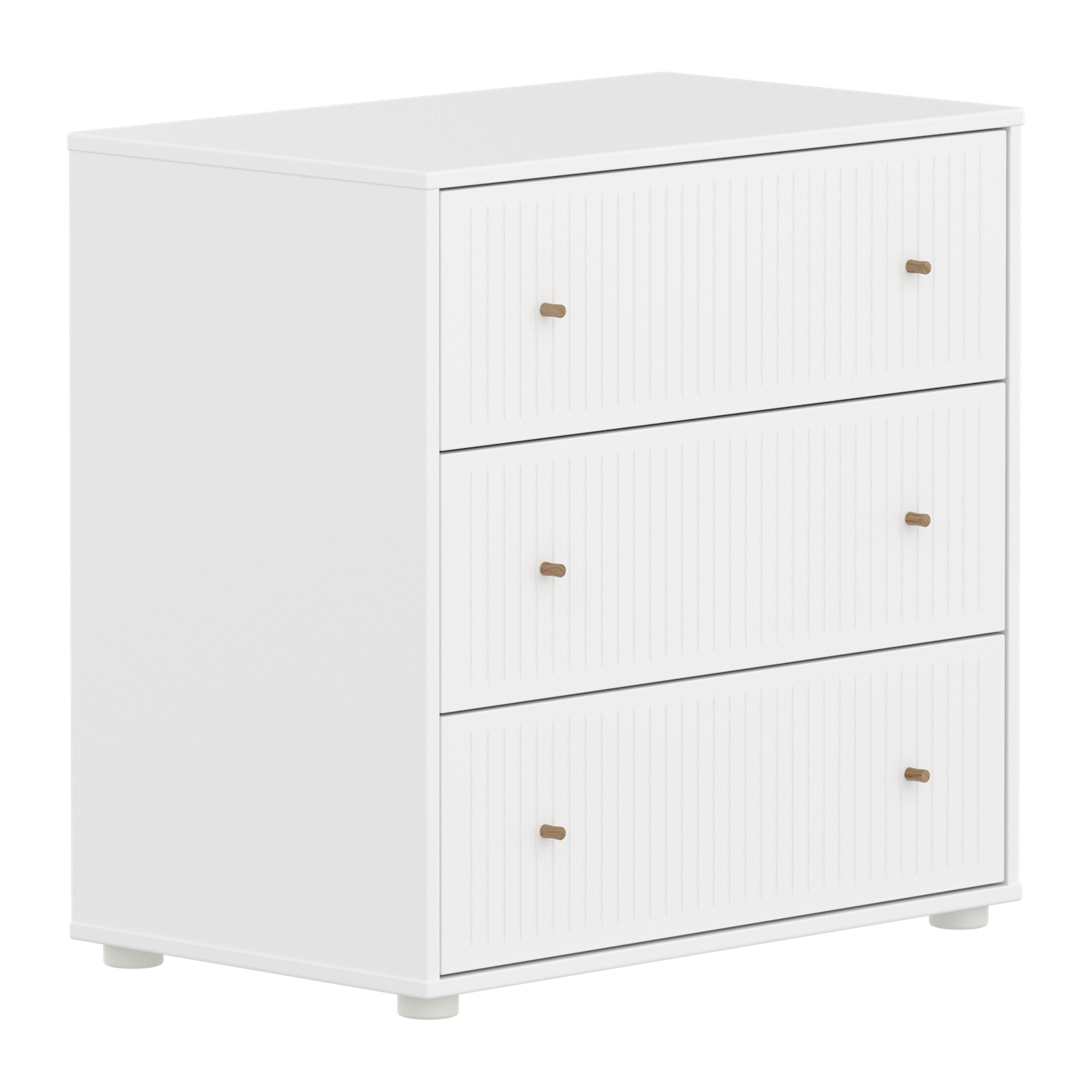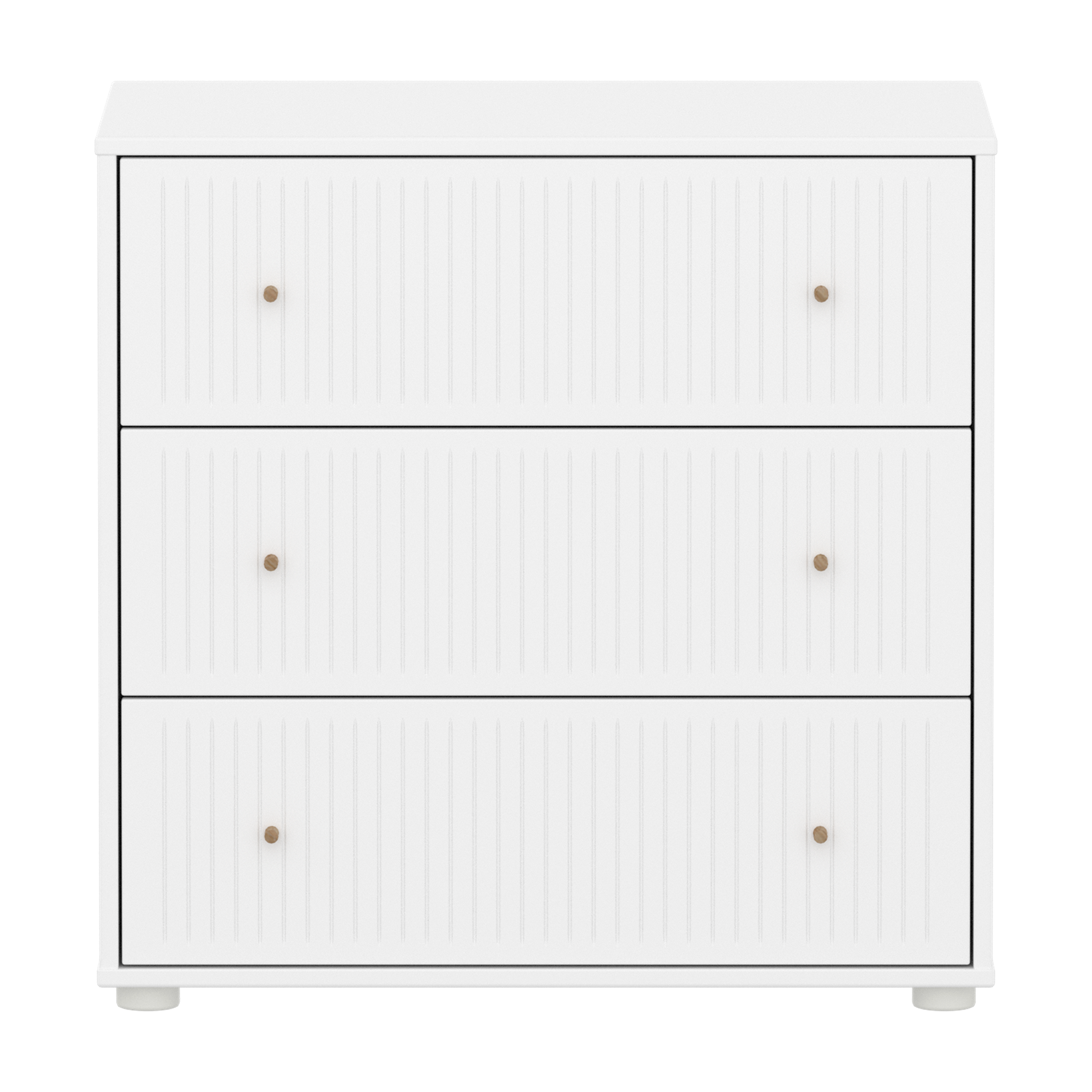 The FLEXA SAGA Chest in full white features 3 drawers with soft-close mechanisms to protect little fingers. The chest with 3 drawers with plastic feet can be placed under our mid-high beds for efficient use of space in the kids room. The round oak knobs add a simple, clean design element.