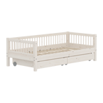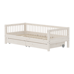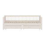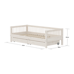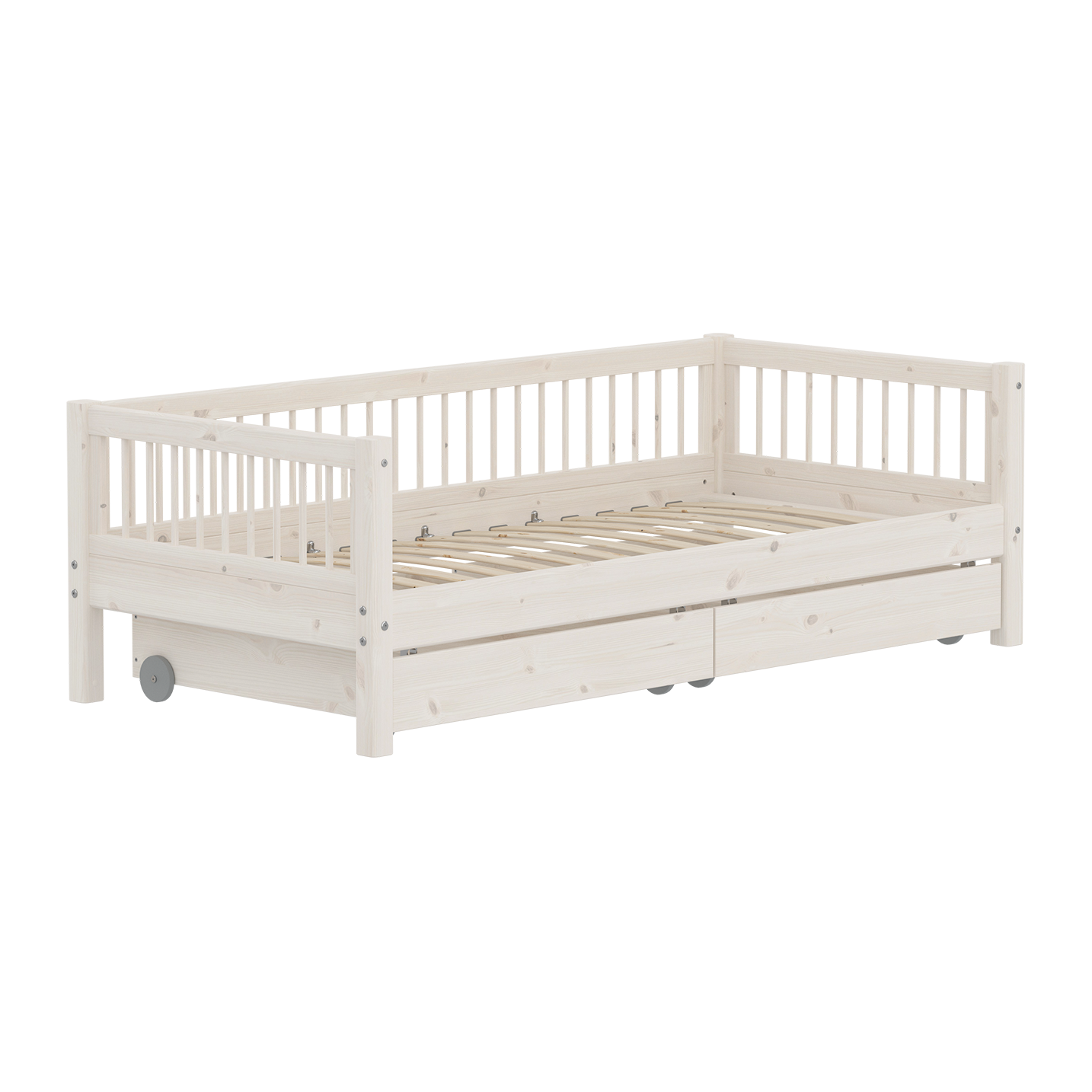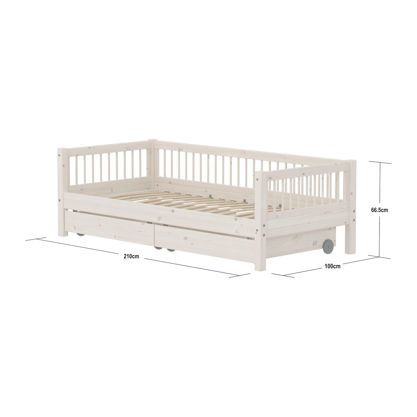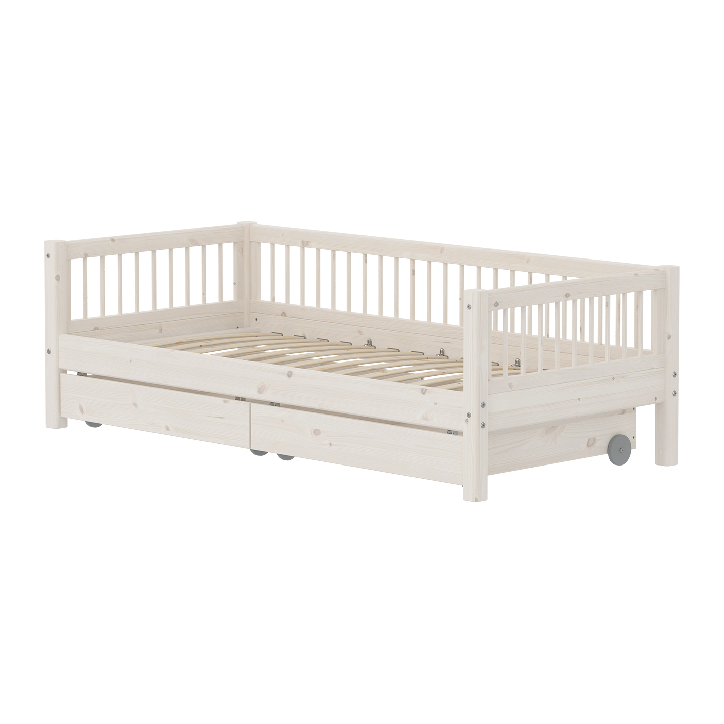 The bed has a classic and Scandinavian design and is available in two colours. The spacious drawers are perfect for storing toys. The drawers have practical wheels, making them easy for children to roll out from under the bed. Each drawer contains 88,5 liters.