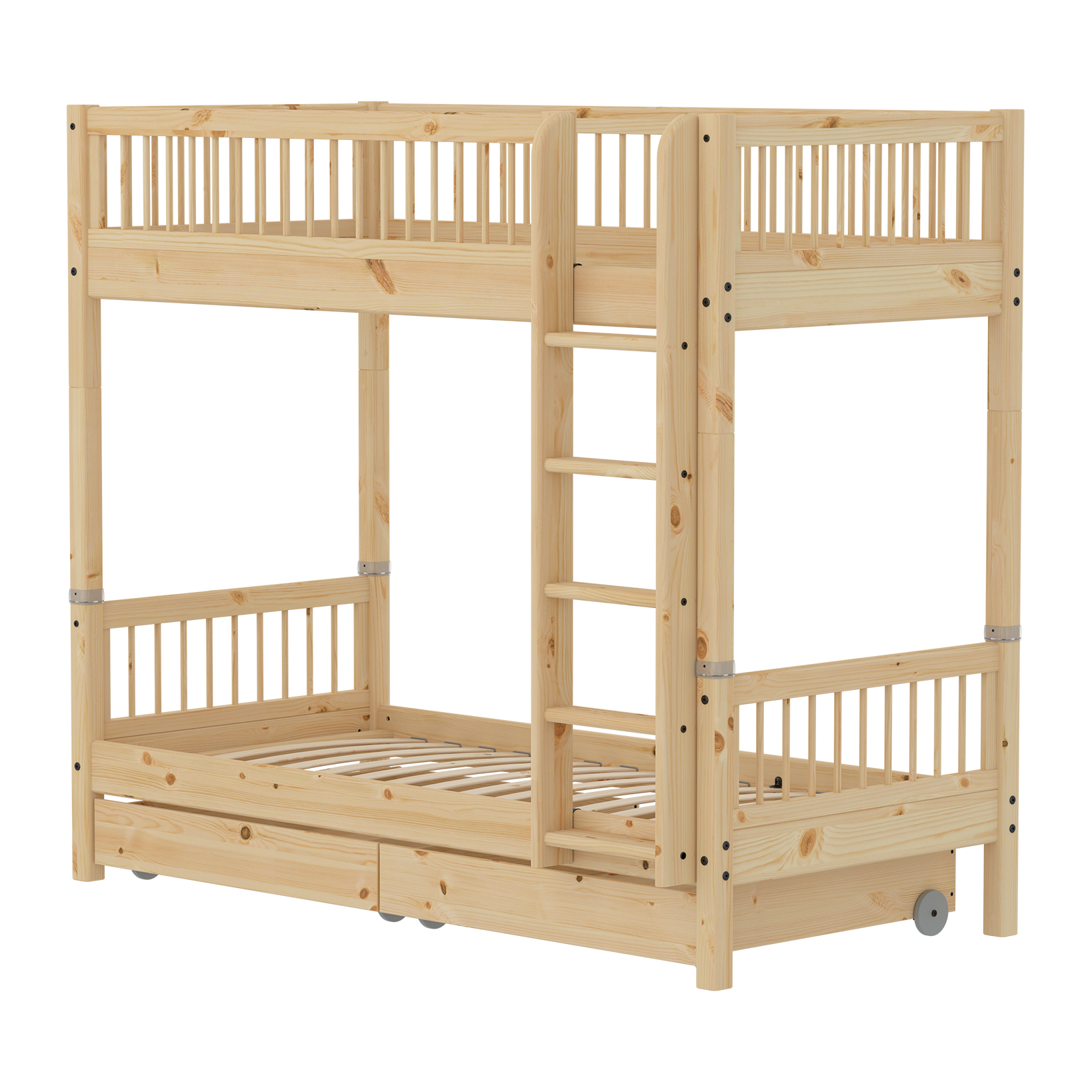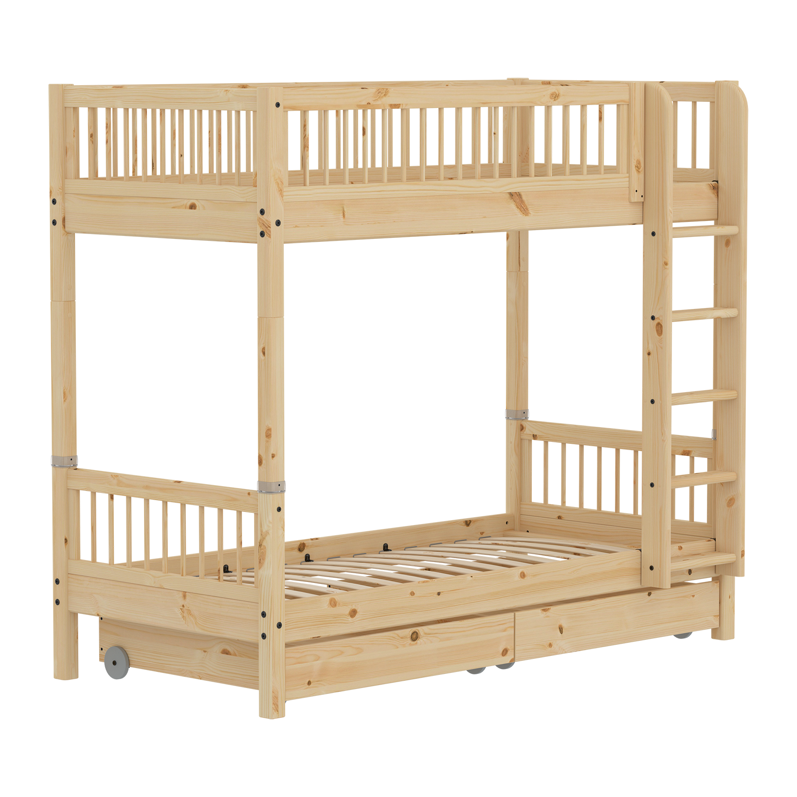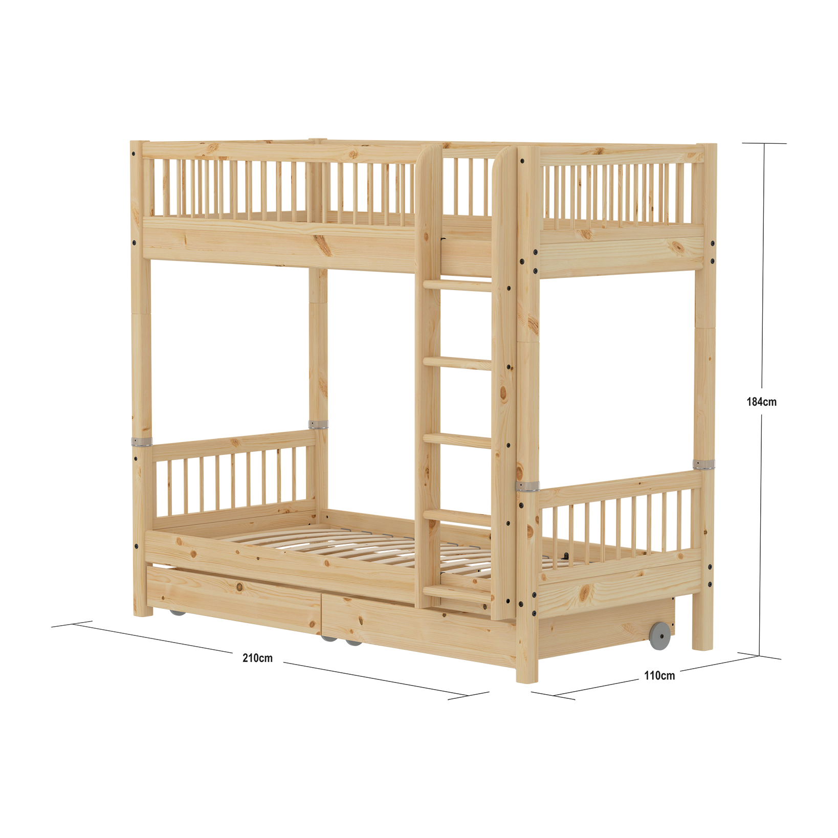 The spacious drawers are perfect for storing bedding or toys. Each drawer contains 88,5 liters. The drawers have practical wheels, making them easy to roll out from under the bed.