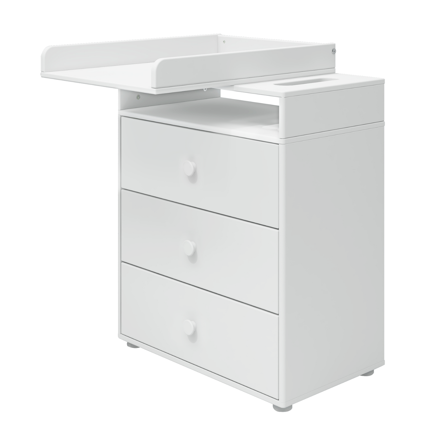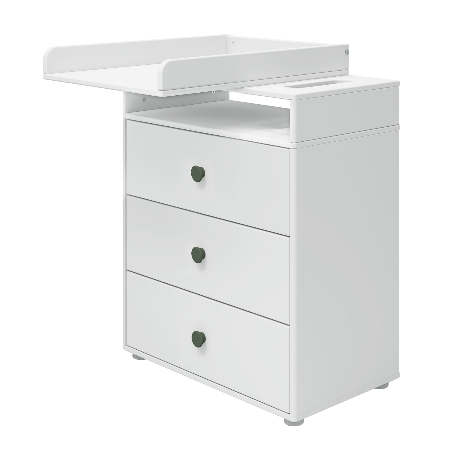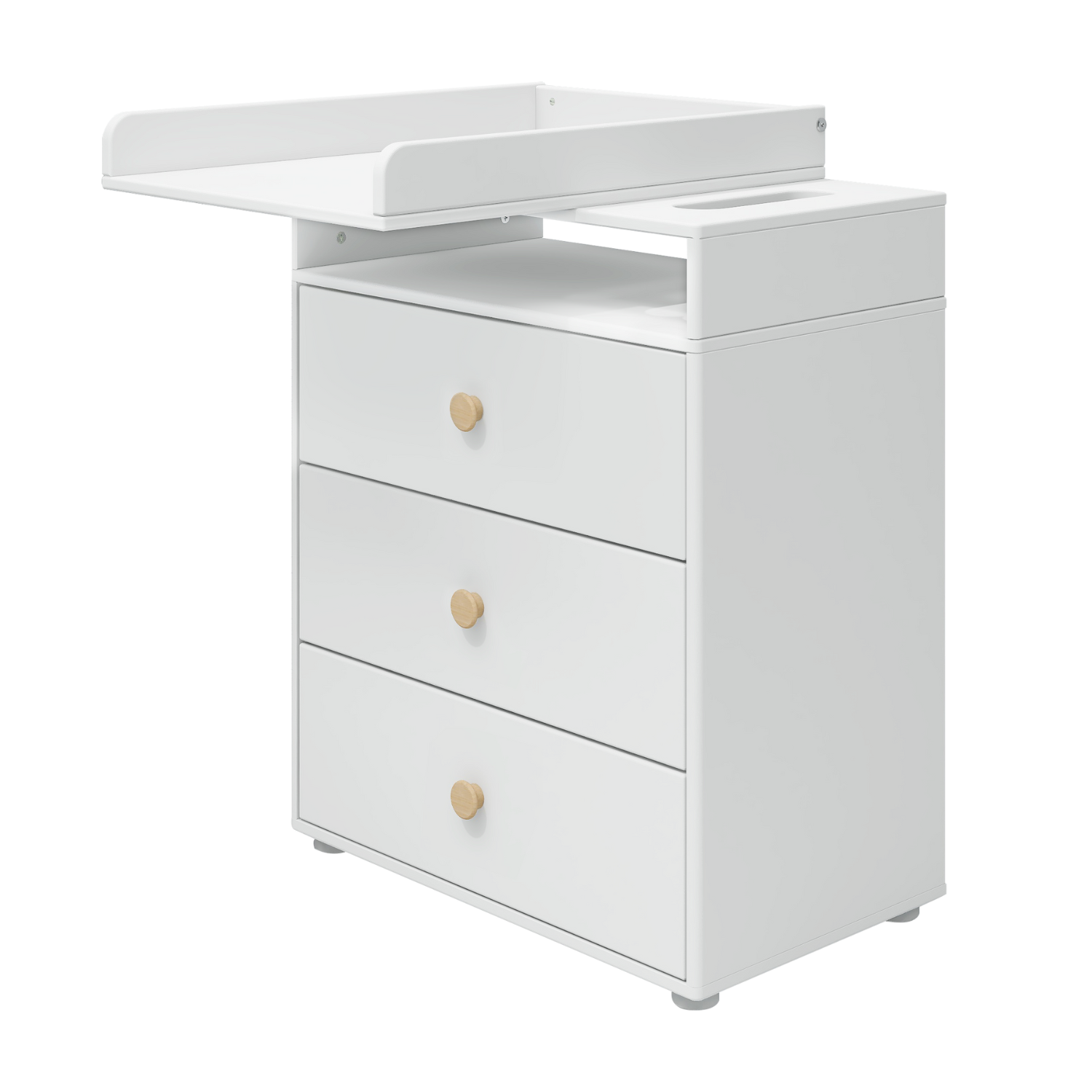 A well-functioning changing table is a must. The changing table itself should have a suitable height so that you can easily lean over your baby and maintain good eye contact. At the same time, it is practical with storage options right at the changing table, so there is room for everything from diapers to clothes, lotions and a small toy that your baby can enjoy while having his or her diaper changed. The changing table from our FLEXA Baby collection is available with drawers, shelves and cabinets so you can have the look and storage solutions that best suit your style and needs. The changing unit itself can be rotated to take up less space when not used and can be altogether removed so that the changing table can be used as an ordinary storage piece. A practical hole in the changing table provides easy access to water and other essentials that should be kept out of your curious baby’s reach, but still easy for you to grab when you are changing your baby’s diaper. For the changing table we have a soft changing mat in a cute design and available in two different colours for a boy or girl.