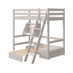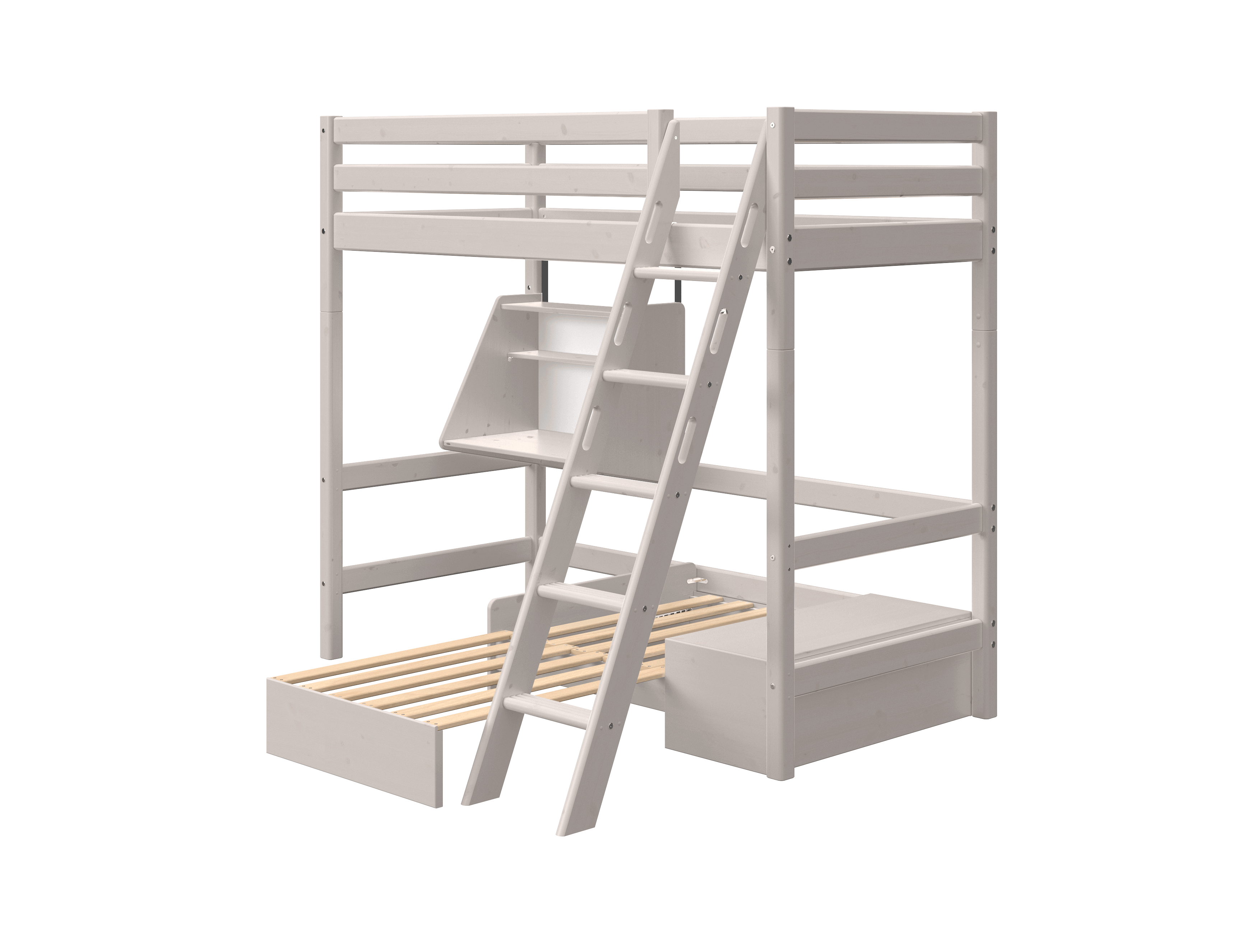 CLASSIC casa high bed with integrated sleeping module and click-on desk. The perfect bed for the teens, who needs extra space underneath the bed for a desk and room for sleepovers. The bed has straight ladder with anti-slip steps and interated handles. The safety rail is availabe in four colours. The bed is made of solid pinewood. Reccomended age: From the age of 8 years.
