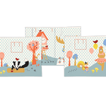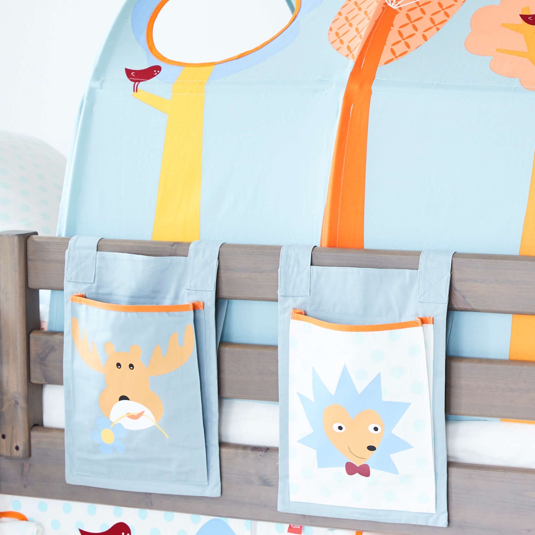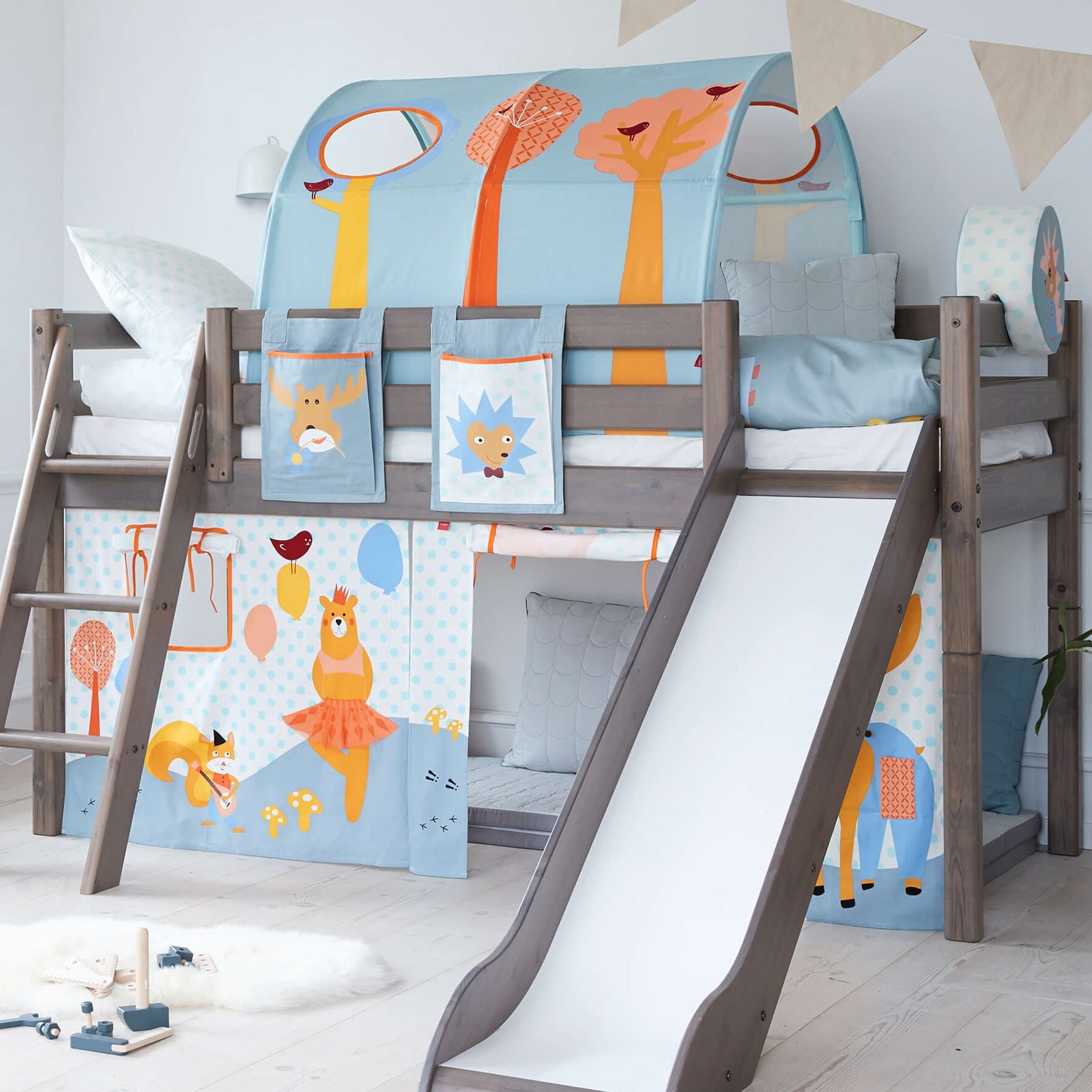 Forest play curtain with print of Nordic animals in Scandinavian colour scale. A guitar-playing fox, a gardening moose and a dancing bear are ready to take you on a picnic in the forest. The play curtain has a door opening, windows with curtains and a clock. The play curtain attaches to the bed with velcro. Matches all mid-high beds and semi-high beds. For use on the semi-high beds, should the extensions be added.