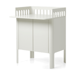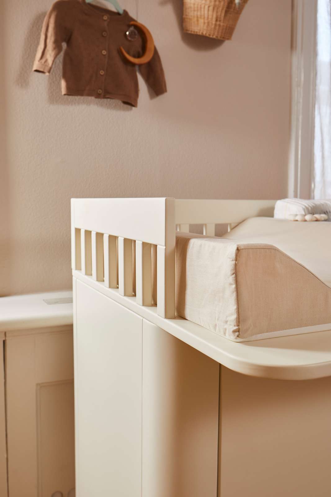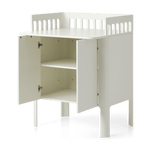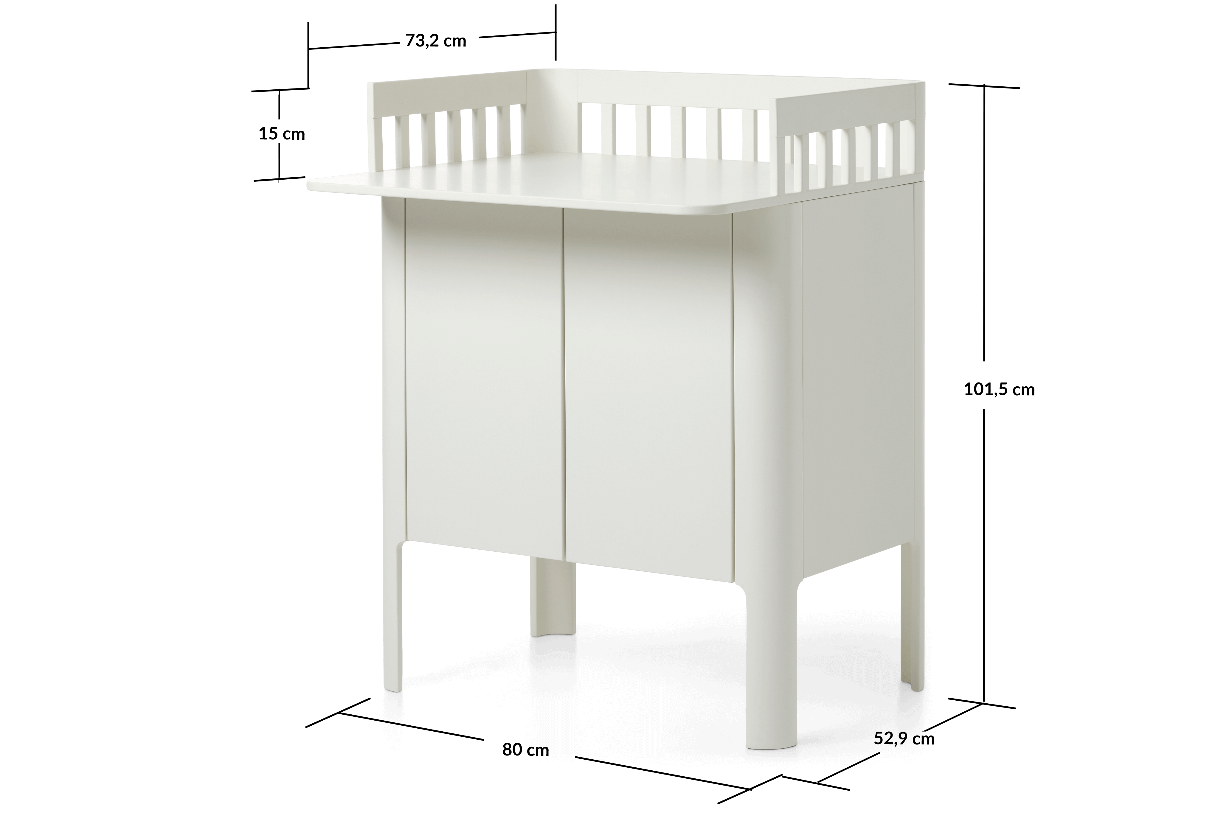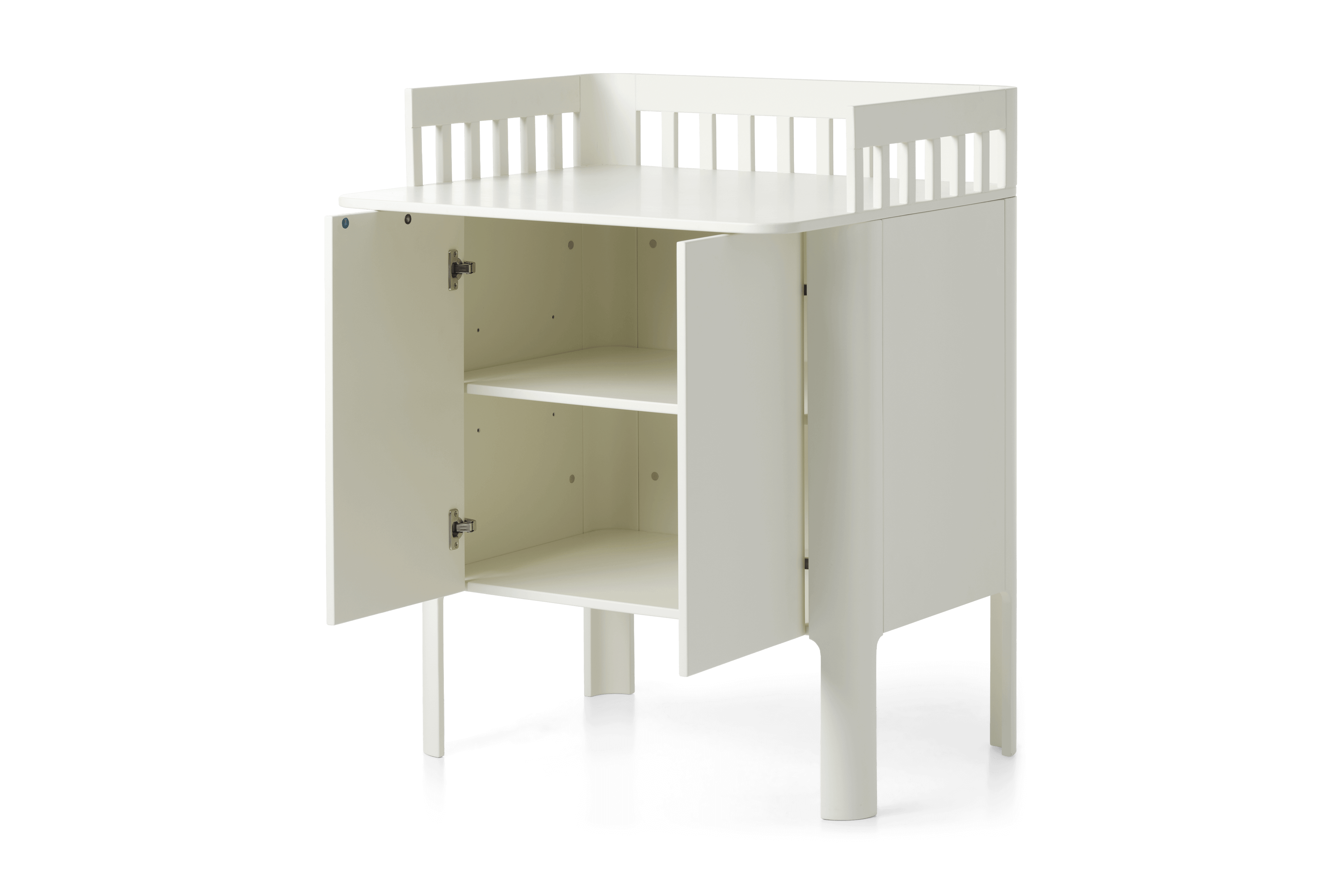 La surface à langer de grande taille vous permet de garder à portée de main le matelas à langer de votre enfant ainsi que les objets essentiels tels que les couches, les lingettes et les vêtements. Juste en dessous du plateau de table, vous trouverez un compartiment de rangement spacieux avec une étagère réglable en hauteur et des portes pratiques qui s'ouvrent d'une simple pression.