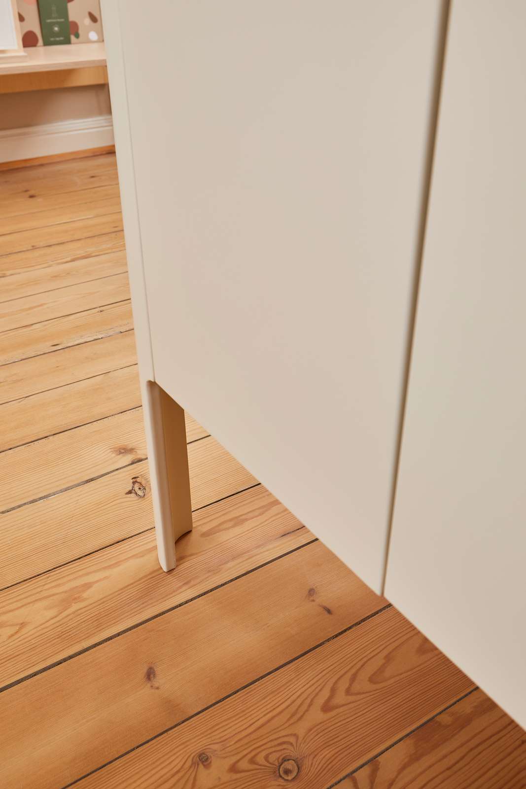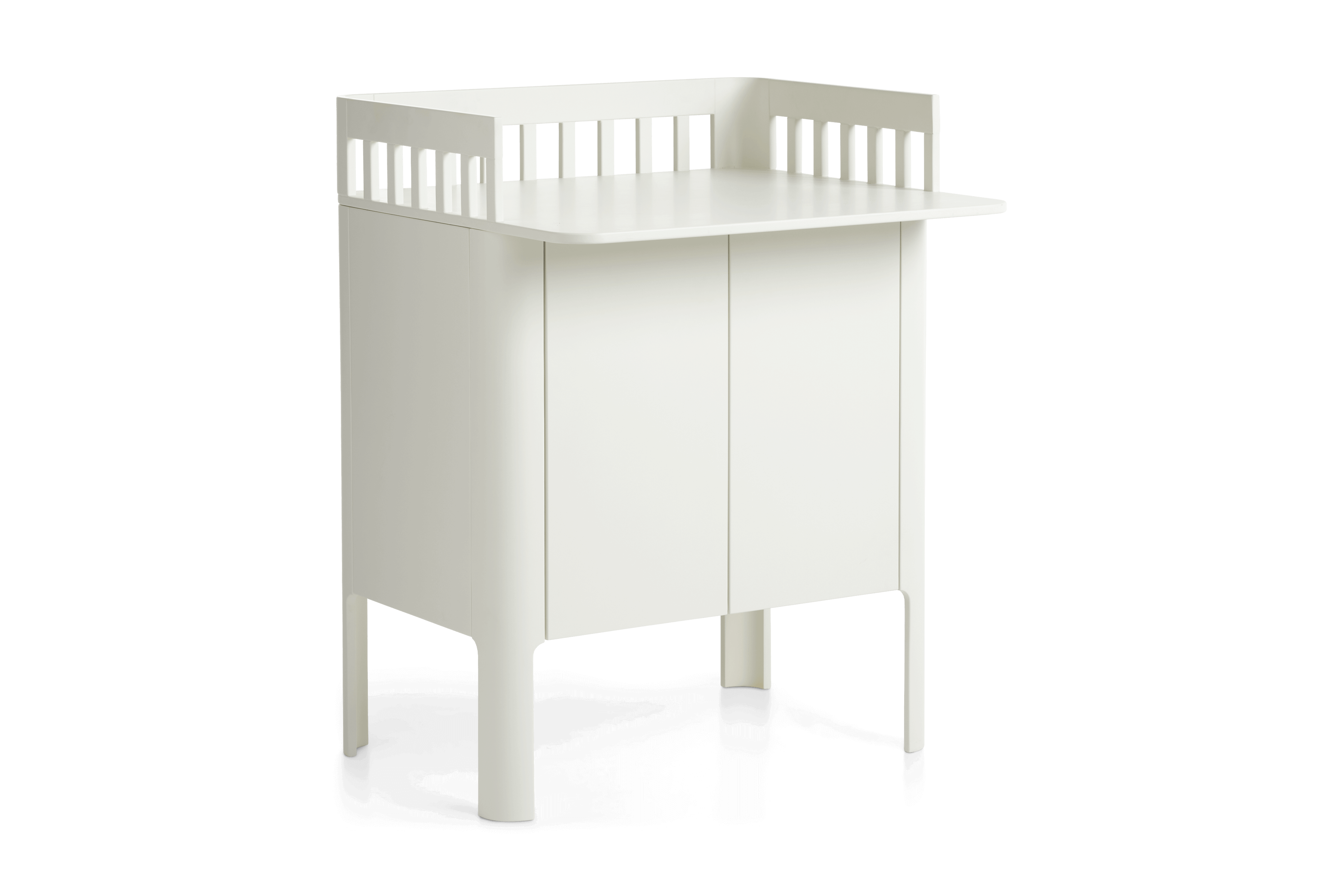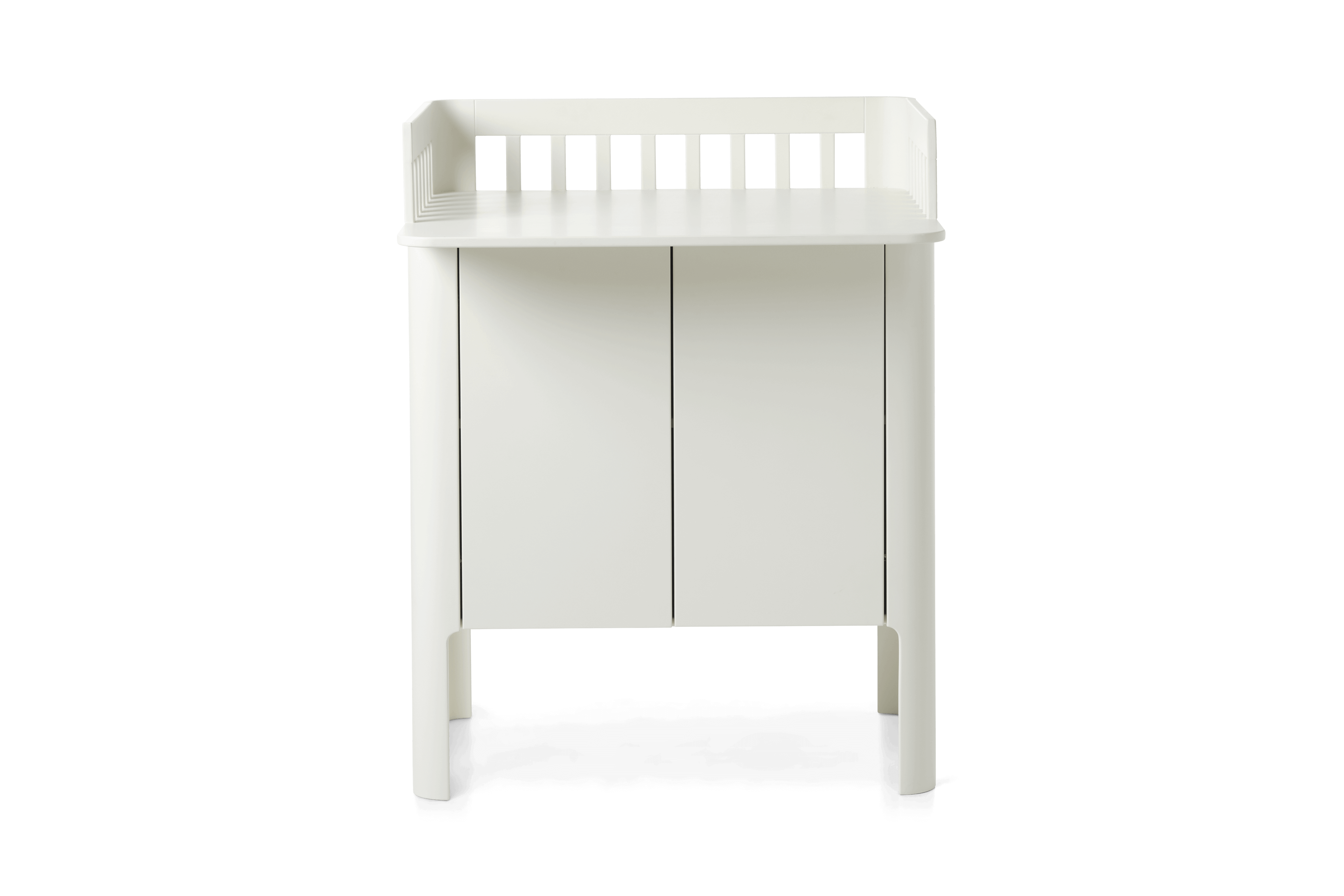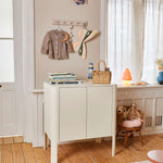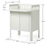 La surface à langer de grande taille vous permet de garder à portée de main le matelas à langer de votre enfant ainsi que les objets essentiels tels que les couches, les lingettes et les vêtements. Juste en dessous du plateau de table, vous trouverez un compartiment de rangement spacieux avec une étagère réglable en hauteur et des portes pratiques qui s'ouvrent d'une simple pression.