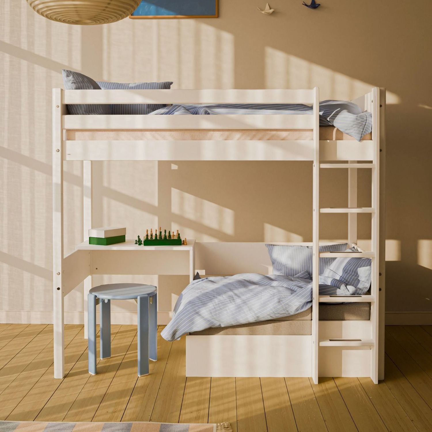 Bureaus voor hoge bedden zijn zo ontworpen dat ze gemakkelijk aan het hoge bed kunnen worden toegevoegd. Hetzij door een eenvoudige constructie, hetzij door op het bureau te klikken. Dit maakt het gemakkelijk om aan elk bed toe te voegen, zelfs als het bed al gebouwd is. Onze kinderhoogsligbedden met bureau zijn verkrijgbaar in de collecties WHITE, NOR en CLASSIC.