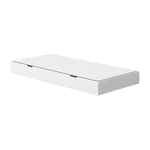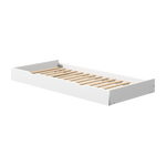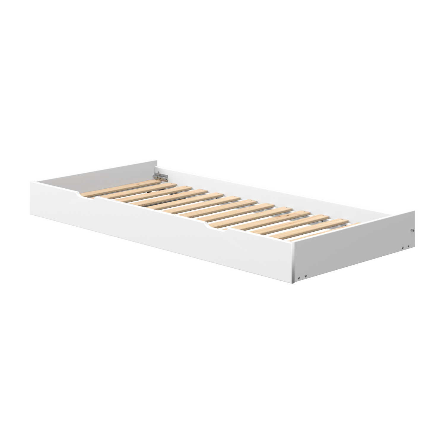 White/Nor uitschuifbaar bed met ingebouwde lattenbodem, uitklapbare poten en zachte rubberen wielen. Het uitschuifbare bed past onder het White en Nor lage bed en is perfect voor logeerpartijtjes. Het bed is gemaakt van massief grenenhout.