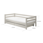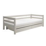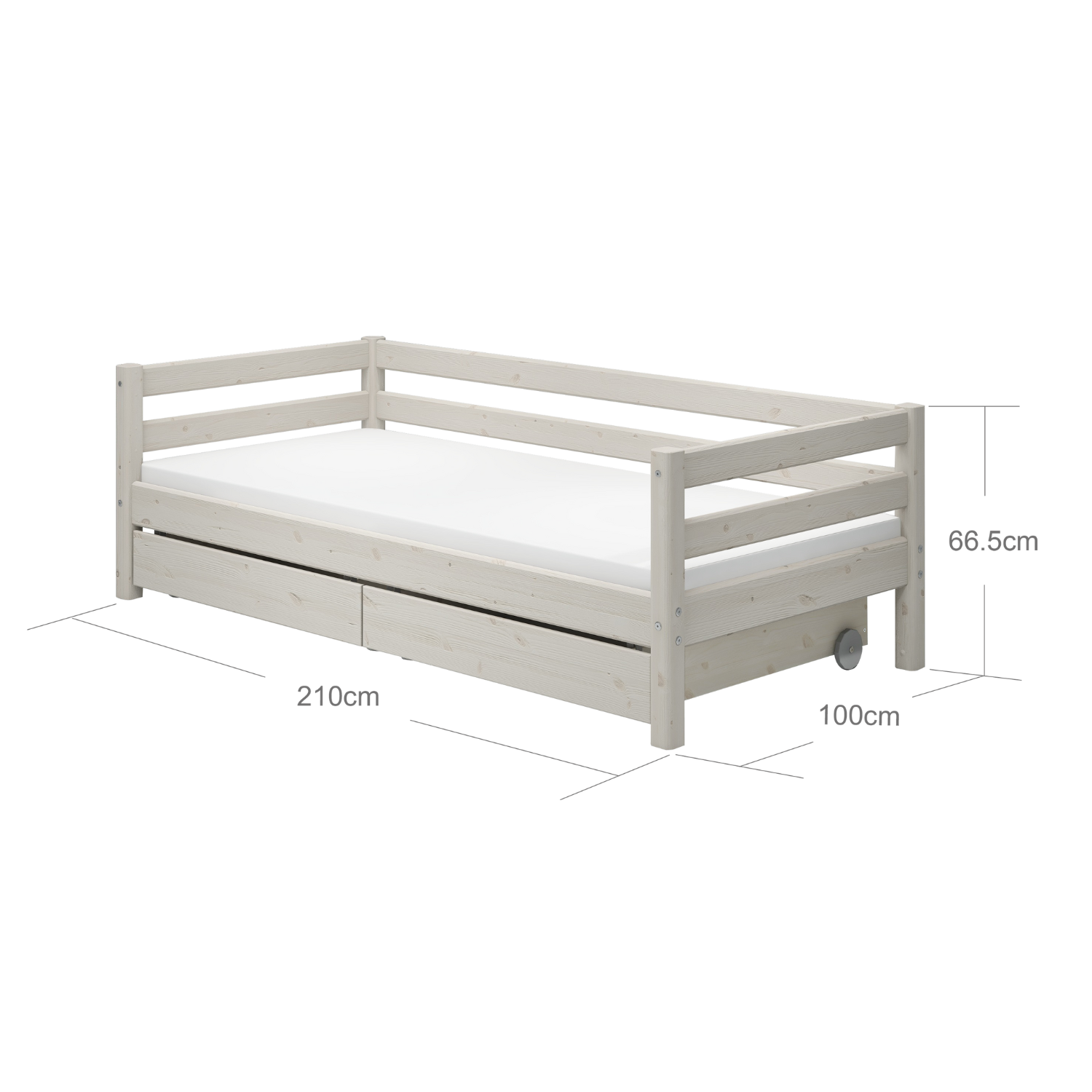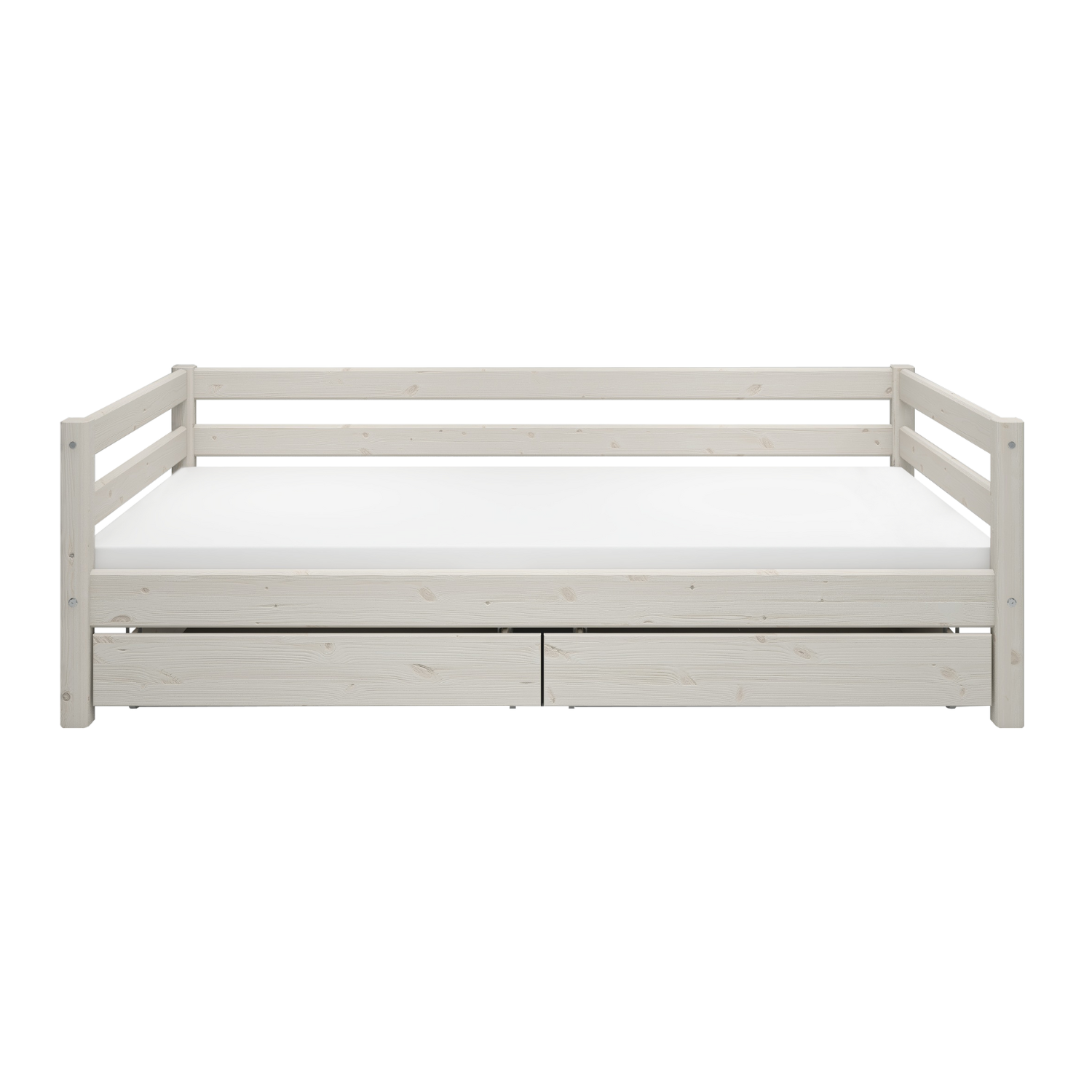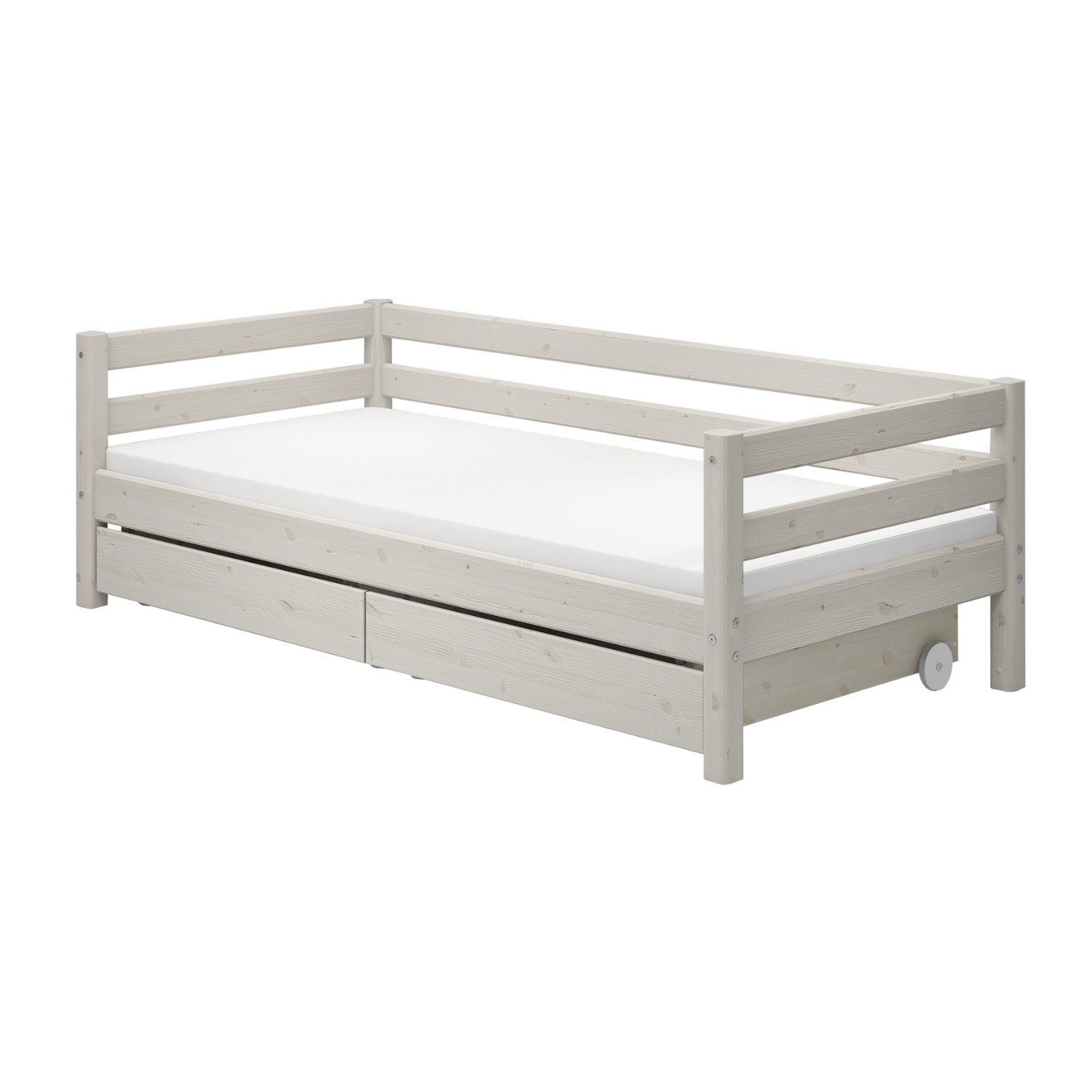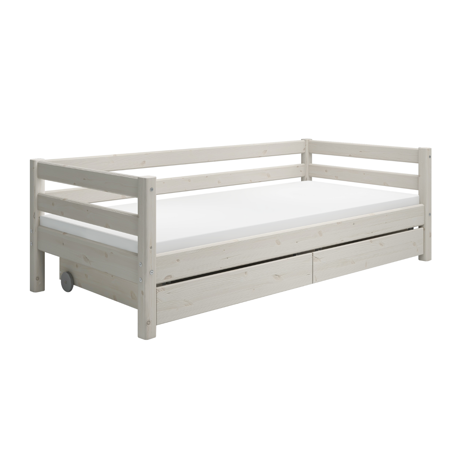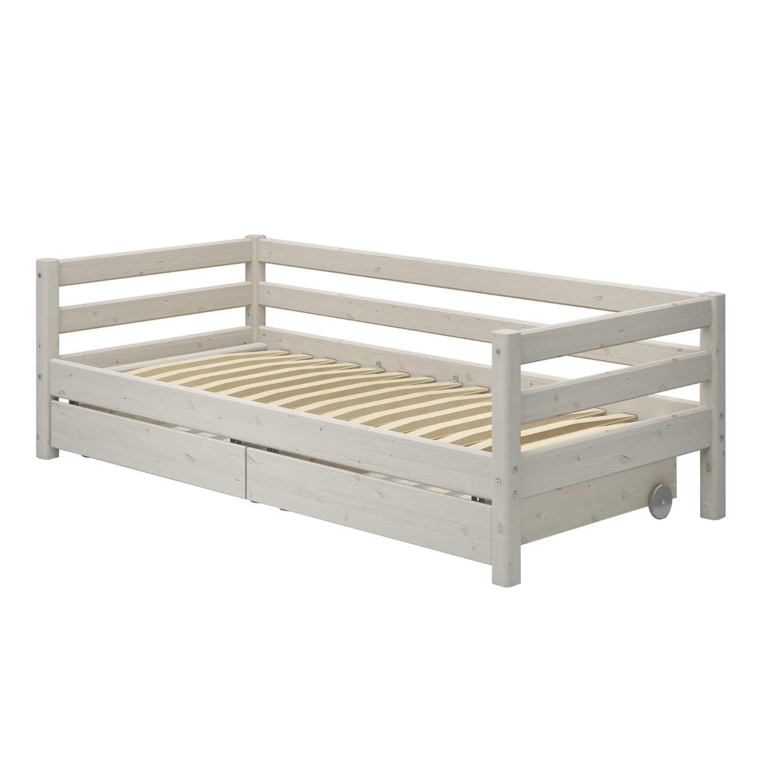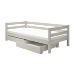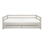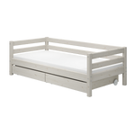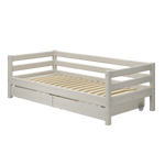 CLASSIC bed met rugleuning en hoofd- en voeteneinde. Dit bed kan ook gebruikt worden als bank. Het bed heeft een klassiek Scandinavisch design en is beschikbaar in drie kleuren. In de lades onder het bed kun je beddengoed of speelgoed opbergen.